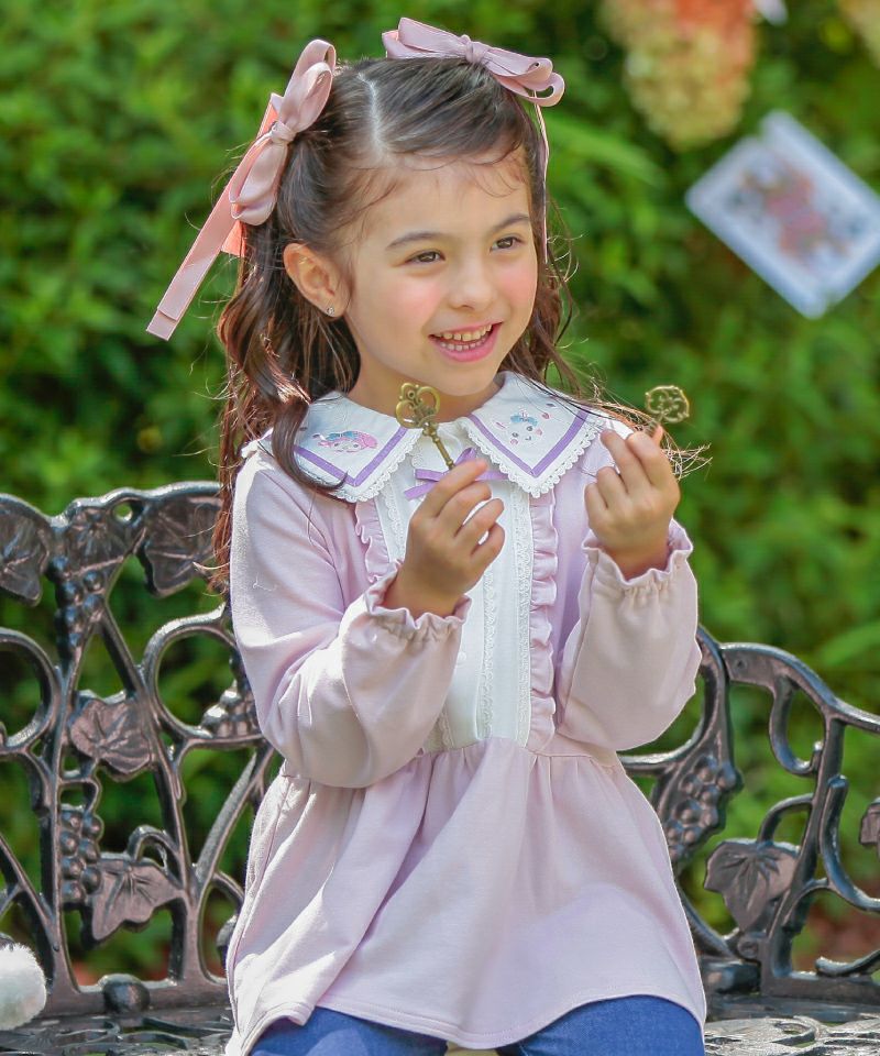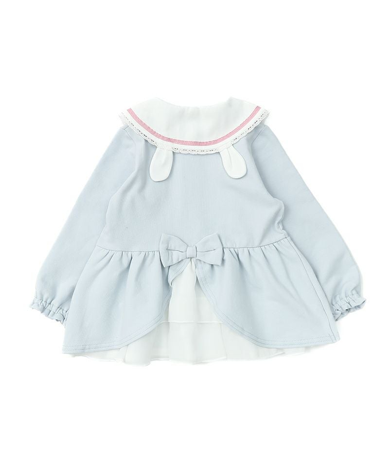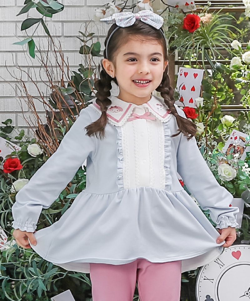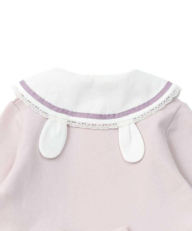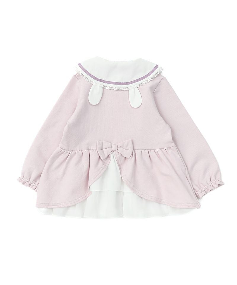 うさみみ襟にバックフリルデザインが夢のようにかわいいプルオーバー。肌触りの良いストレッチミニ裏毛素材が着やすく襟にはうさぎちゃんとマイメロディにトランプのマークをちりばめたアリス風刺繍が可愛さ満点なアイテムです。