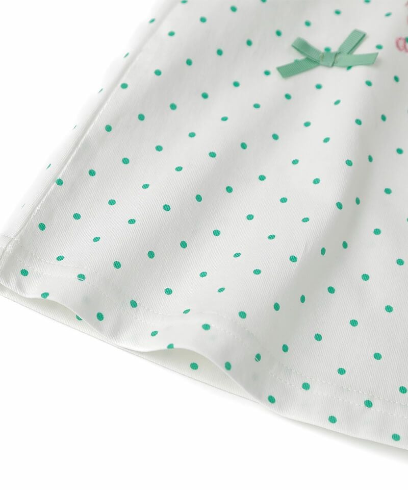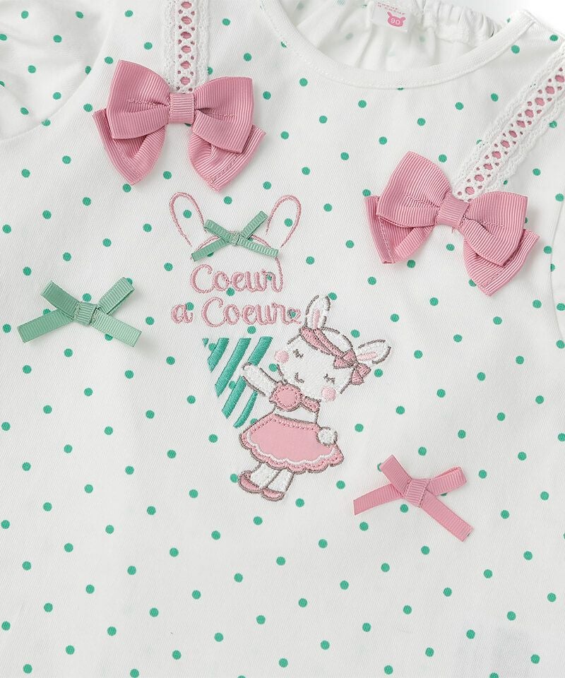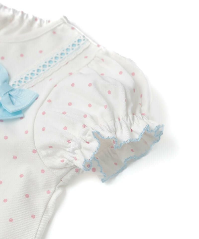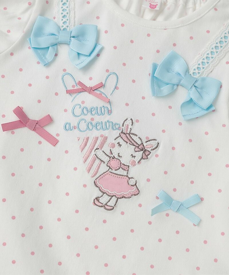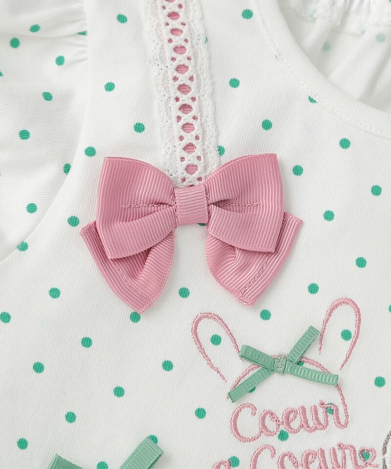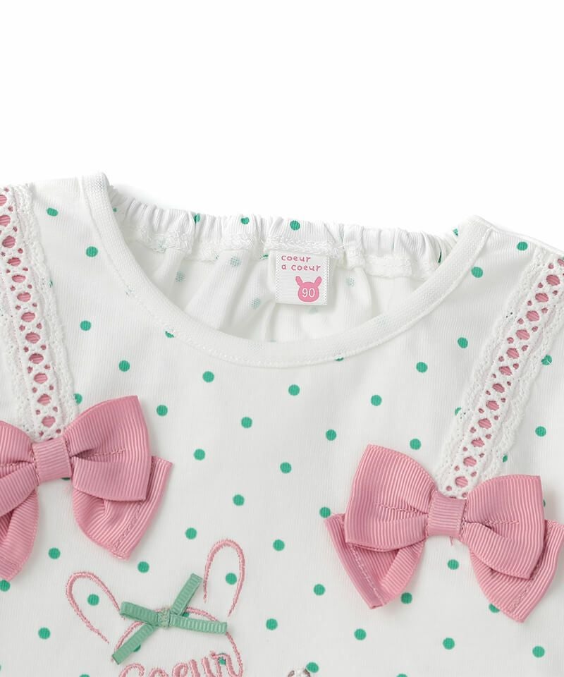 うさぎちゃんとうさみみアイスクリームロゴのアップリケがラブリーな半袖Tシャツ。やわらかなコットン天竺素材でデイリー使いにぴったりな着心地の良さも魅力的。ドット柄にリボントやレースのアクセントが華やかなデザインなので、シンプルなボトムスでもコーディネートがキュートに決まります♪後ろネックはゴム仕様で着脱もカンタン。
