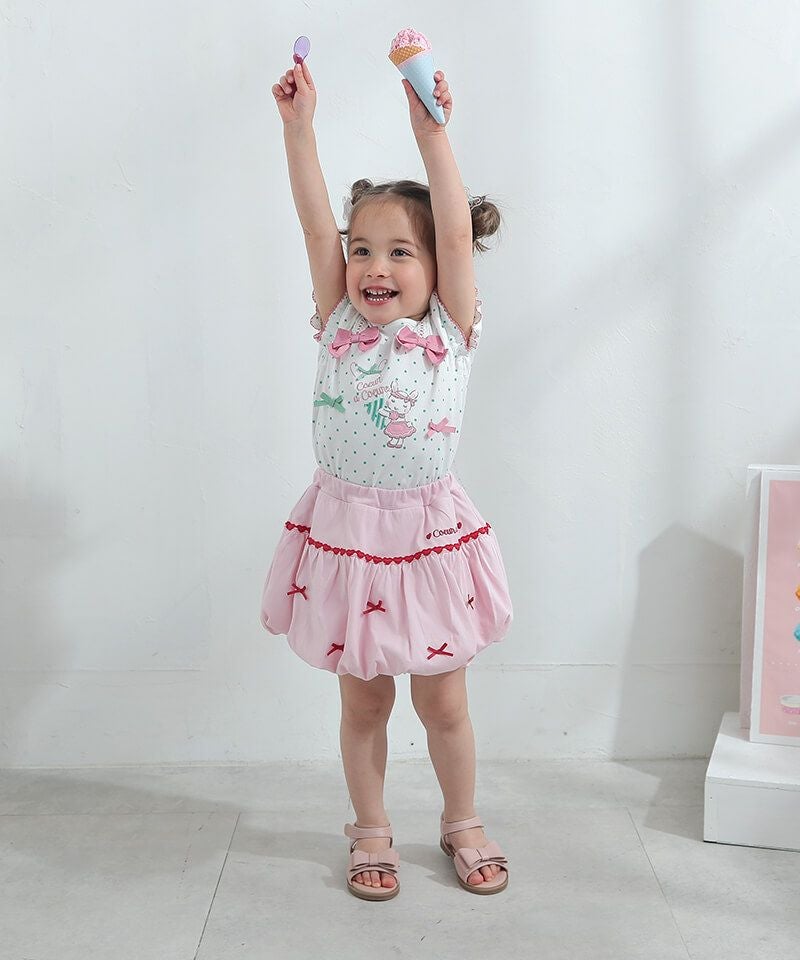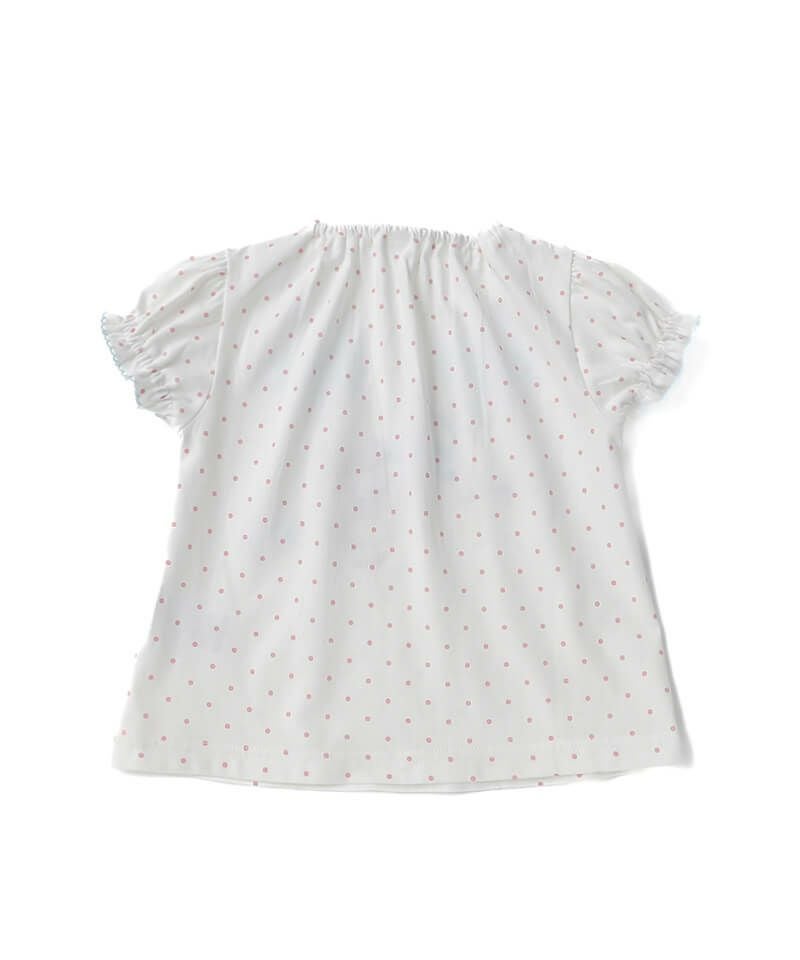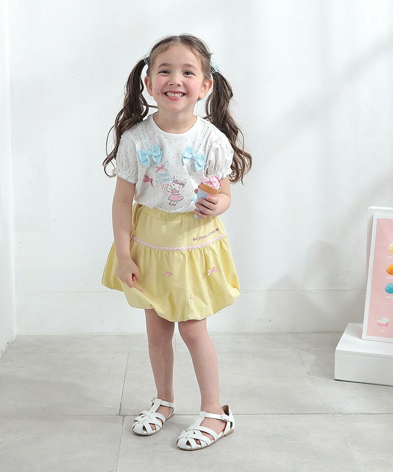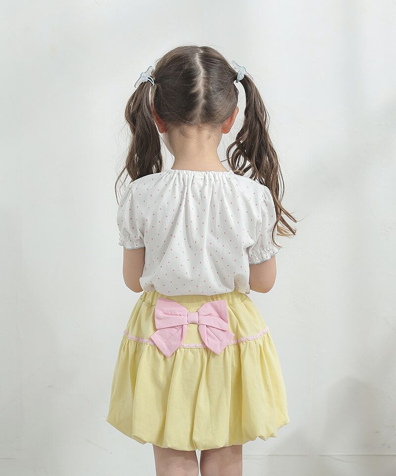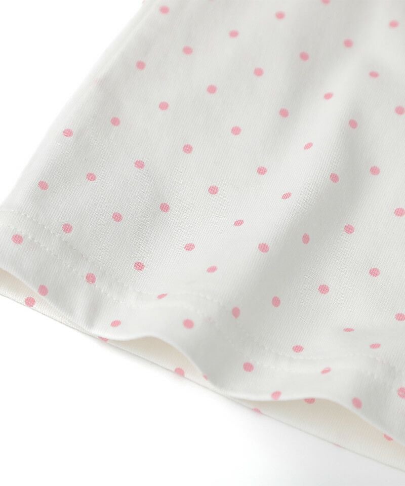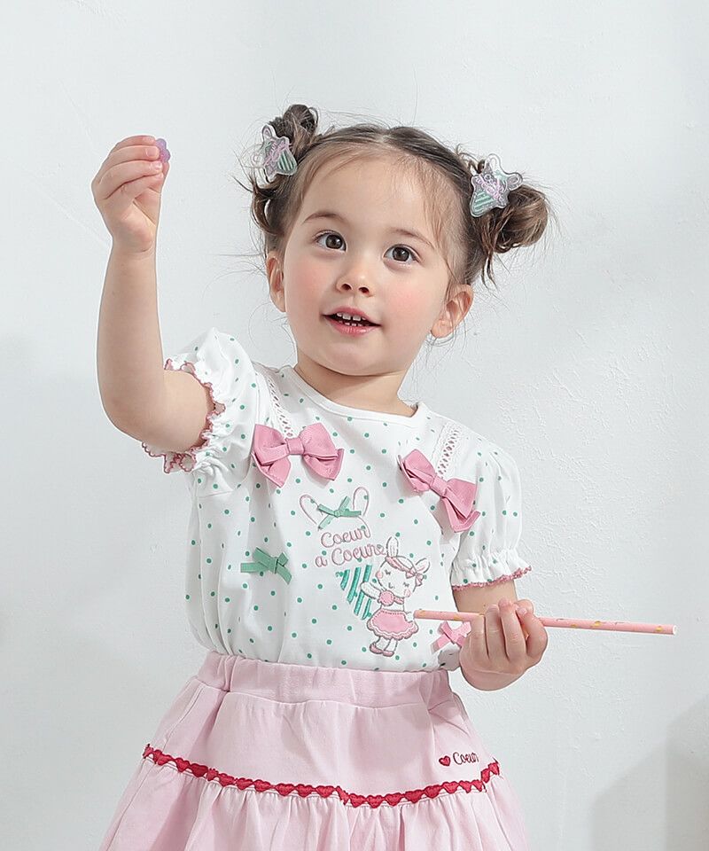 うさぎちゃんとうさみみアイスクリームロゴのアップリケがラブリーな半袖Tシャツ。やわらかなコットン天竺素材でデイリー使いにぴったりな着心地の良さも魅力的。ドット柄にリボントやレースのアクセントが華やかなデザインなので、シンプルなボトムスでもコーディネートがキュートに決まります♪後ろネックはゴム仕様で着脱もカンタン。
