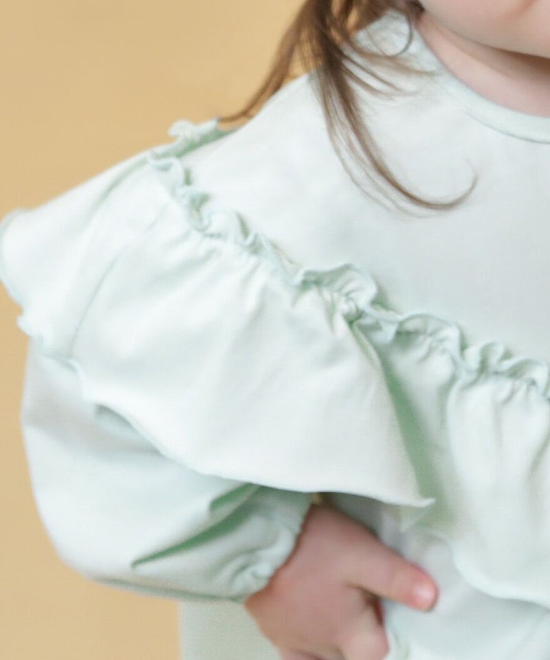 フリルのふんわり感が可愛いロマンティックブラウス風Tシャツです。パンツはもちろん、ジャンバースカートなどのインナーとして使用して頂くと可愛いアイテムです。