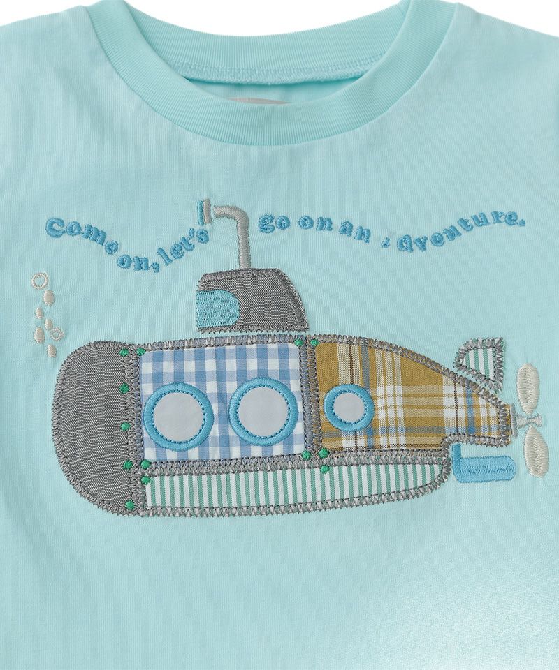 丸いフォルムが可愛い潜水艦をパッチワーク☆ピリッと色を効かせた細かな刺繍も素敵です☆爽やかな配色の色合わせなので可愛らしさの中にも上品さや爽やかさがあるアイテムです☆ボトムを選ばないベーシックなシルエットに仕上げています。