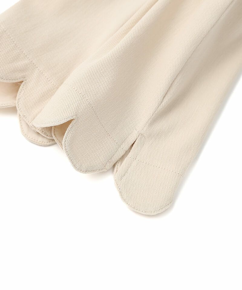 裾のスカラップが可愛い7分丈パンツです。ストレッチを効かせた柔らかなニットツイル素材で動きやすく、総ゴムのウエスト仕様で着脱も簡単。どんなトップスともコーディネートもしやすくデイリーユースにもおすすめです。前両側と後ろにポケット付き。