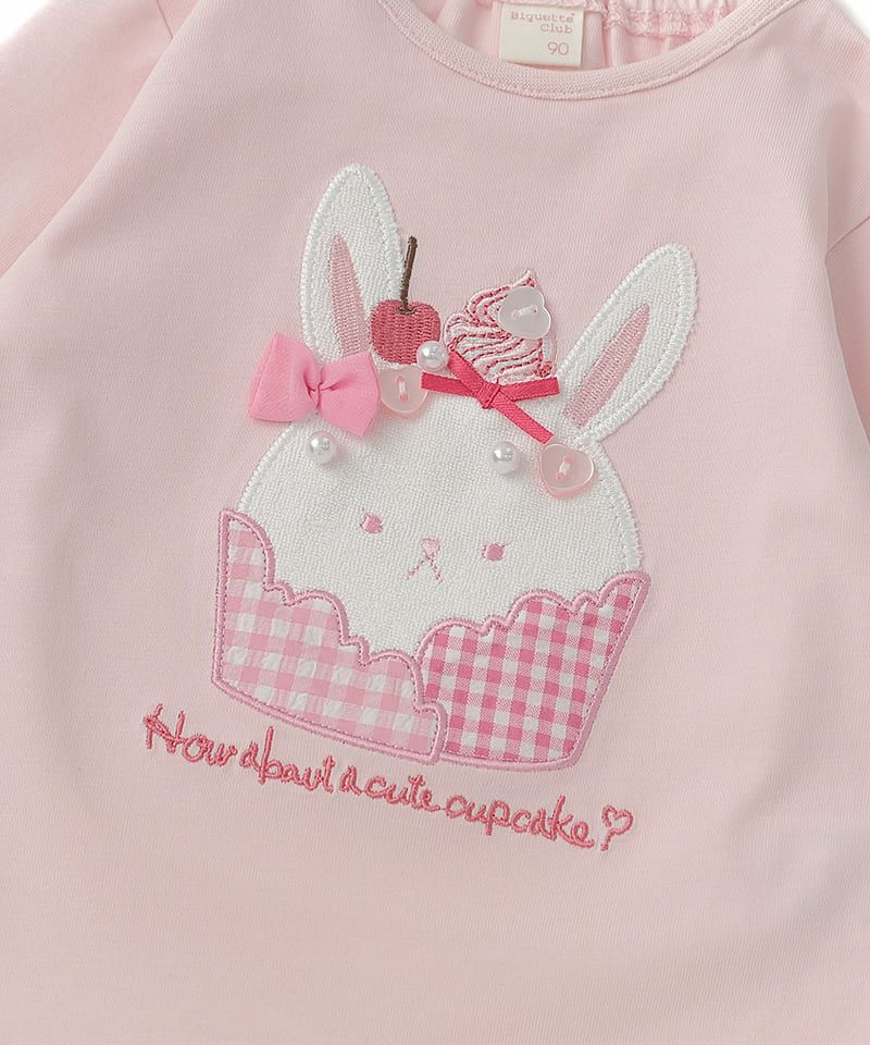 おしゃれしたカップケーキ刺繍がとっても可愛いTシャツ♪春らしいマカロンカラーとスカラップの組み合わせもスイーツみたいで素敵♪程良いAラインシルエットなのでコーディネートしやすいところも魅力です!