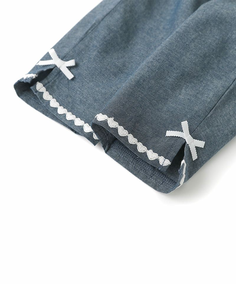 さりげないマリンムードが可愛い7分丈パンツです。ダンガリーの優しい生地感に釦やレース、ポケットなどハートを効かせたガーリーなパンツで、ふんわりこだわりトップスからシンプルな細見のトップスまで様々な着こなしを楽しんでいただけるアイテムです♪