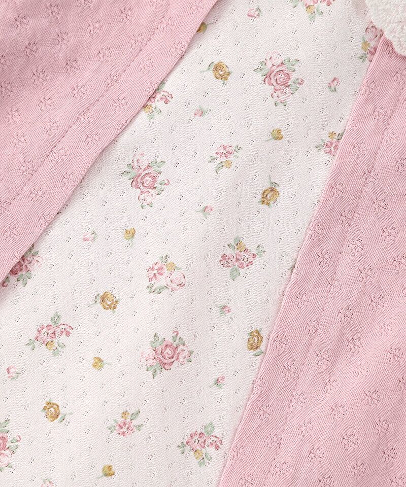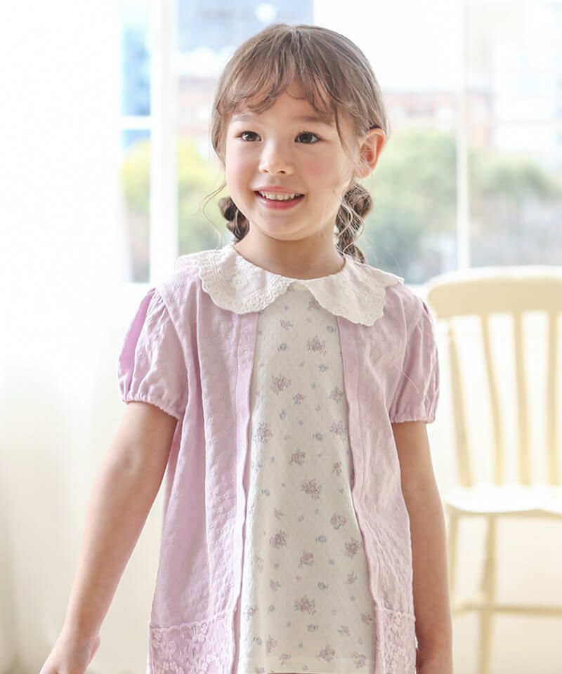 カーディガンをレイヤードしたようなおしゃれなスタイルがこれ1枚で完成するプルオーバー。パフスリーブに繊細なレース襟や花柄など、ガーリーな要素が満載です。素材は涼しげでやわらかなジャガード編みの天竺を使用し、ビケットクラブらしい1枚に仕上げました。ゴム仕様の後ろネックで着脱もスムーズです。