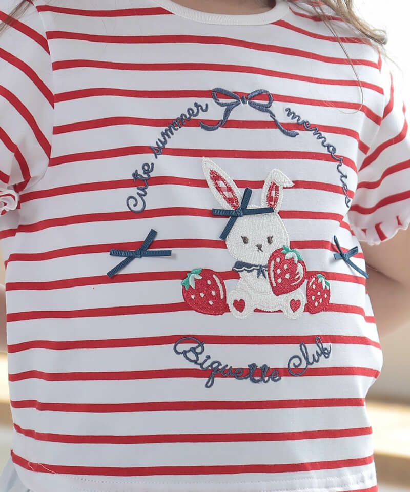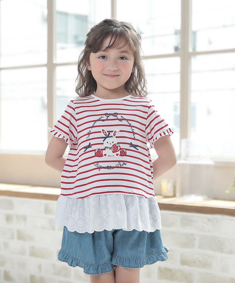 ふんわりカラーのガーリーなうさぎちゃんとマリンなうさぎちゃんが夏らしいボーダー柄☆ホワイトのギャザーレースがとっても涼し気です。スリムボトムやショートパンツと相性がよく、パンツコーデをガーリーに楽しめるアイテムです。