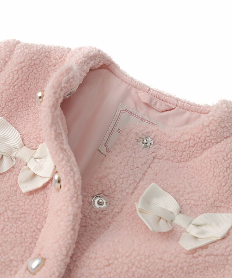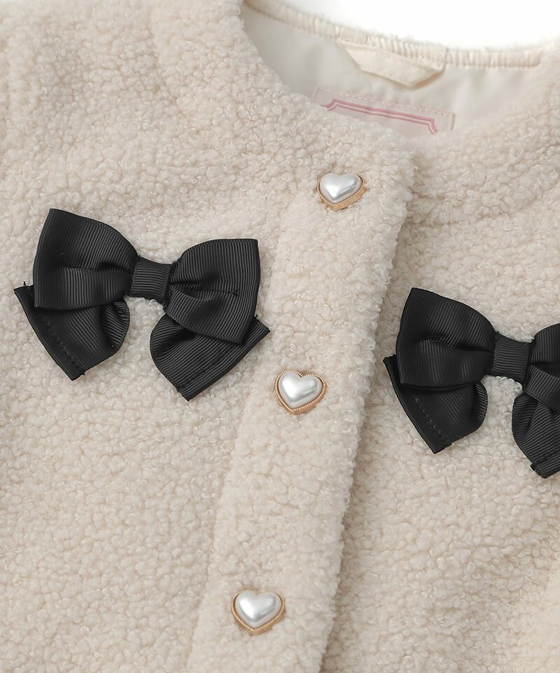 リボンのあしらいや、アンティークムードのあるハート釦がとっても素敵なポイントに♪パンツスタイルからスカート、ワンピースまで幅広いコーディネートを楽しんでいただけるアイテムです。さっと羽織ることのできるノーカラージャケットは登場回数にも期待♪