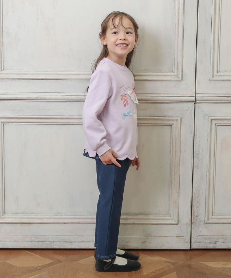 バックの2段フリルがガーリーな印象のロングパンツ。フロントポケットの下にあしらったチェリー刺しゅうが甘さをより引き立てる可愛らしいポイントです。ストレッチ入りのデニム生地を採用し裏面を微起毛することで暖かく寒い日の定番ボトムにもおすすめ。両サイドにポケット付きです。
