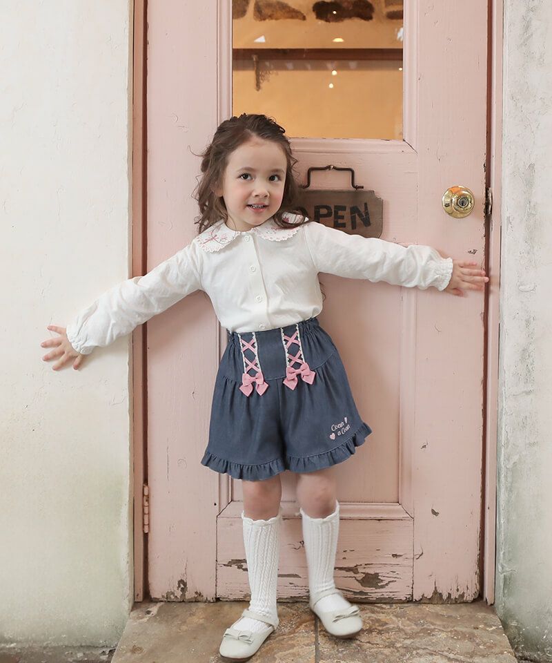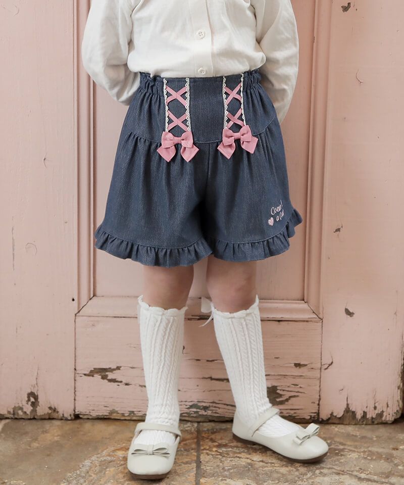 ソフトな肌触りでストレッチ入りのデニムニット素材を採用した、動きやすく履き心地の良いキュロットです。フロントにあしらったレースアップや裾フリルのデザインで女の子らしい可愛さいっぱいに仕上げました。トップスをインしてレースアップを見せたスタイルもキュートな印象に決まります。