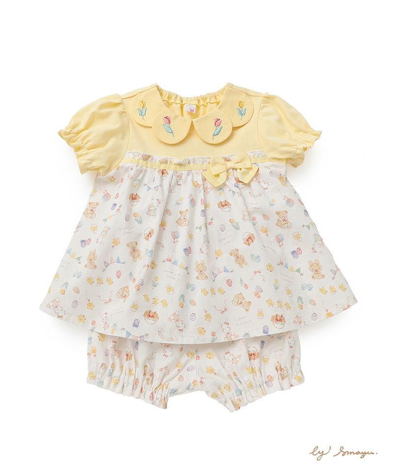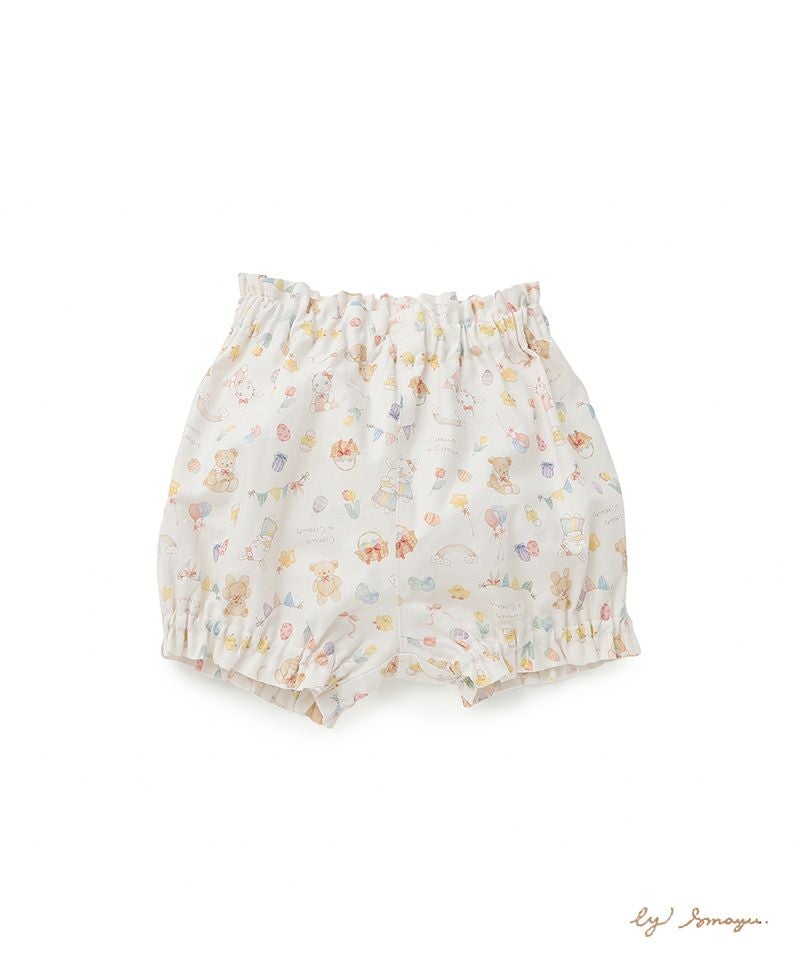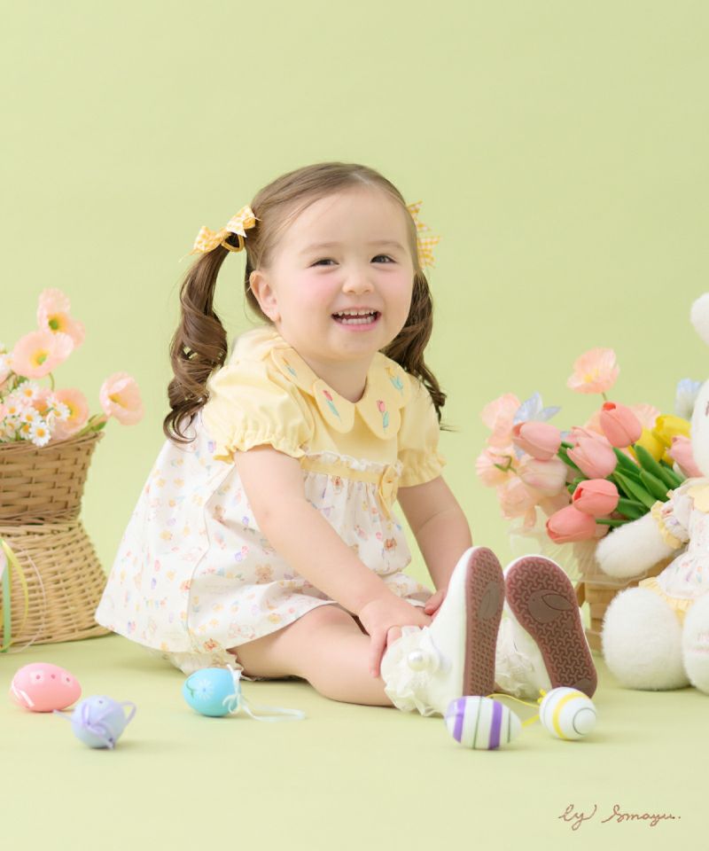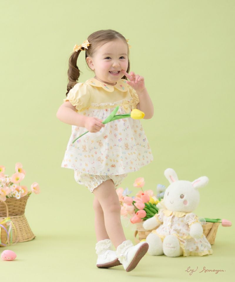 人気イラストレーター想馬まゆさんとの特別なコラボレーションからセットアップが登場。今回のために描きおろされたうさぎちゃんやくまさん、たまごなど、イースターの世界観を春らしい優しいタッチで表現し、特別感あふれるデザインに仕上げました。また、パフスリーブやリボンで可愛らしさをさらにプラス。同柄のブルマはふんわりシルエットでベビーならではの愛らしさを引き立てます。春のおでかけはもちろん、ギフトにもおすすめなアイテムです。