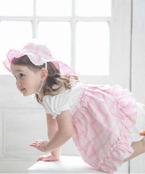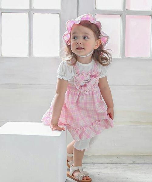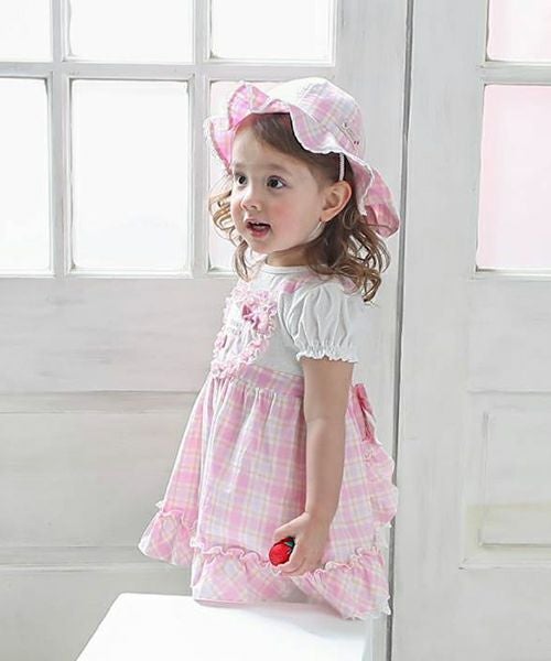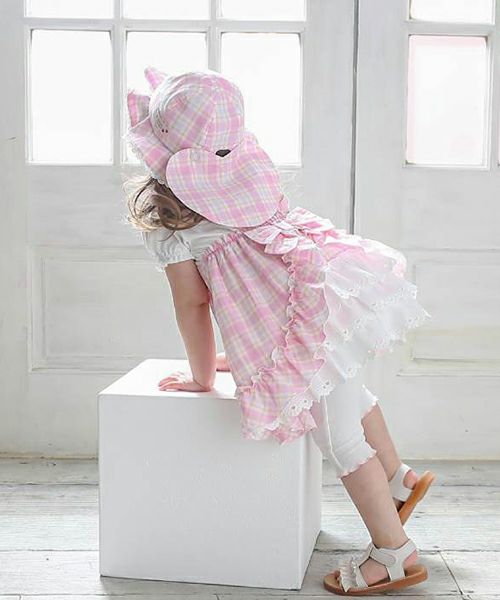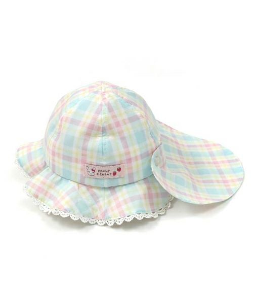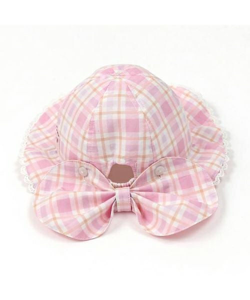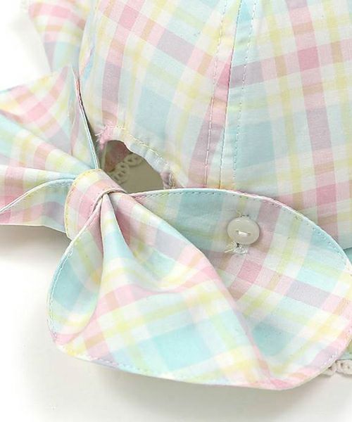 オリジナルチェックのパステルカラーが爽やかで夏にぴったりな帽子♪ハート型の日よけ部分はスナップボタンで留めればリボンに大変身♪取り外しができる3wayタイプです。あごひもつきで機能性も◎な夏の定番アイテム♪同じチェック柄のワンピースとのコーデがおすすめ!嬉しいお名前タグ付き!
