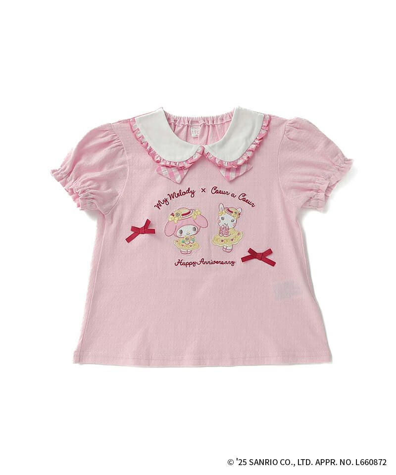 マイメロディの50周年を記念してうさぎちゃんと夢のコラボ♪お揃いワンピースでおめかししたマイメロディとうさぎちゃんのアップリケがとっても可愛い特別感あふれるTシャツです。ギンガムチェックをあしらったリボン風デザインの襟が女の子らしさを引き立てるポイント。肌触りの良いコットン素材のメッシュ天竺を採用し、夏も快適な着心地です。後ろネックはゴム仕様なのでお着替えもスムーズ。この夏のデイリーコーデやお出かけスタイルにもおすすめの1枚です。