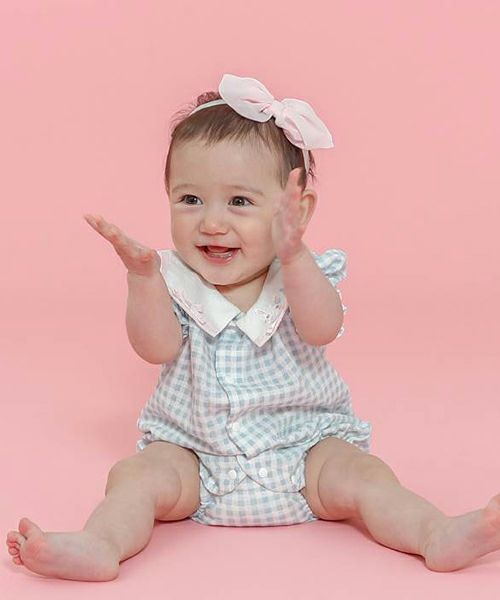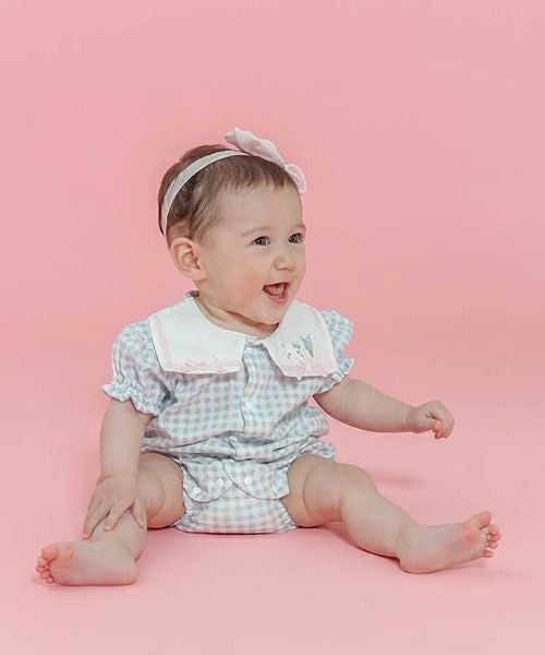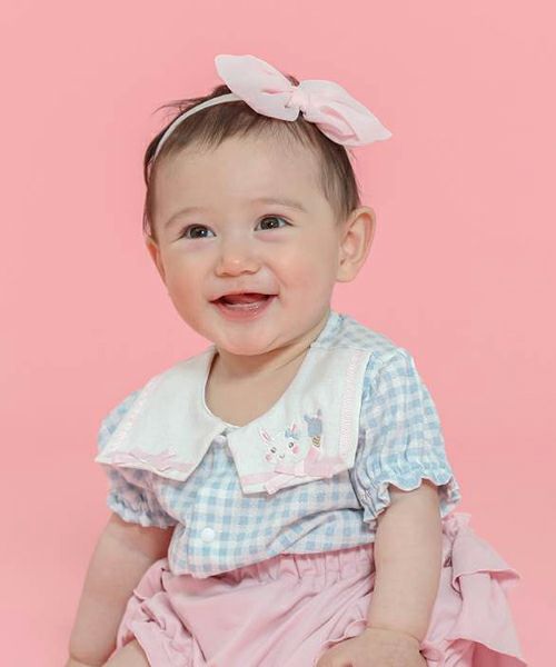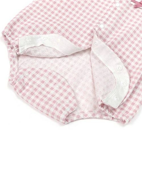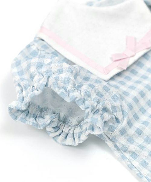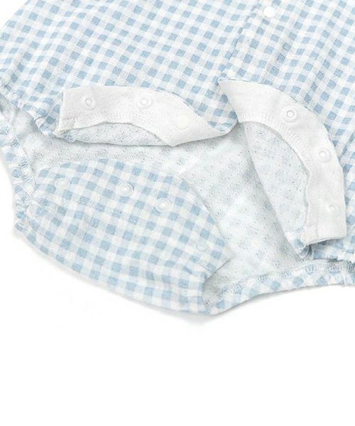 セーラーカラーがポイント!ギンガムチェックのボディシャツ♪メッシュ天竺素材なので通気性がよくサラサラでベビーに優しい着心地。1枚でも、フリルパンツ(44252-231b)と合わせて夏のおでかけにもおすすめ♪同じギンガムチェック柄のタンクトップ(44201-231b)でお姉ちゃんとのリンクコーデもできちゃいます♪お着替えしやすい前あき仕様です♪
