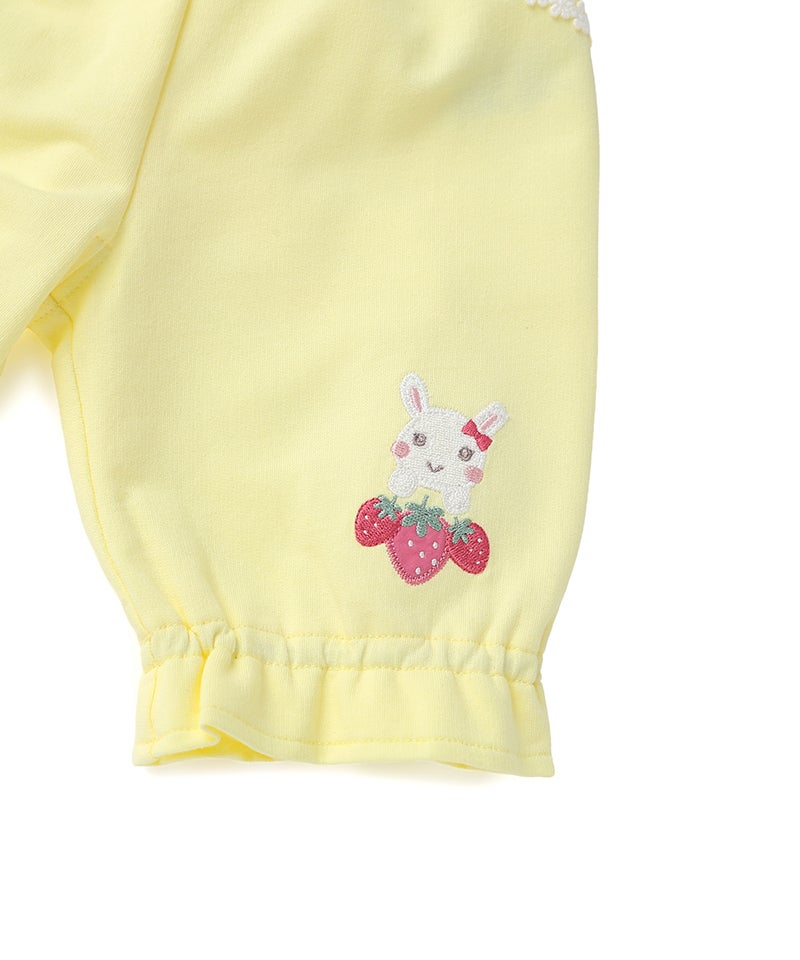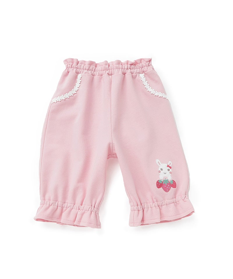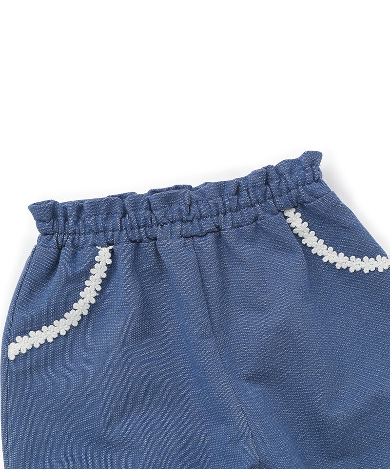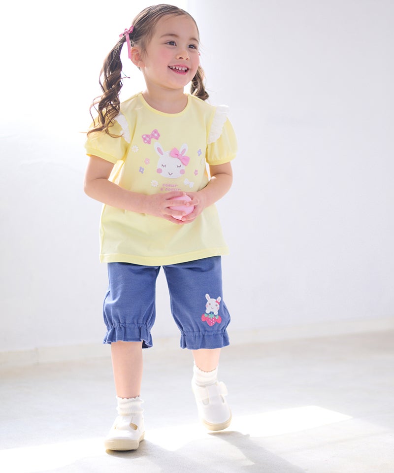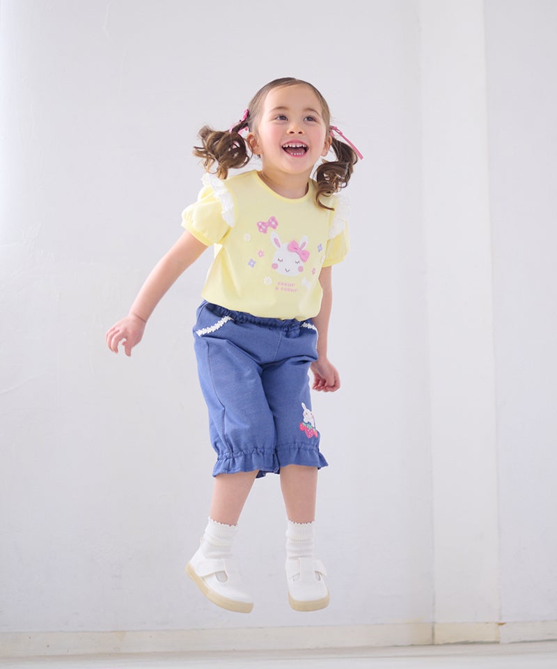 毎日がときめくかわいいデイリー服♪ふんわりギャザーが愛らしく、柔らかなカットソーで着心地も良いパンツです。お花レースやうさぎちゃんのアップ刺繍があしらわれたパンツなら、可愛い好きのキッズも喜んでくれるかな♪新色のやさしいイエローが登場してコーディネートも楽しくなりました♪