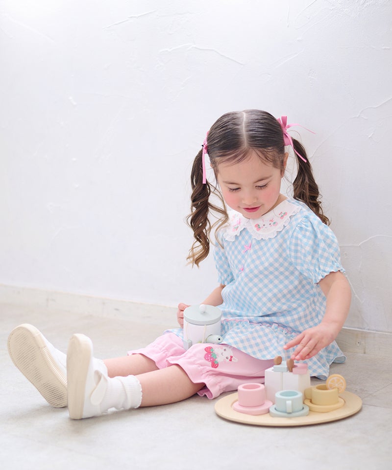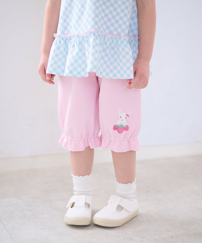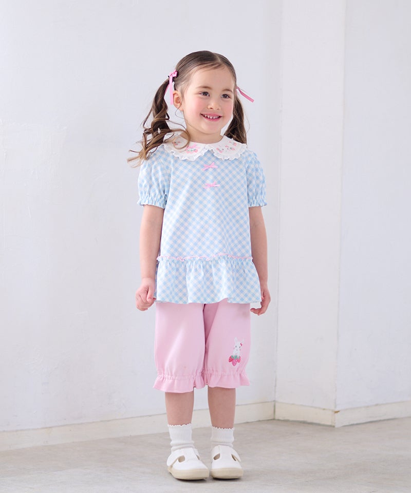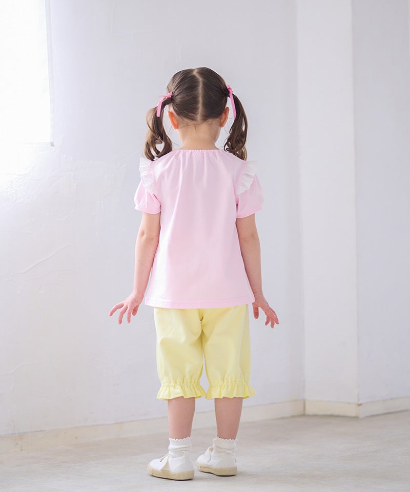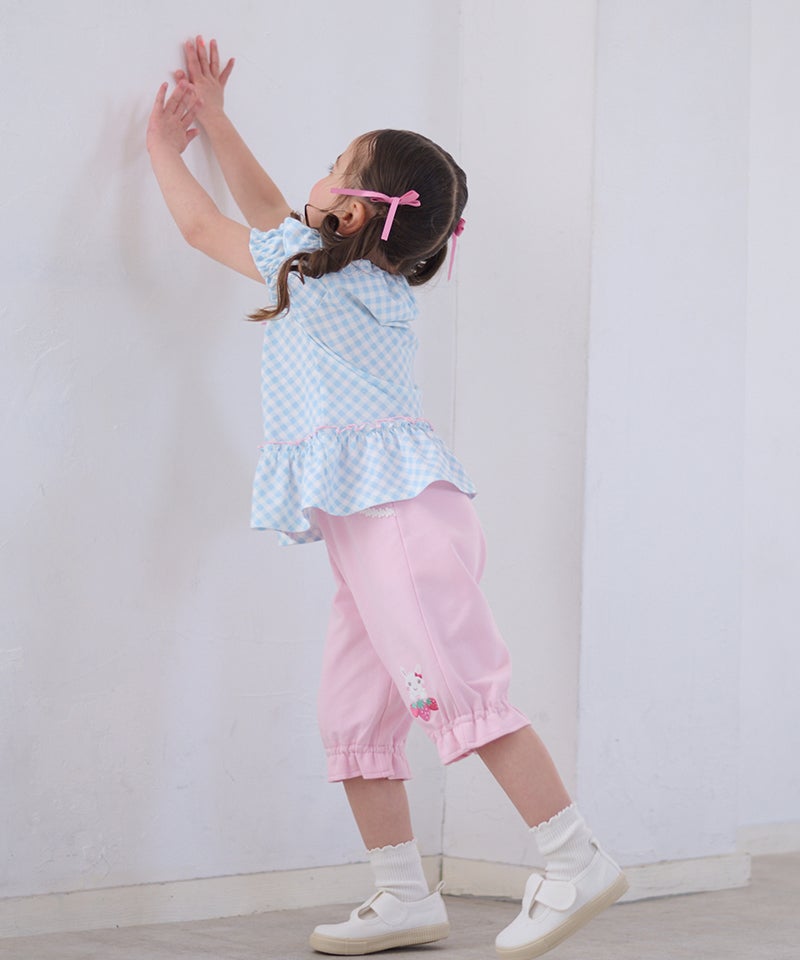 毎日がときめくかわいいデイリー服♪ふんわりギャザーが愛らしく、柔らかなカットソーで着心地も良いパンツです。お花レースやうさぎちゃんのアップ刺繍があしらわれたパンツなら、可愛い好きのキッズも喜んでくれるかな♪新色のやさしいイエローが登場してコーディネートも楽しくなりました♪