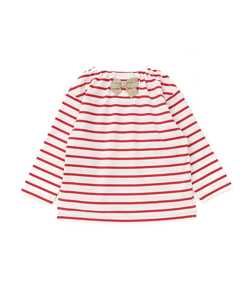 シンプルながらもスカラップネックが絶妙な存在感を演出してくれるTシャツです。レトロムード漂うカラーは今季のトレンドアイテムでもあり、パリジェンヌみたいなシンプルコーデがおすすめ♪スカラップカラーとバックリボンが子供らしい愛らしさも添えてくれる1枚です。