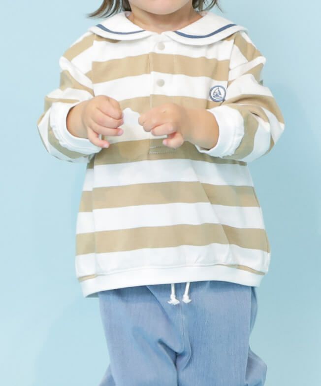 ■カラー展開:グレー/ネイビーブルー ※お名前タグ付き。 モデル身長:82cm / 着用サイズ:80size ※カラーの注文間違えがないようご注意下さい。 ※グレーの色味は、画像のようなベージュに近い色味になります。 ※画面上の色はブラウザや設定により、実物とは異なる場合がございます。ご了承の上ご注文下さい。