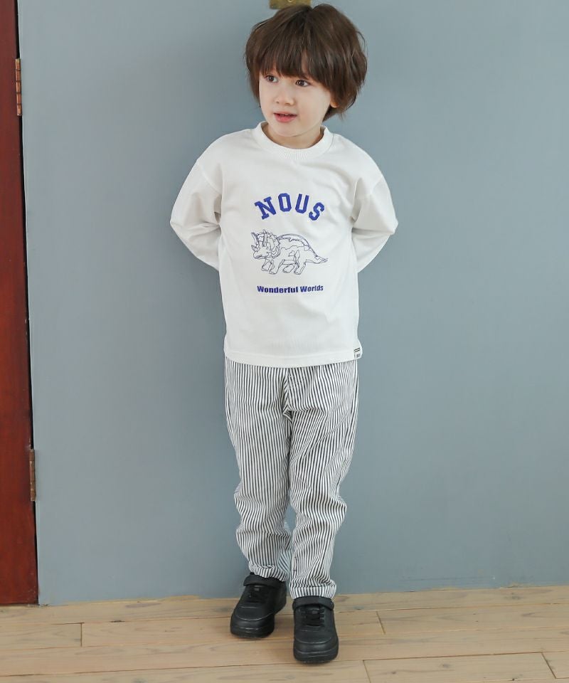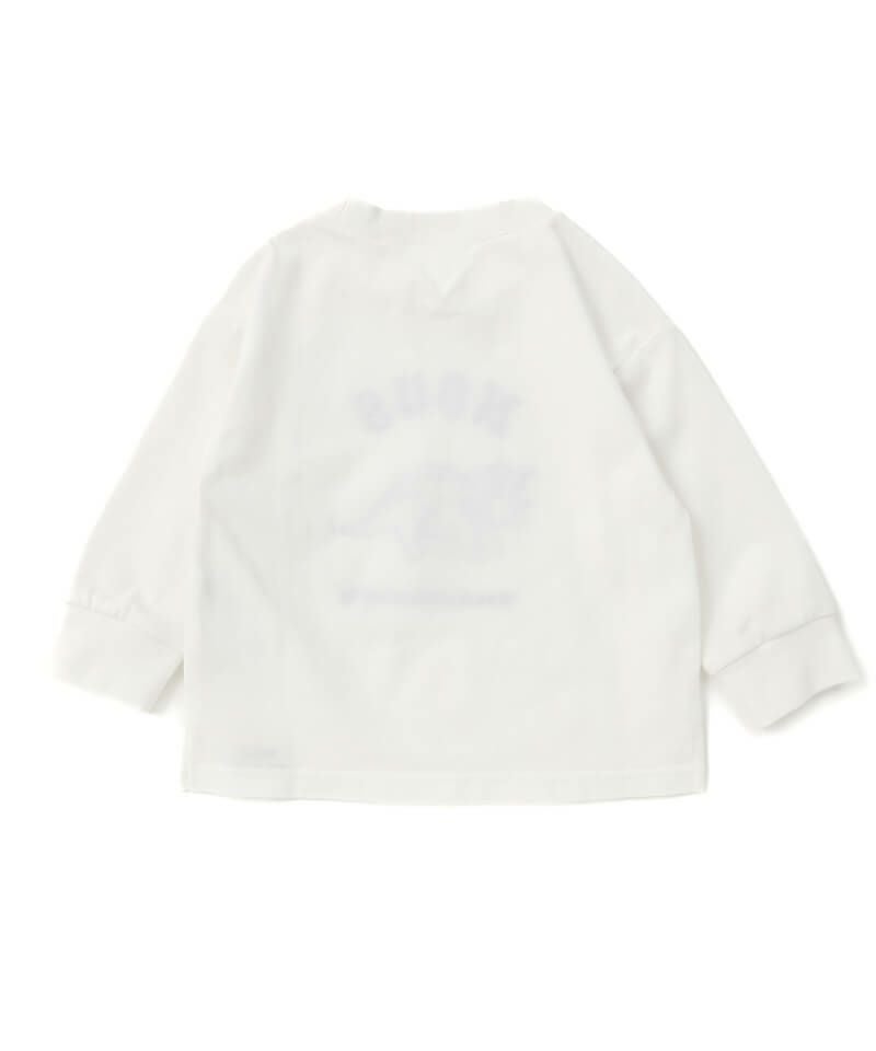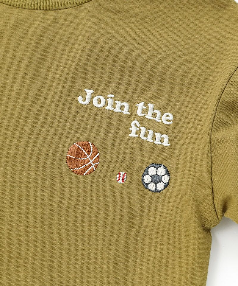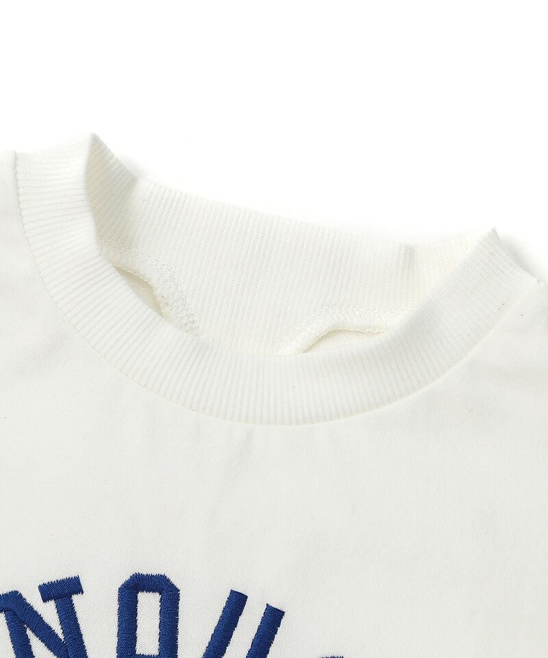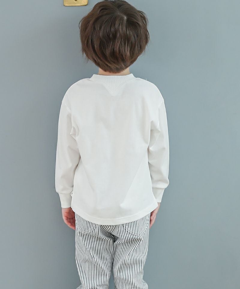 プリントでは出せない刺繍独特の風合いとキッズらしい遊びの効いたモチーフのミックス感が素敵です。ややハリのあるボーイッシュなお素材を使用しています。ボックスシルエットや、お袖のリブ、バックネックの変形ラインが際立ちます。