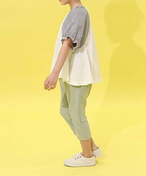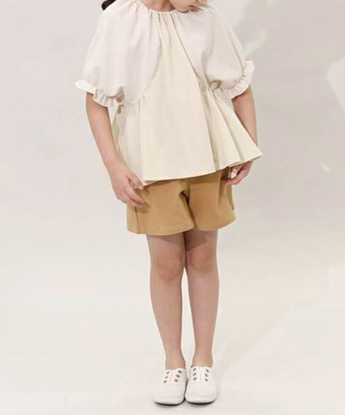 ブラウスのような華やかさがあるプルオーバーです。ふんわりしたお袖と身頃のギャザーが立体的なシルエットでシンプルながらもこだわりが詰まった1枚です。