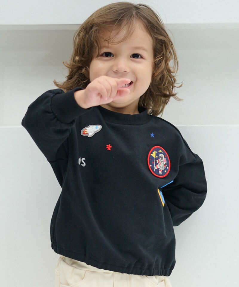 惑星にロケット、星刺繍★楽しいモチーフたっぷりのトレーナーは、シルエットにもこだわった1枚。身頃のカッティングやゴムで作る立体感など、どの角度から見ても素敵なアイテムです!お空をイメージしたクールなカラーリングも素敵☆