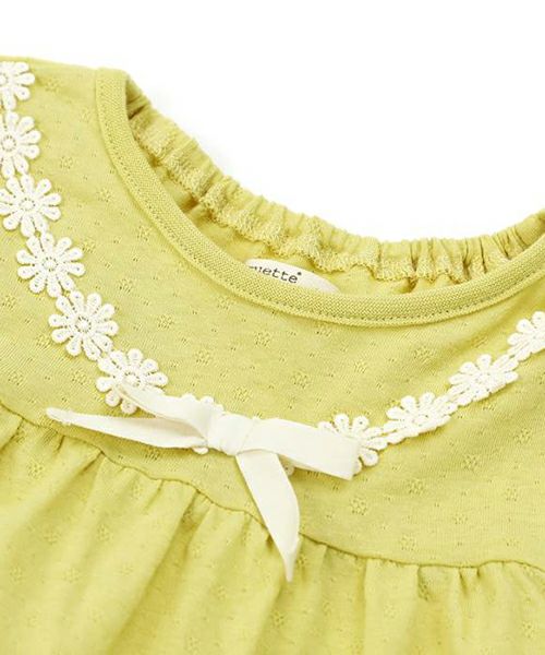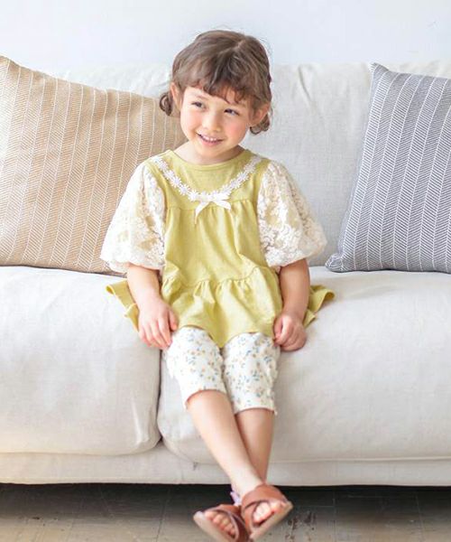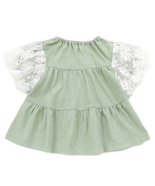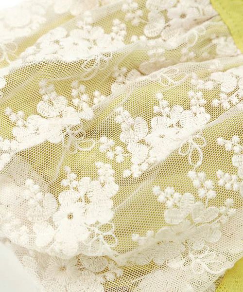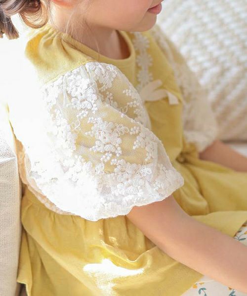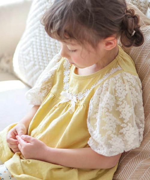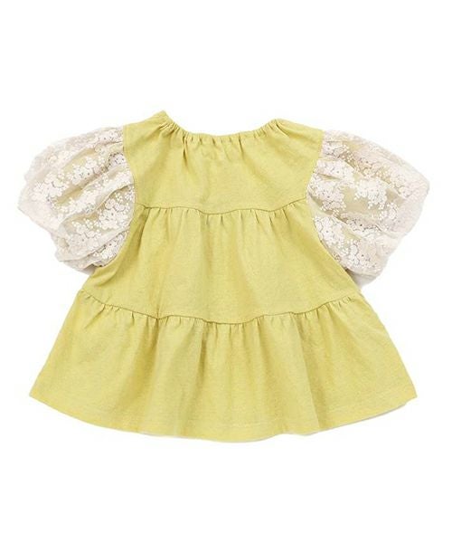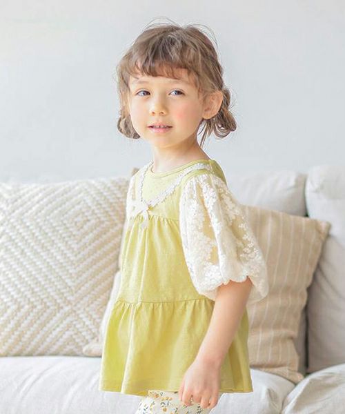 ふわっと広がるティアードシルエット切替のプルオーバー。お袖のお花レースがとってもキュートでシンプルながら上品で華やかな印象に。お色はトレンドカラーのこっくりイエローとグリーン。コーディネートの差し色にもおすすめです。
