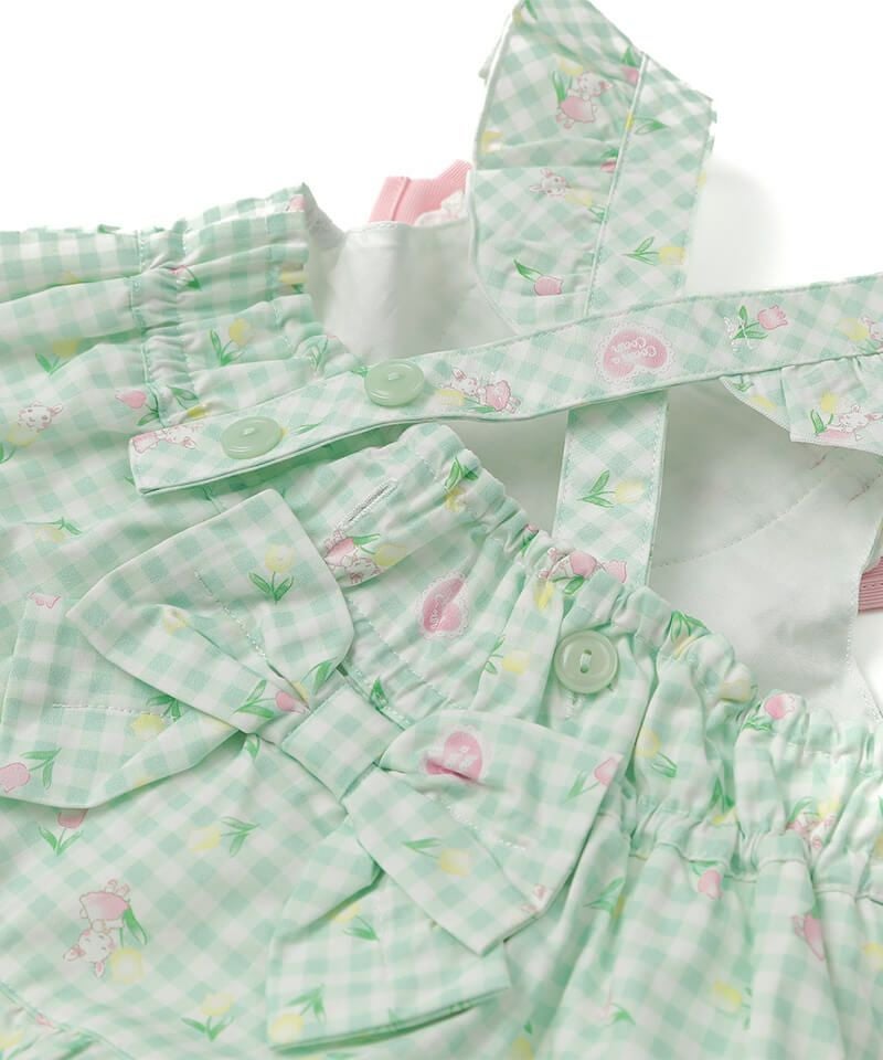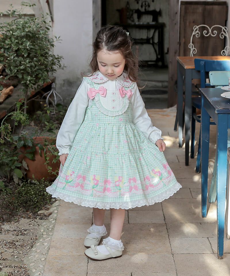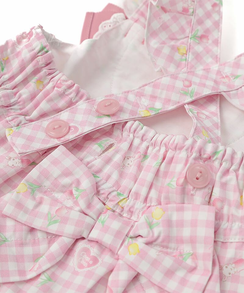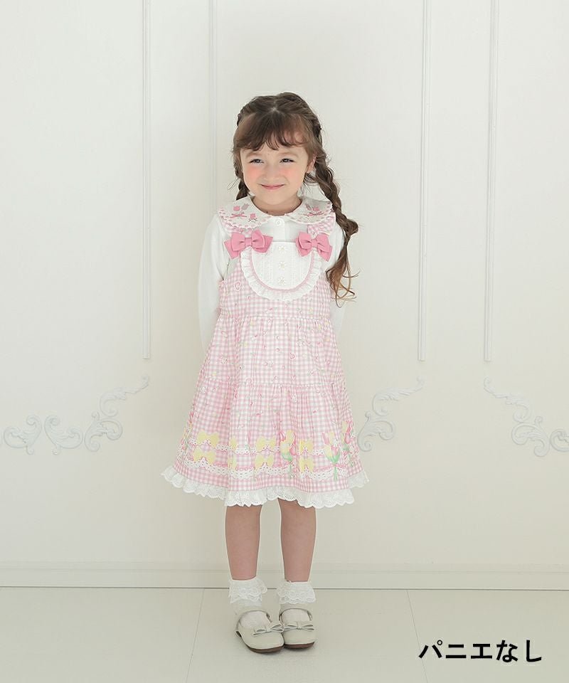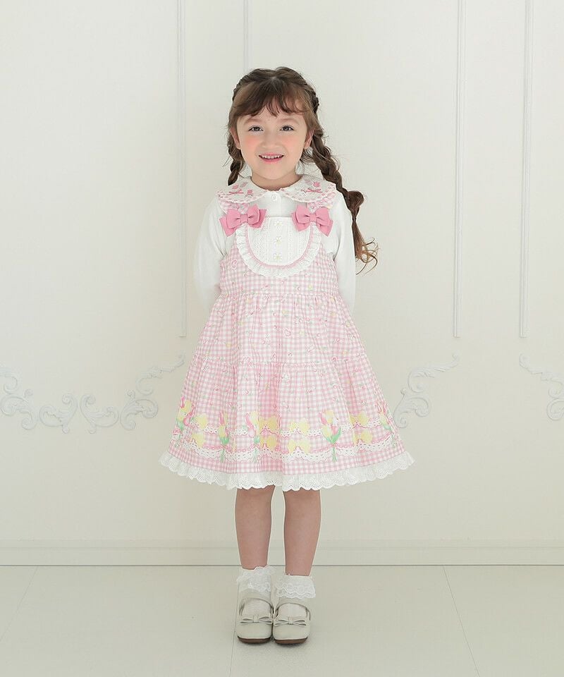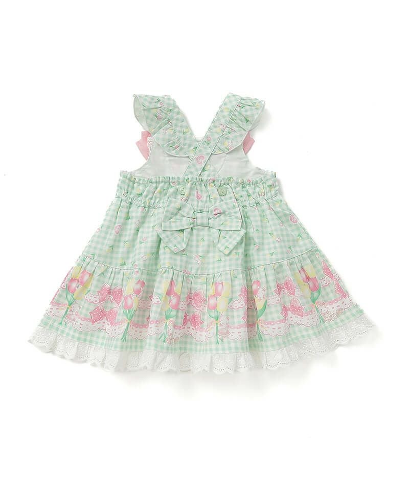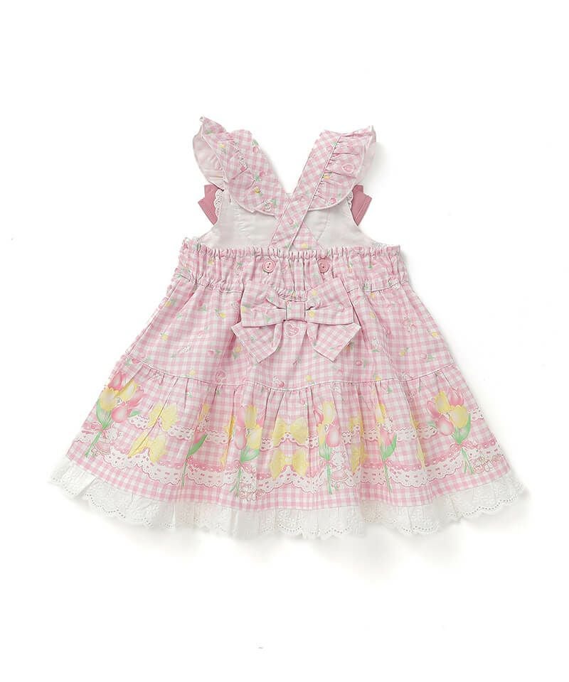 オリジナルのチューリップギンガムチェック柄を使用したジャンパースカート。ヨーク部分には、フリルやお花のレースがあしらわれており、細部まで女の子らしいこだわりがたくさん。合わせるインナーによってシーズン問わず色々なコーディネートを楽しむことができ、お出かけやイベントなどさまざまなシーンで可愛らしさを演出してくれます。肩紐のボタンで丈の調整が可能です。