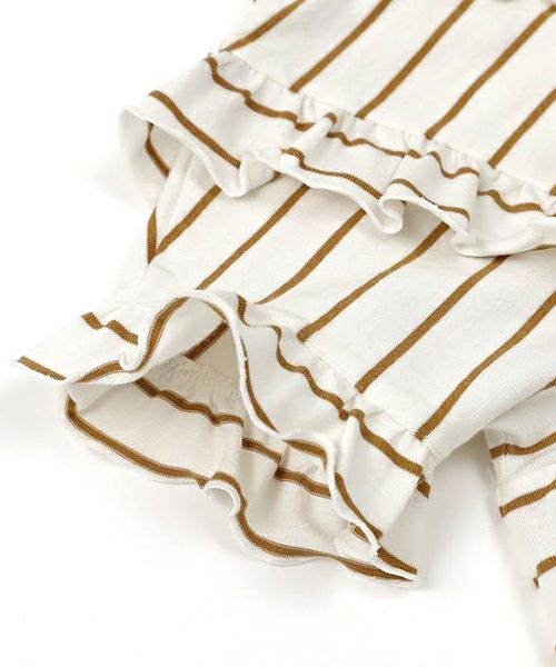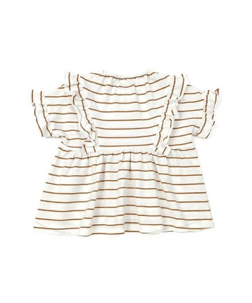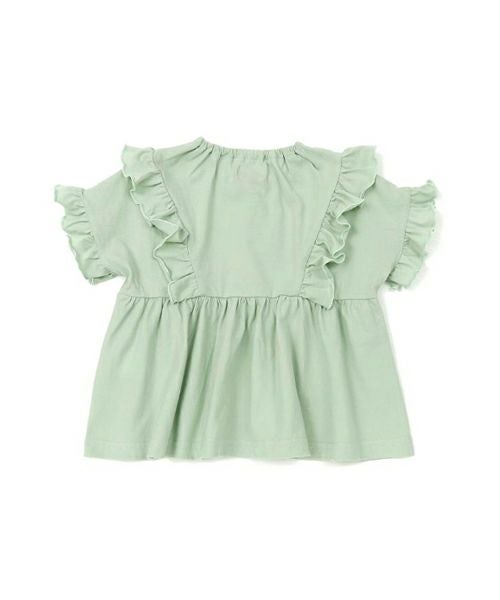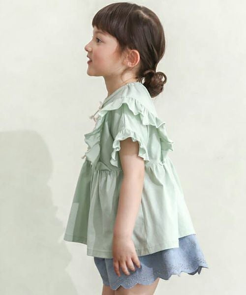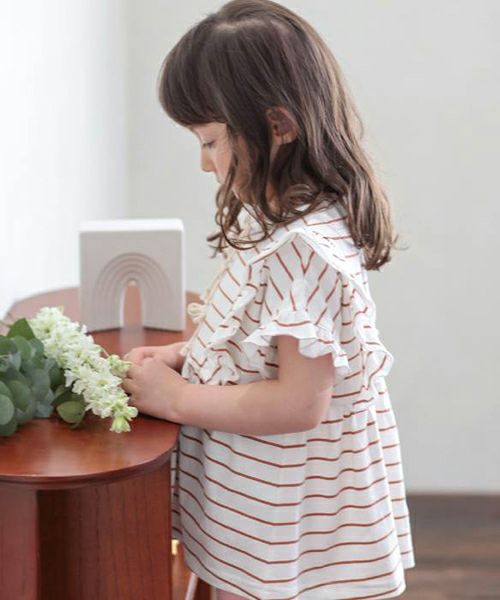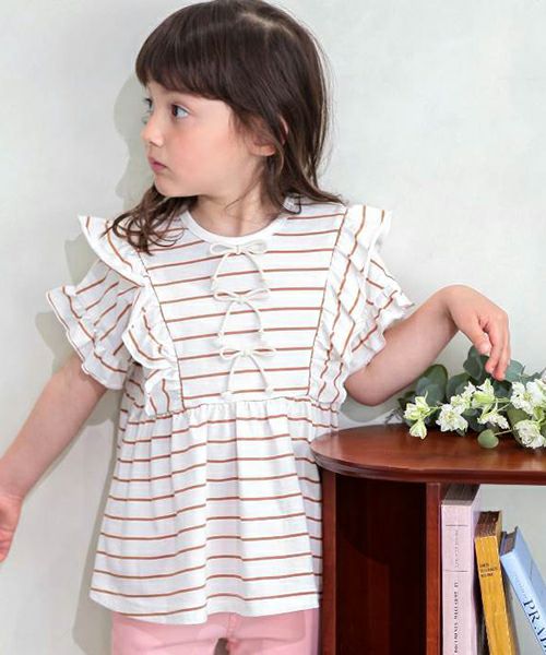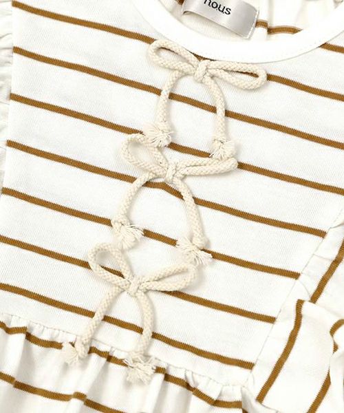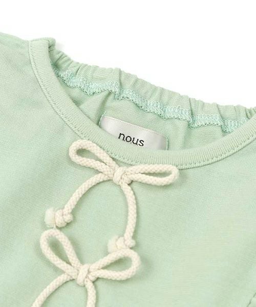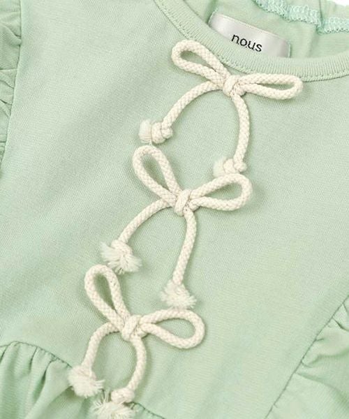 きれいめな目が詰まった素材の生地を使用し、ほどよいボリューム感のフリルとコード素材のリボンがおしゃれなTシャツです。