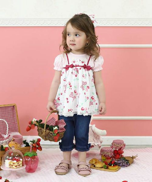 コーディネートの主役になること間違いなし!チェックのシフォンにいちごのプリントがキュートなレイヤードスタイルのチュニック♪胸元のリボンがよりラブリーな印象に♪コーデを考えなくても可愛く決まる1枚です。デザイナーいちおしアイテム♪嬉しいお名前タグ付き!