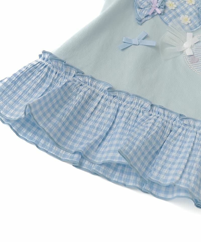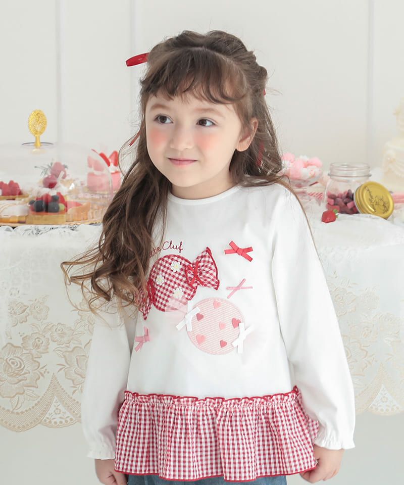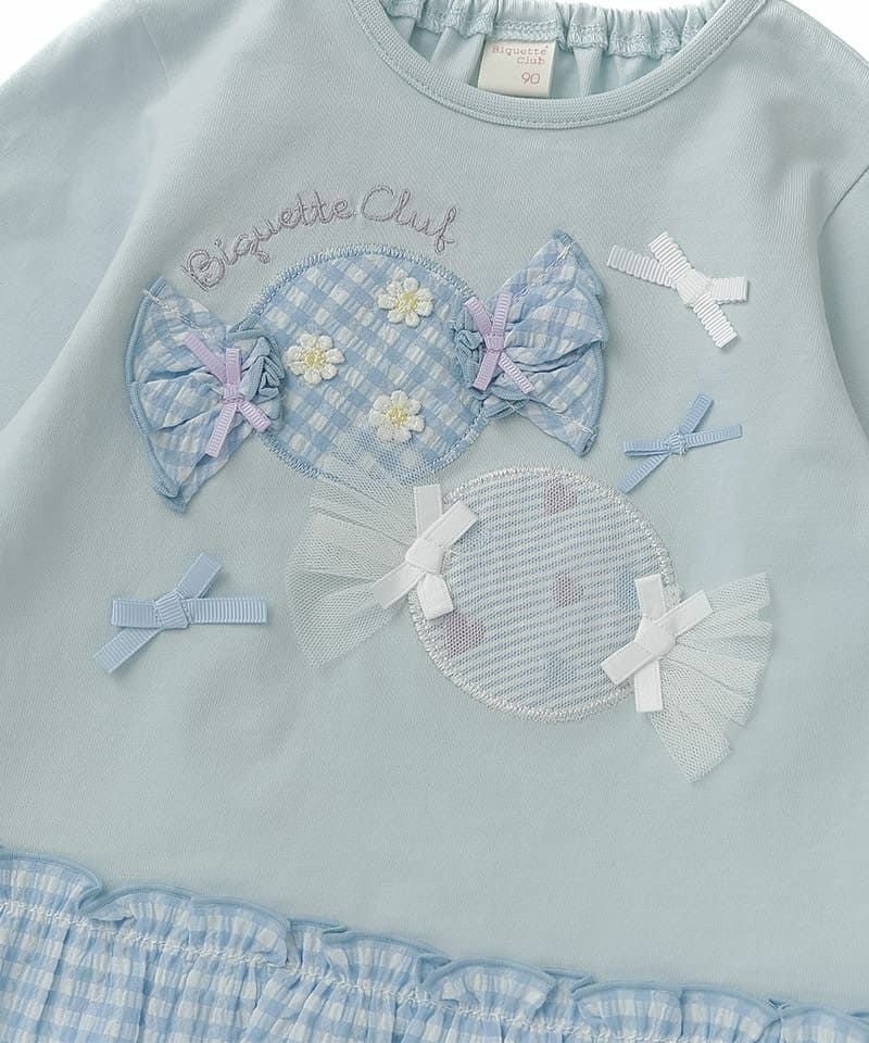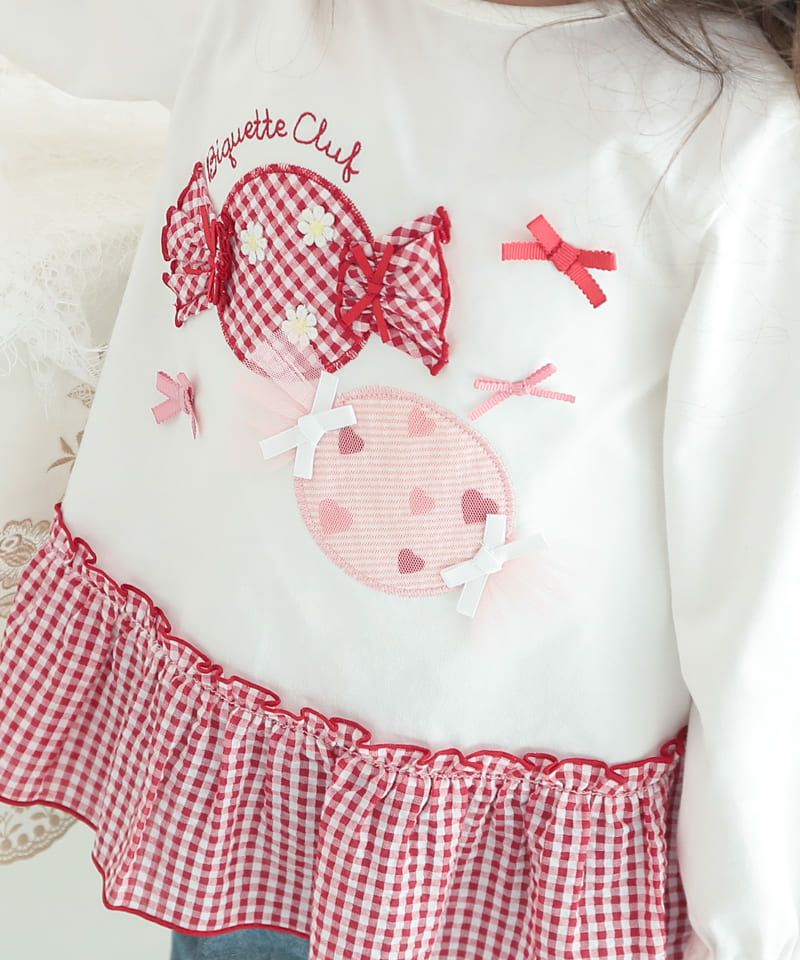 お花にリボン、チュールなど女の子の大好きが詰まったキャンディモチーフAラインTシャツ♪ギンガムチェックのフリルが愛らしさたっぷり♪お袖はアウターが羽織りやすいプレーンなシルエットなので、重ね着の時期も使い勝手の良いアイテムです。