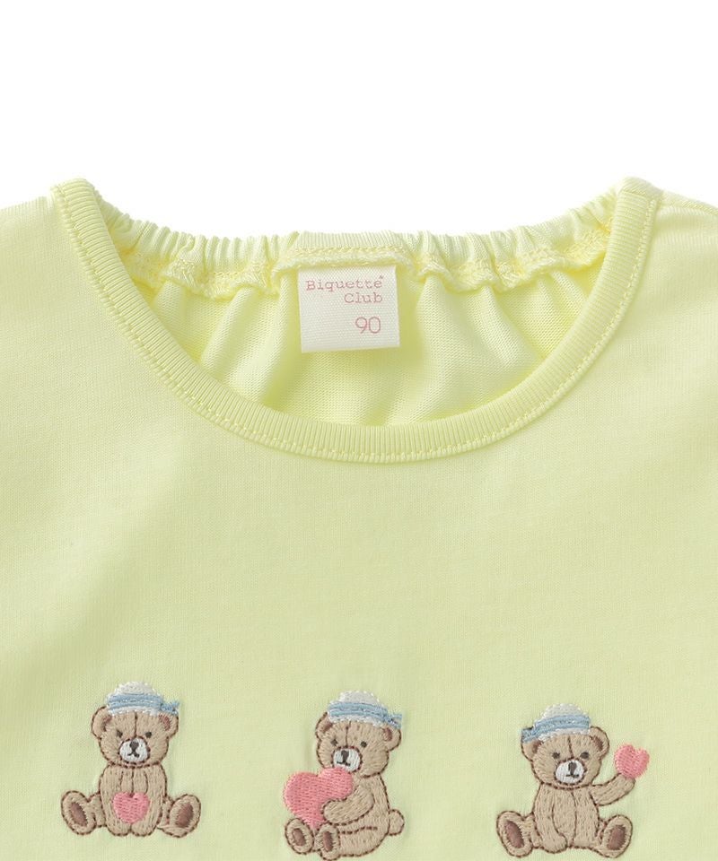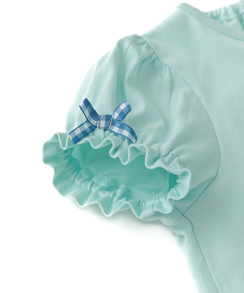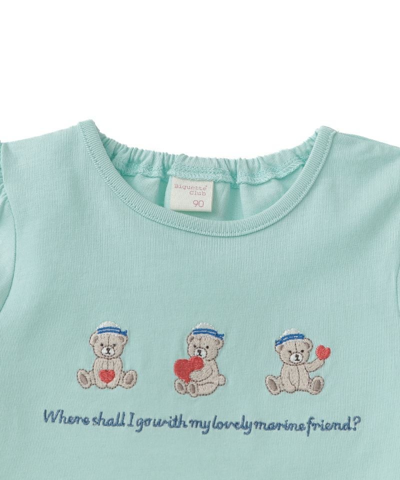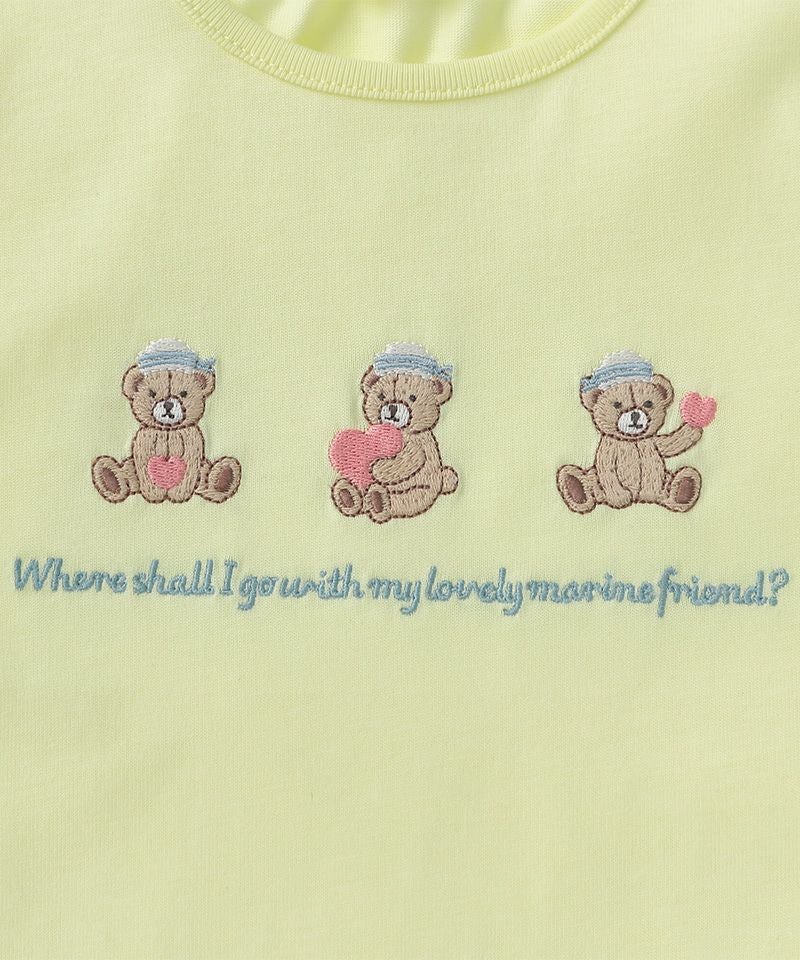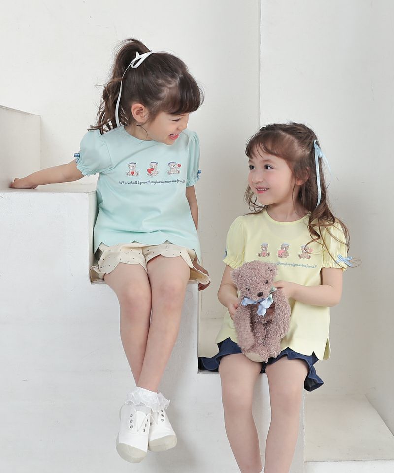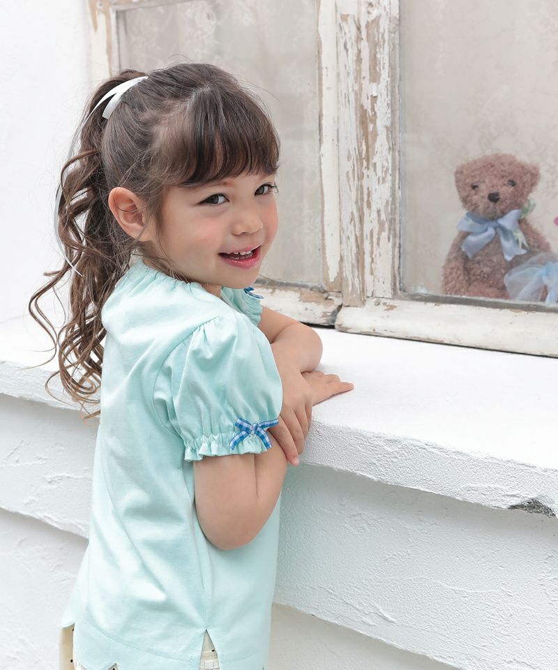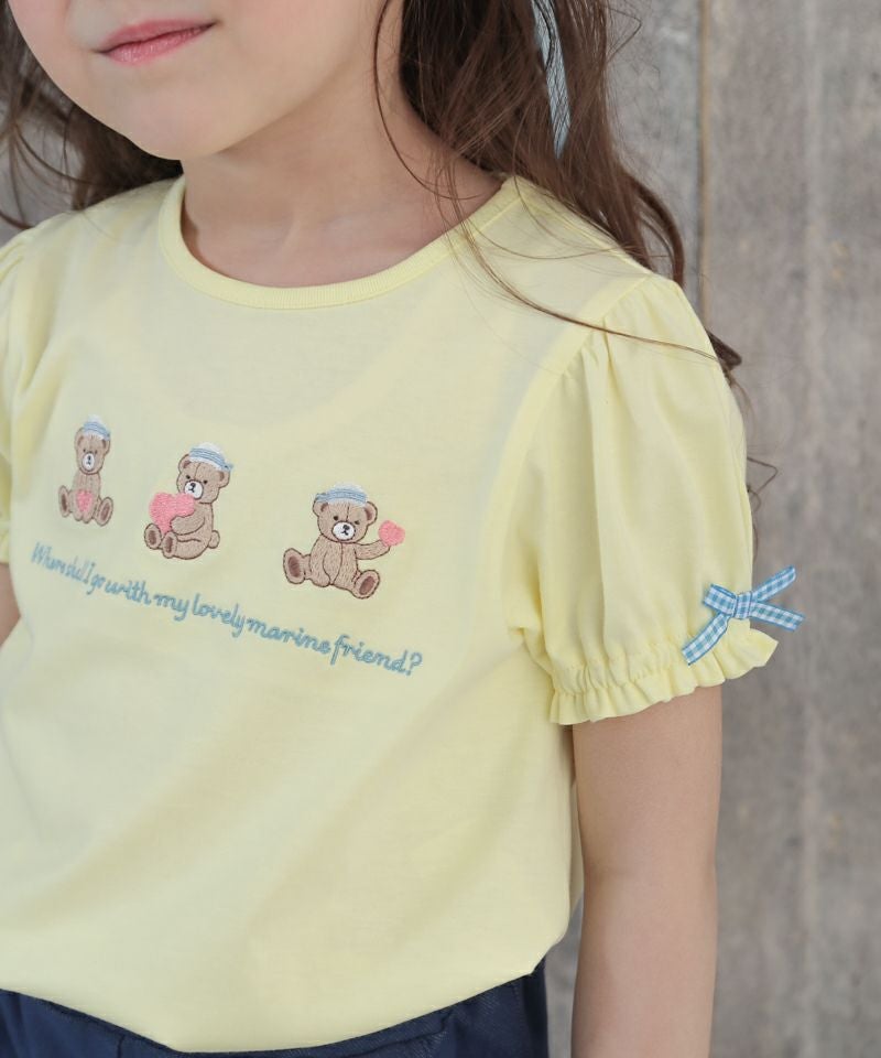 ハートとマリンくまちゃんの組み合わせがかわいいTシャツは、スカラップの裾やお袖にあしらったギンガムチェックのリボンなど、どんな角度から見ても可愛いデザイン♪可愛いあしらいと爽やかなカラーのミックス感も素敵です☆