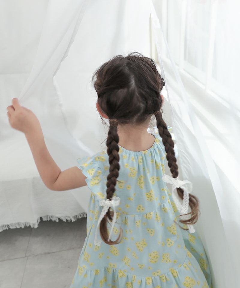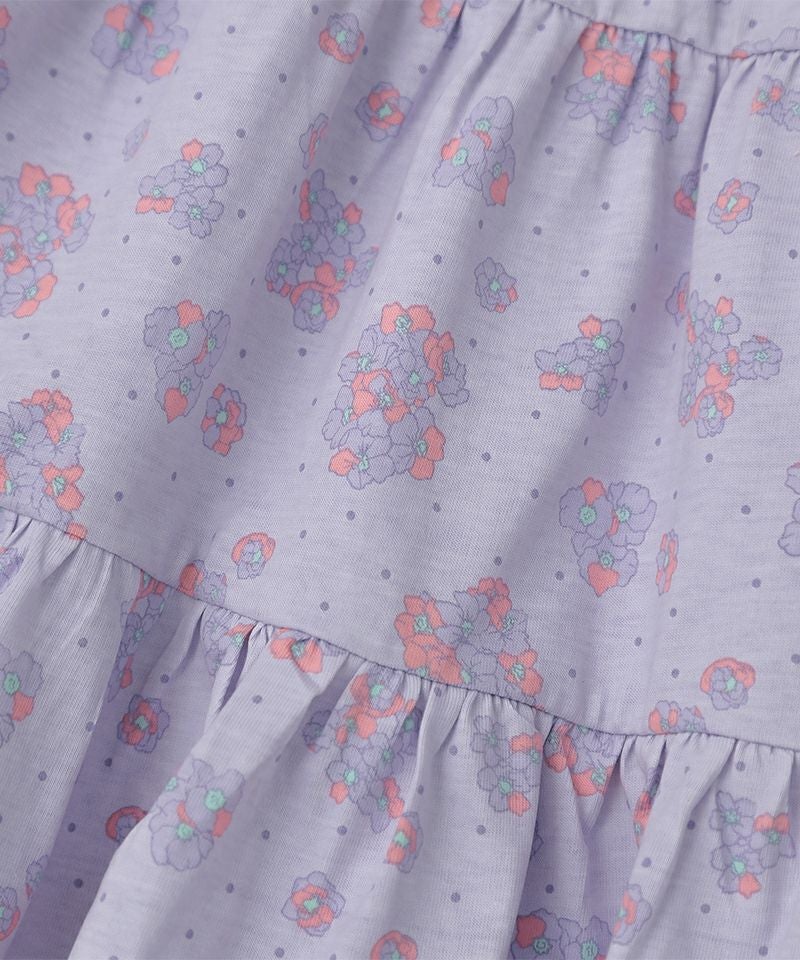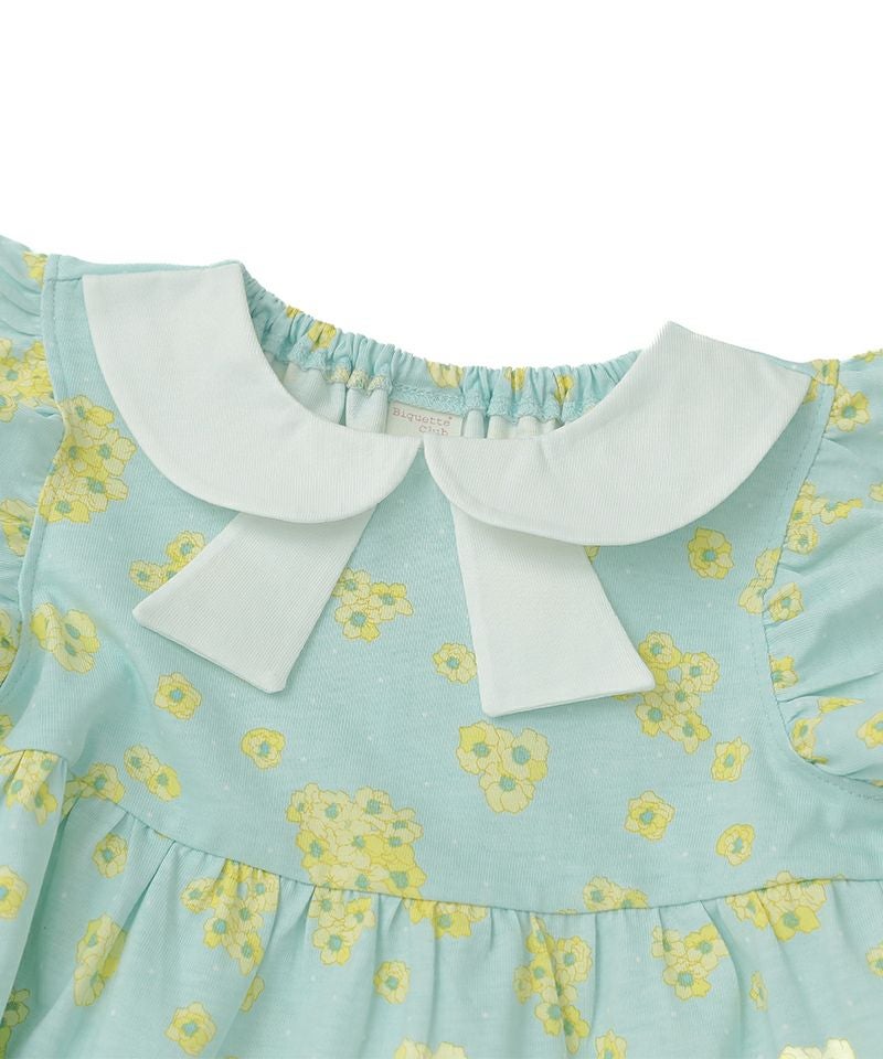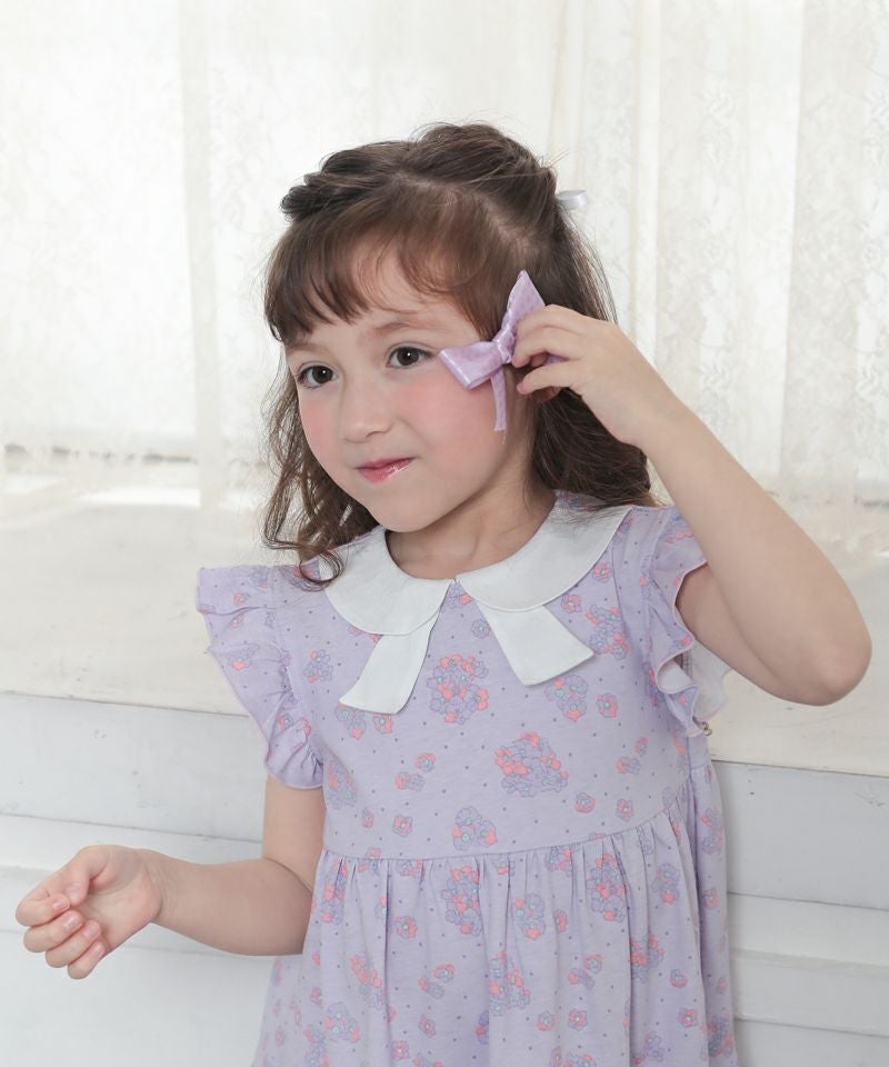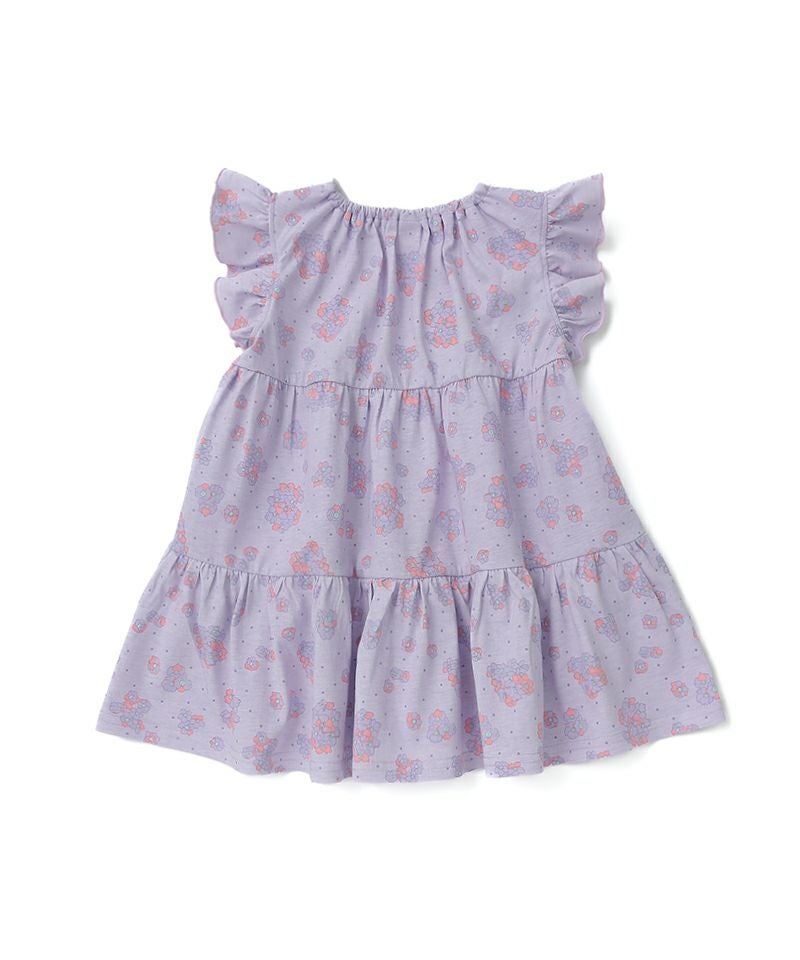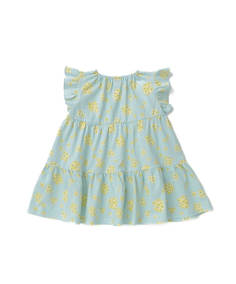 優しいカラーの花柄がふんわり広がるティアードワンピース♪白いリボン風衿が上品さもプラスしてくれるデザイン♪夏のお出かけが楽しみになるとても愛らしい1枚です♪カーディガンとのコーディネートもおすすめです!