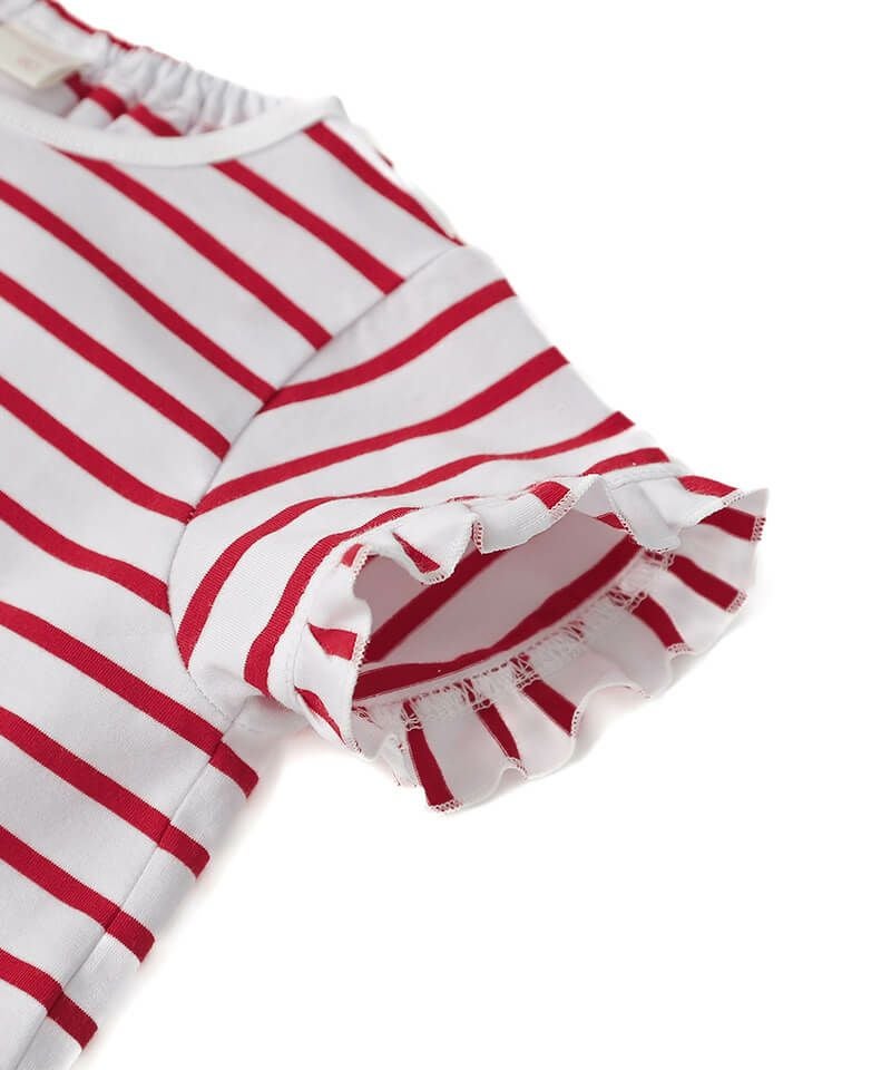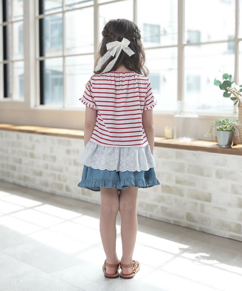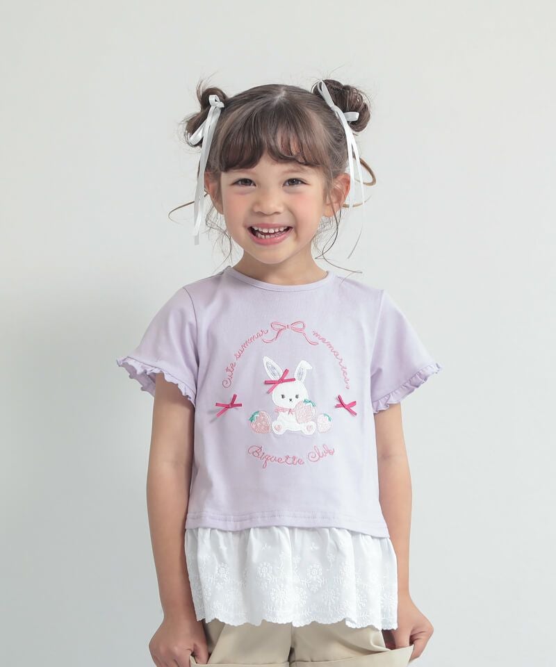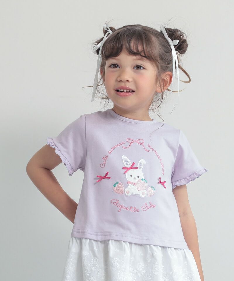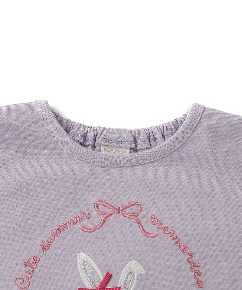 ふんわりカラーのガーリーなうさぎちゃんとマリンなうさぎちゃんが夏らしいボーダー柄☆ホワイトのギャザーレースがとっても涼し気です。スリムボトムやショートパンツと相性がよく、パンツコーデをガーリーに楽しめるアイテムです。
