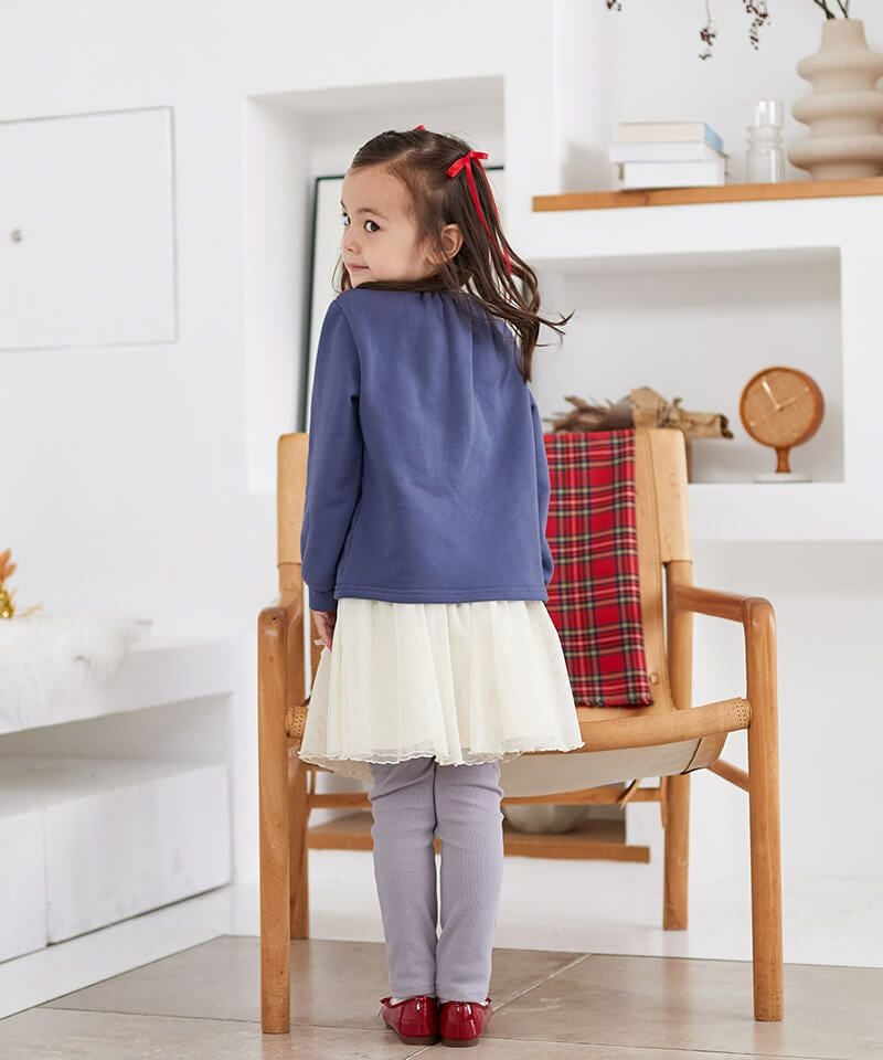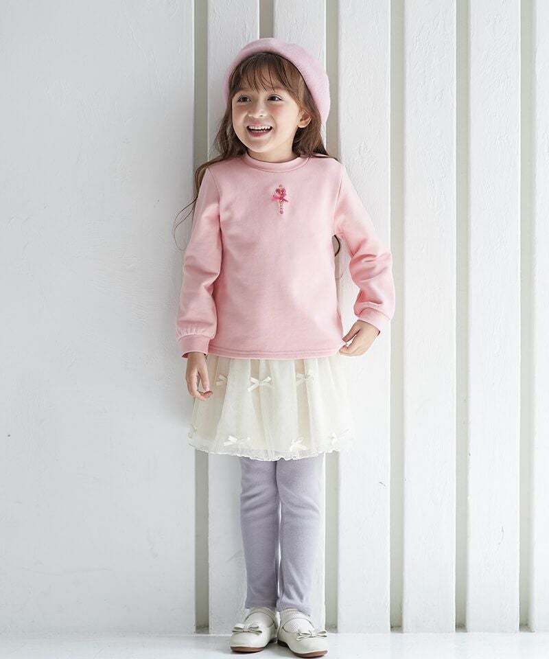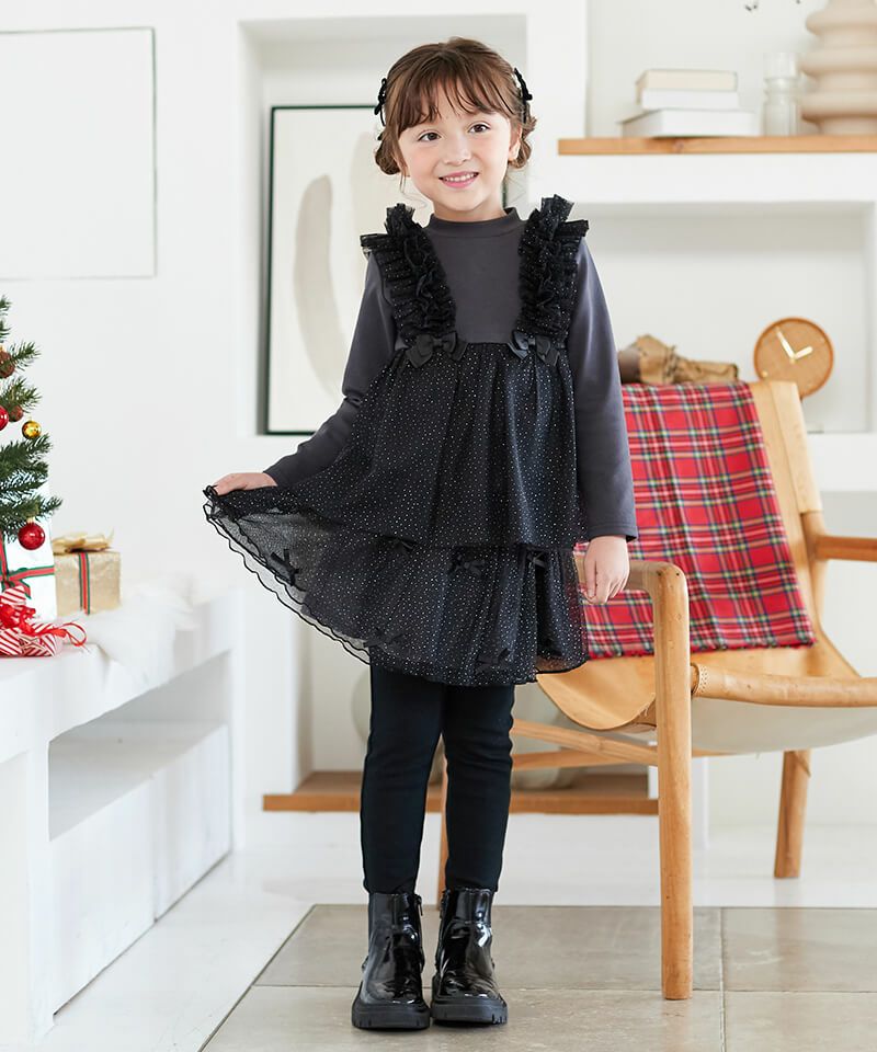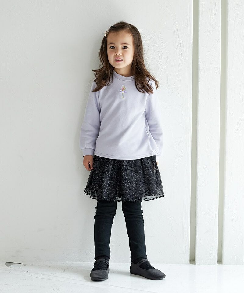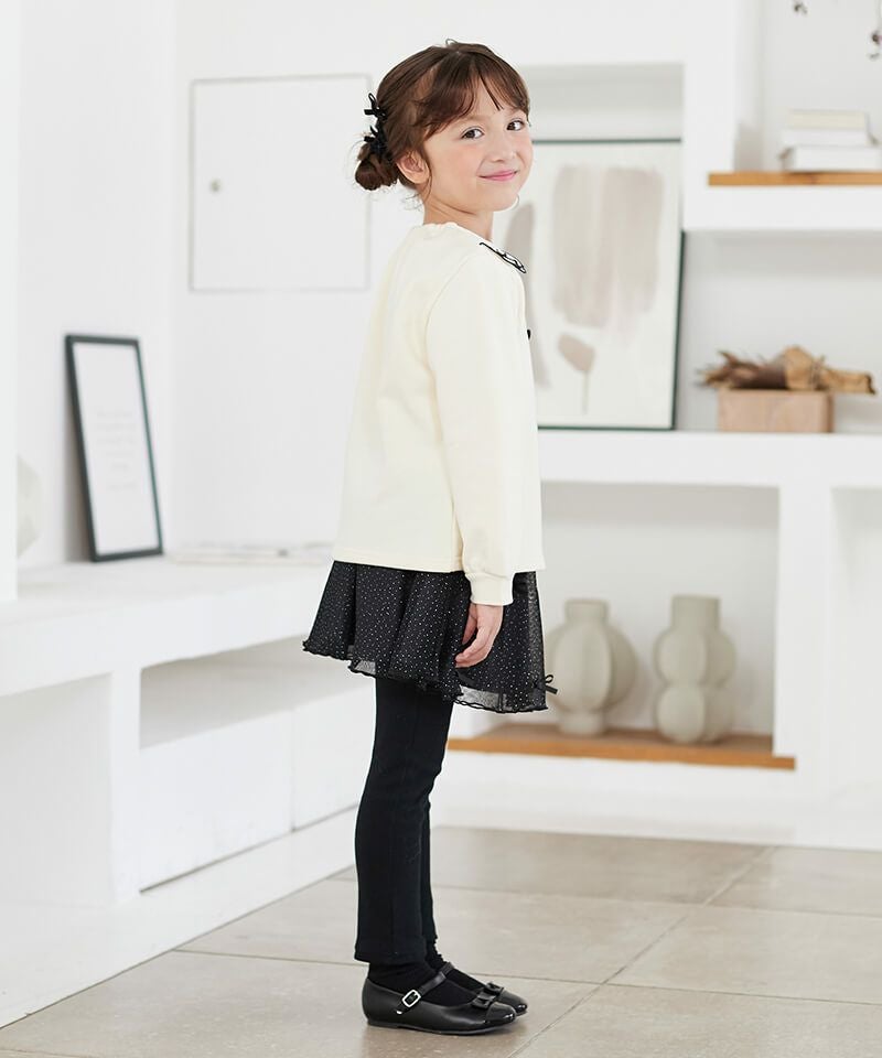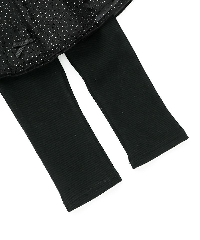 小さなラメプリントにリボンをあしらった胸キュンボトム♪レギンスのすっきりとしたシルエットとハリのあるスカート裏地が洗練された印象を引き出しています。カジュアルコーデはもちろん、音楽会や冬のお出かけにもおすすめなアイテム♪