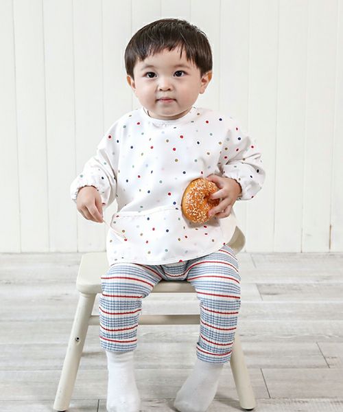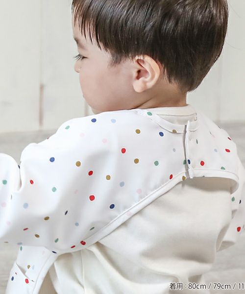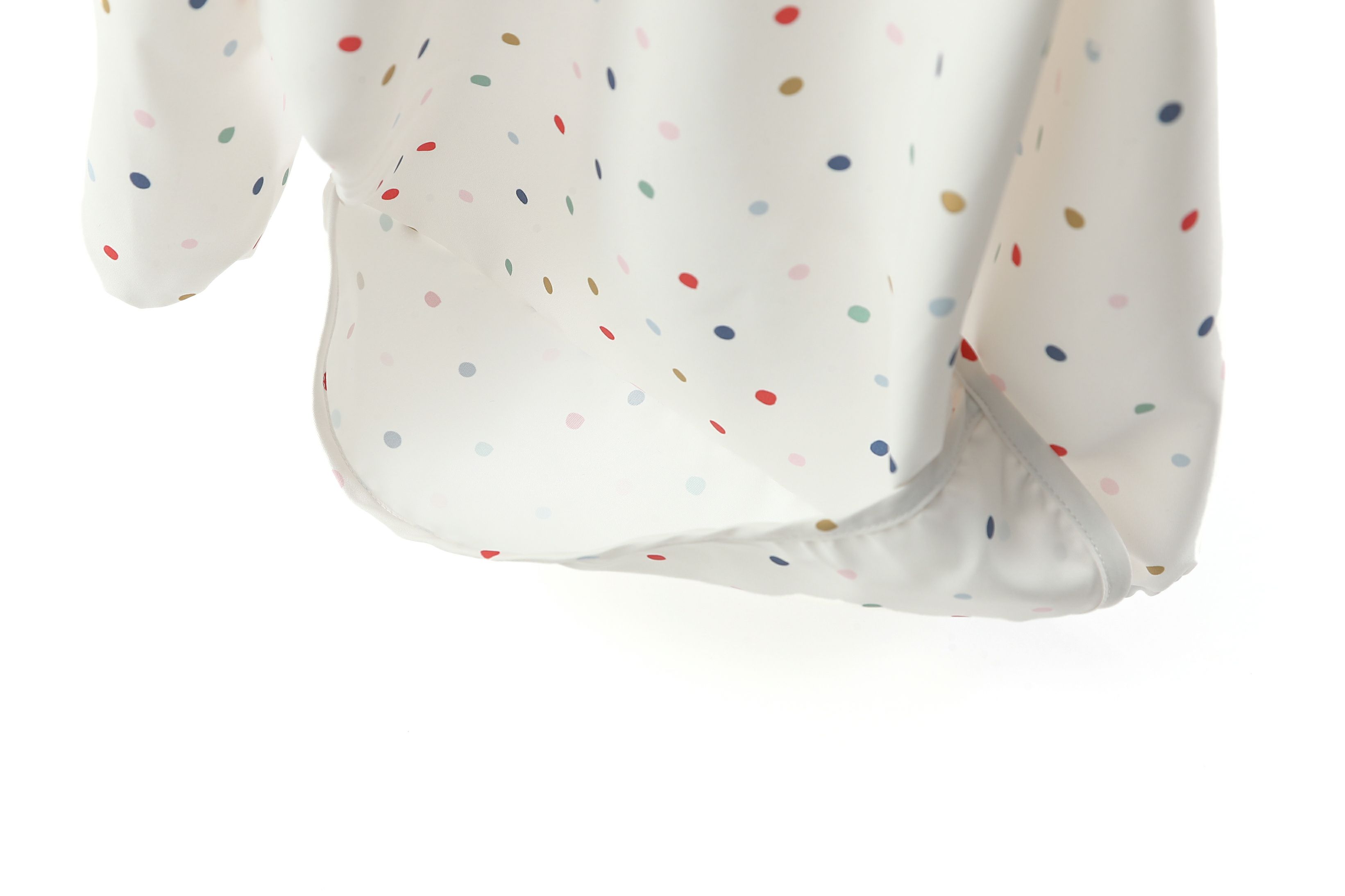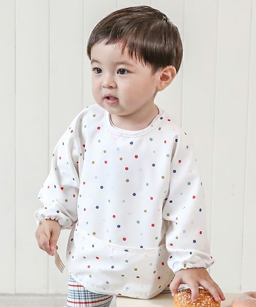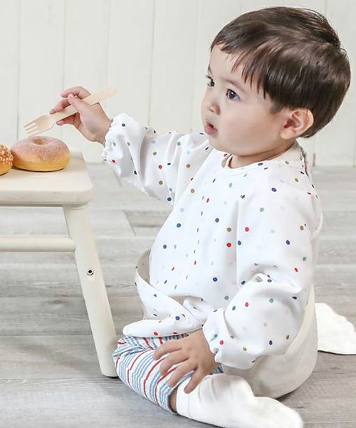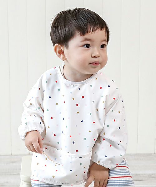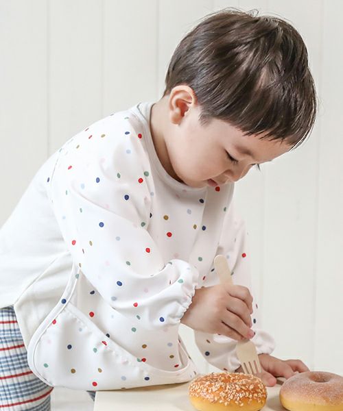 大人気!撥水加工付きのお食事エプロン♪ユニセックスで使えるマルチドット柄とガーリーなチェリー柄。どちらもカラフルでごはんの時間が楽しくなりそう☆
