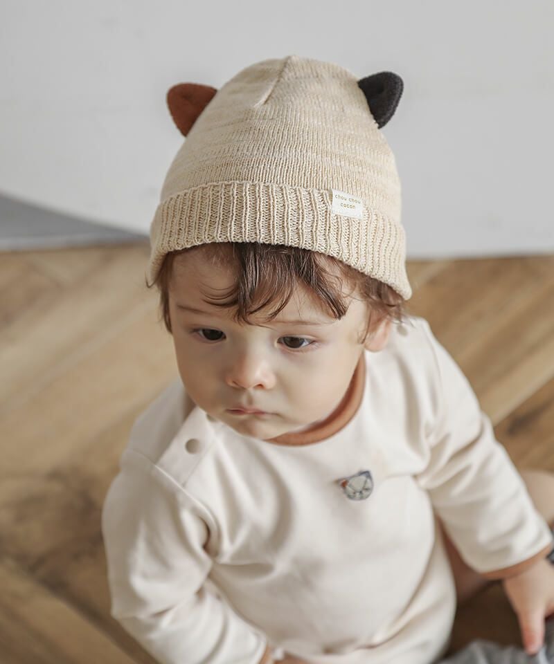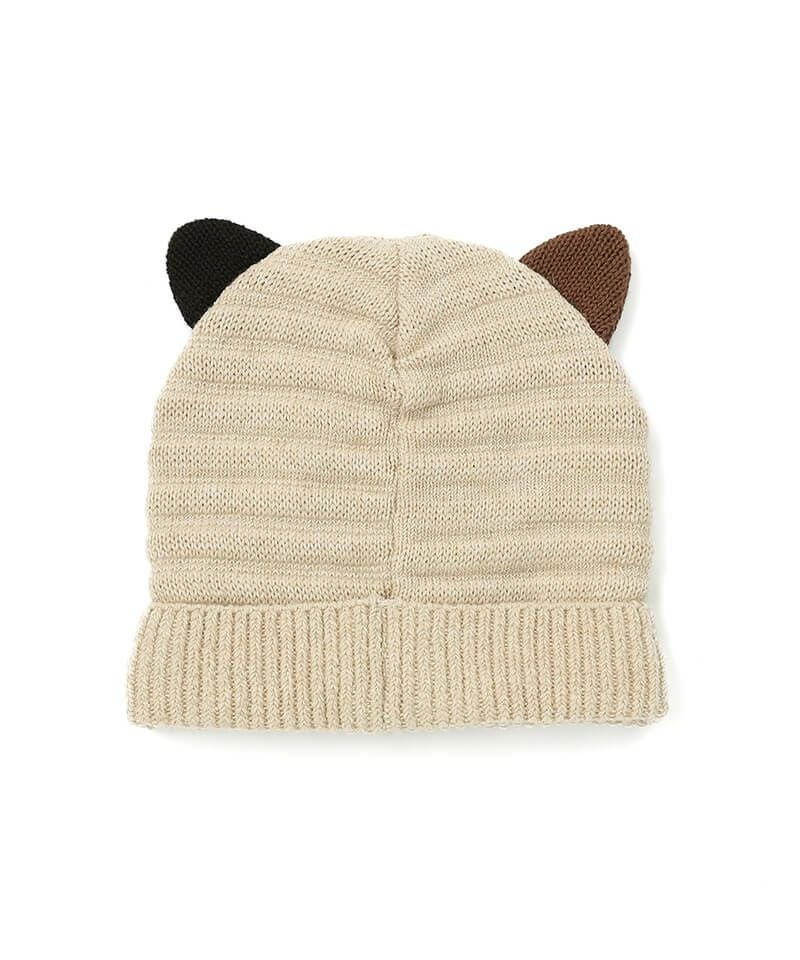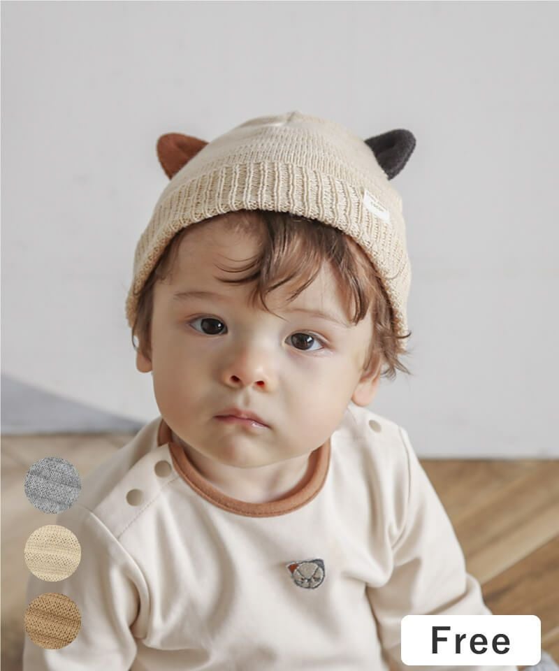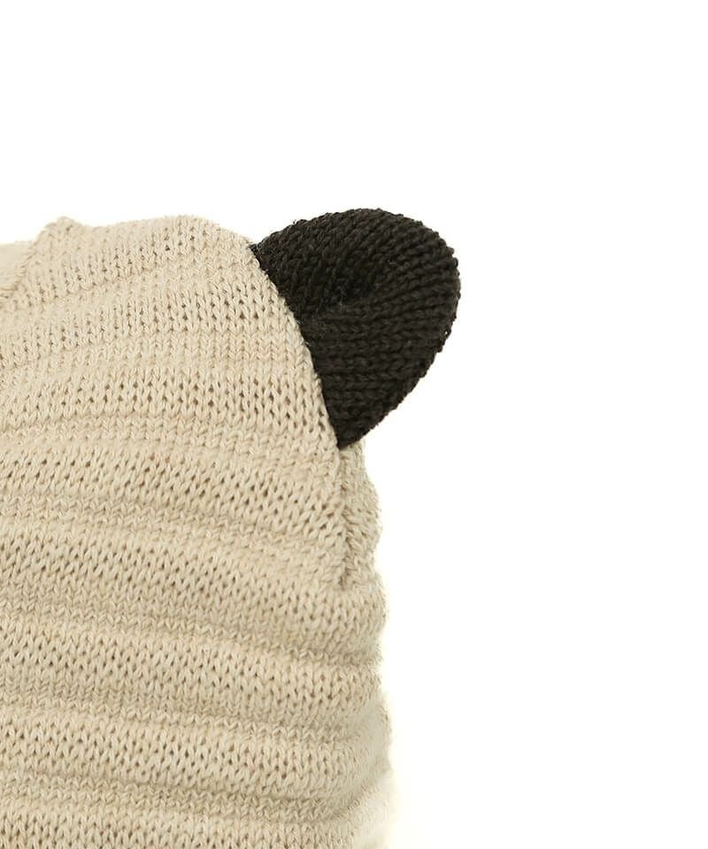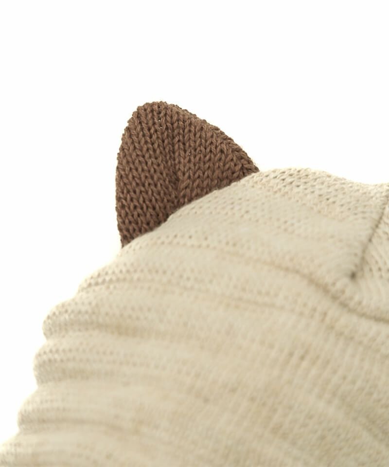 何といっても見た目の可愛らしさが今だけの特別感♪かぶった姿が早く見たくなるアイテムです。コットン100%の優しい肌触りの糸を使用し、緩急を付けて編むことで伸縮性を持たせた表地、コットン100%のカットソーを使用した裏地で汗っかきベビーにも優しい設計です。ねこボディシャツとコーディネートすれば、ぬいぐるみの“おともだちねこ”とお揃いが楽しめるアイテムですのでシリーズでお楽しみいただけると嬉しいです♪