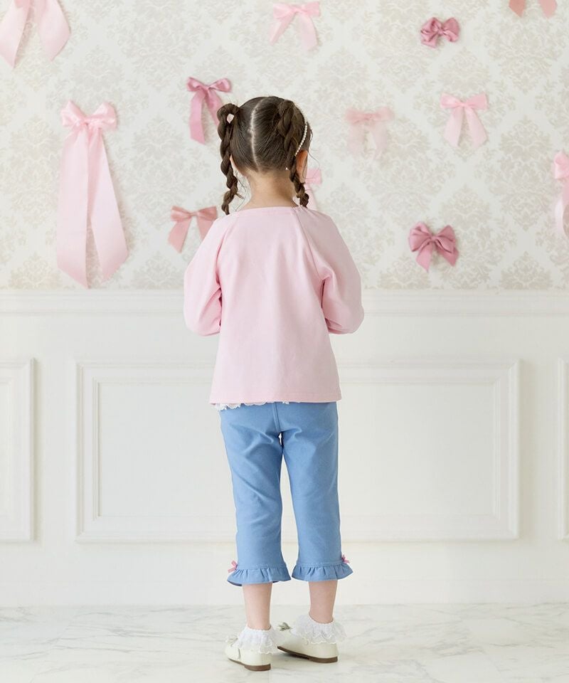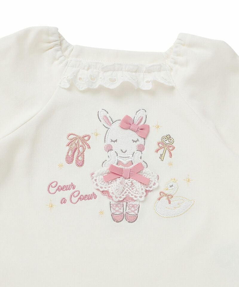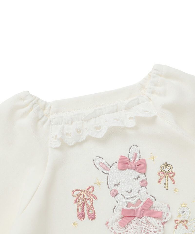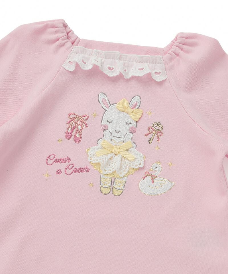 バレリーナうさぎちゃんのアップリケやバレエモチーフの刺繍が可愛いロングTシャツ。スクエアネックにはハートのレースをあしらい上品でスイートな雰囲気をプラスしました。柔らかなコットンスムース素材で肌触りも優しく、毎日着たくなる心地よさです。襟ぐりにはゴムが入っているのでお着替えもスムーズ♪普段使いのコーディネートにも取り入れやすく、可愛さと快適さを兼ね備えたアイテムです。