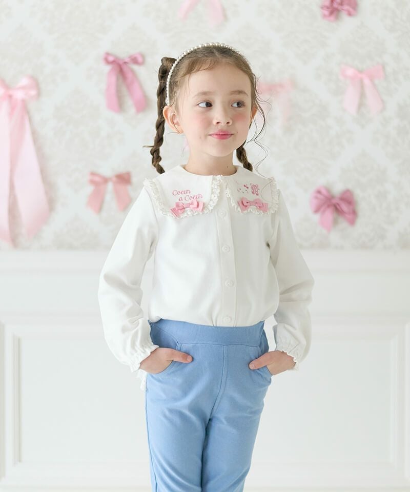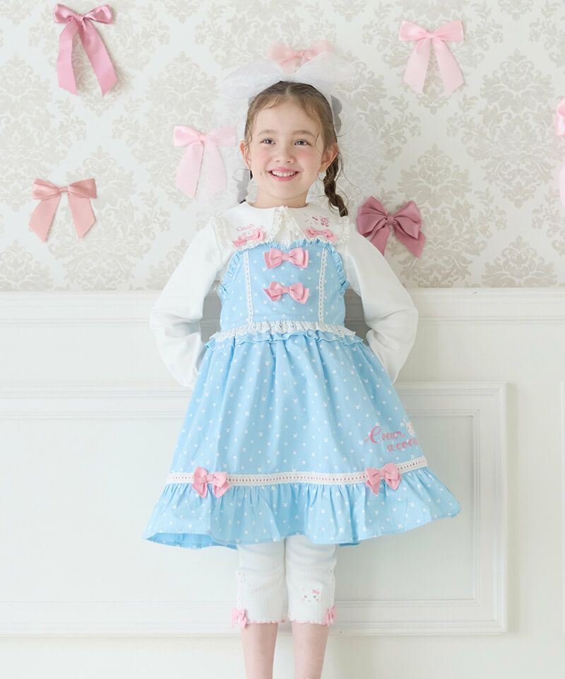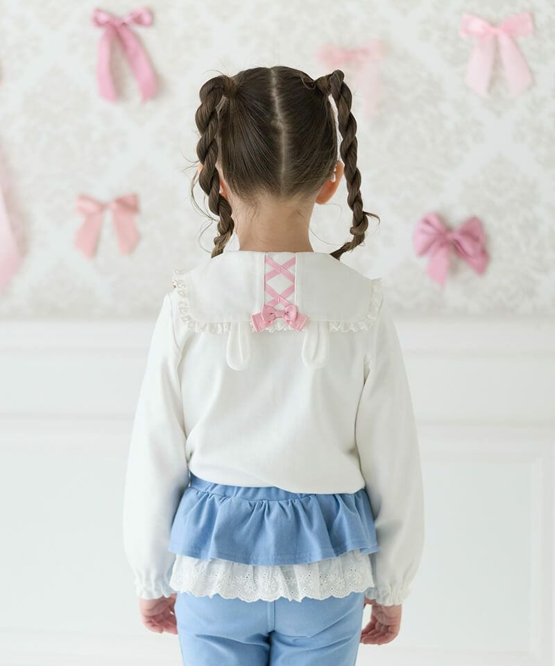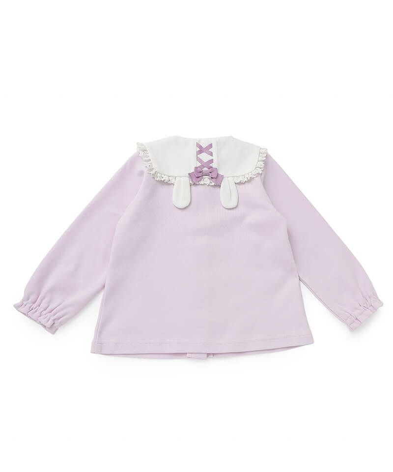 後ろ姿までときめくレースアップデザインのうさみみブラウス。フロントはスクエア風の襟にリボンやうさぎちゃん、トゥシューズの刺繍をあしらいお顔まわりを華やかに仕上げました。バックにはレースアップリボンとうさみみデザインで甘めコーデにぴったりな可愛さを演出します。カットソー素材のソフトなスムースで着心地も快適。ジャンパースカートのインナーはもちろんパンツなどのボトムスとのコーデも可愛く決まる着回し力の高い一枚です。