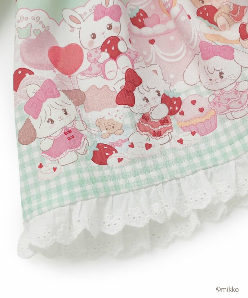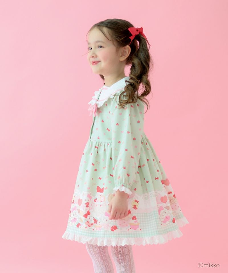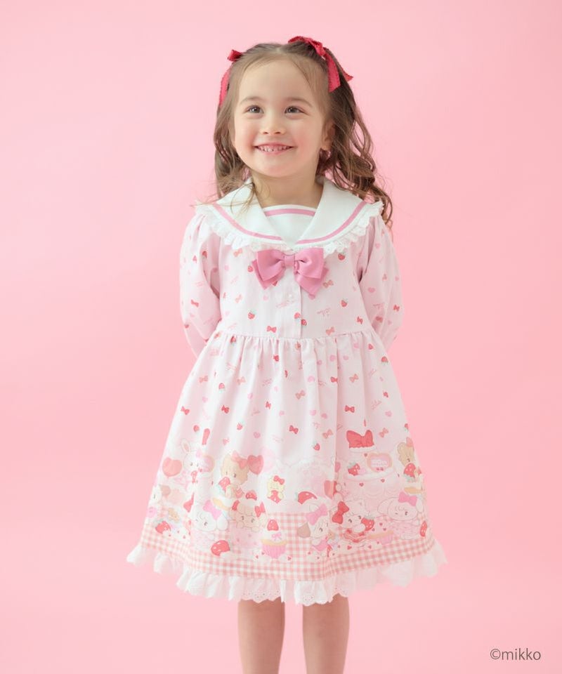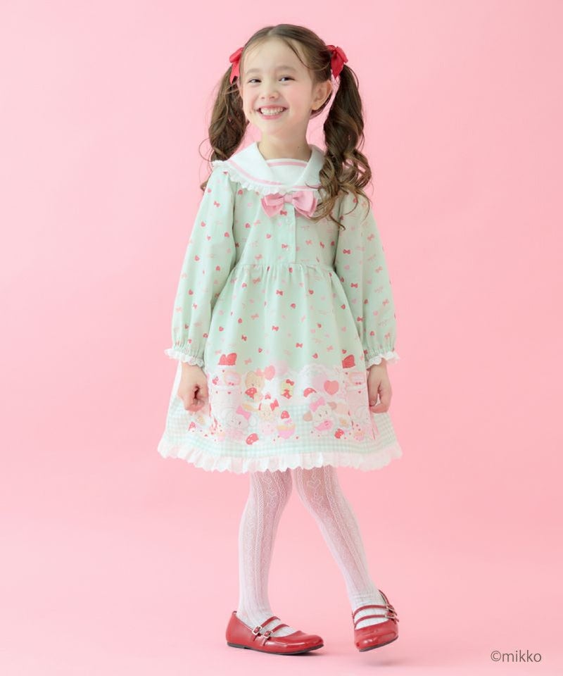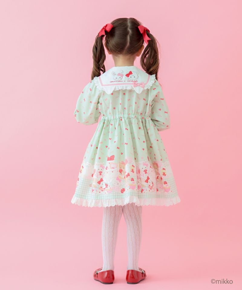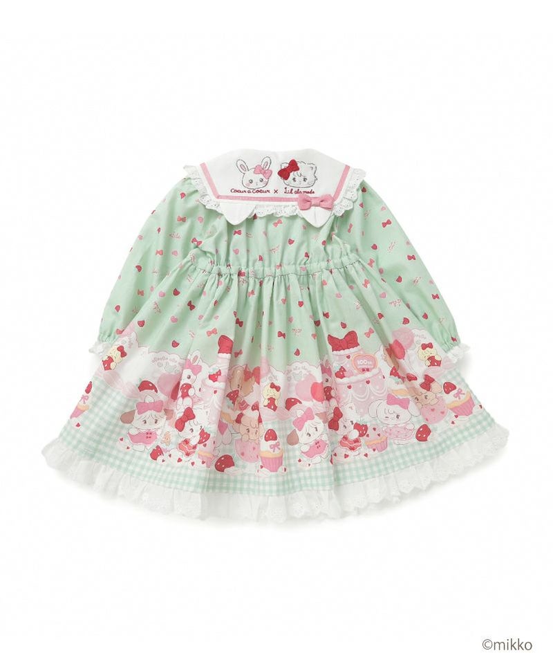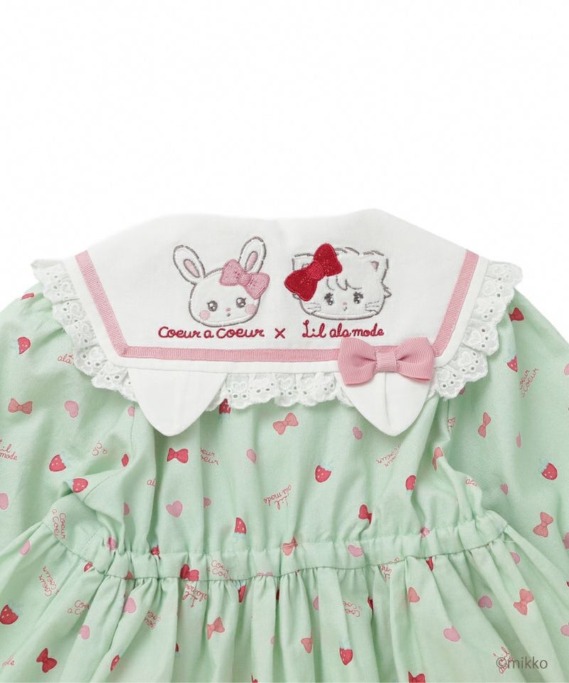 大人気キャラクター「Lil ala mode」との特別なコラボレーションからセーラーワンピースが登場。キムラタン100周年アニバーサリーのために描きおろされたキュートなイラストをパネルプリントで贅沢にあしらいました。ピンクはうさみみにキャミーとうさぎちゃん、ミントはねこみみにムースとうさぎちゃんのアップリケ刺繍を添えたセーラーデザインがそれぞれ異なる可愛さを楽しめます。ふわっと広がるAラインシルエットや襟や袖口、裾にデコレーションしたレースのフリルが可愛らしさの中に上品な印象をプラス。おでかけや特別な日にも活躍してくれる主役級のワンピースです。