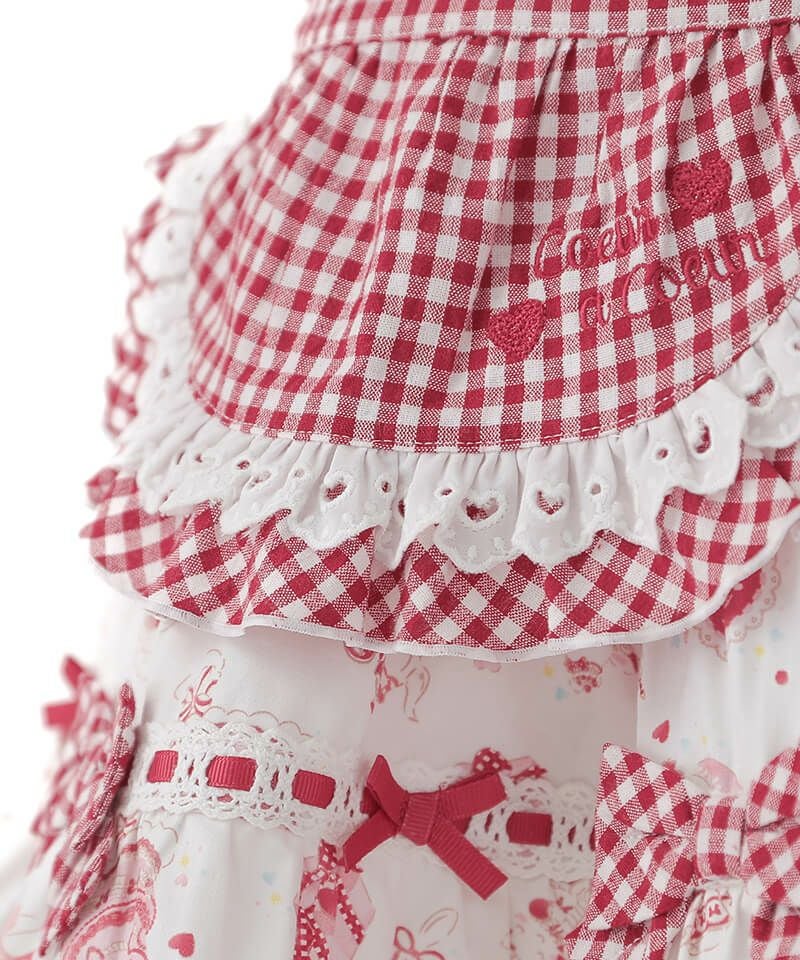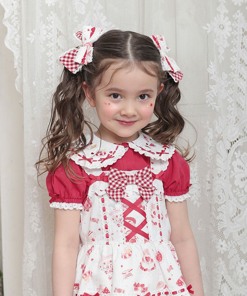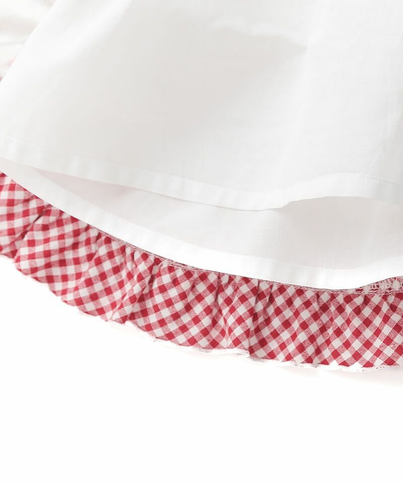 ギンガムチェックのフリルにはしごレースとたっぷりのリボンをトッピングし、