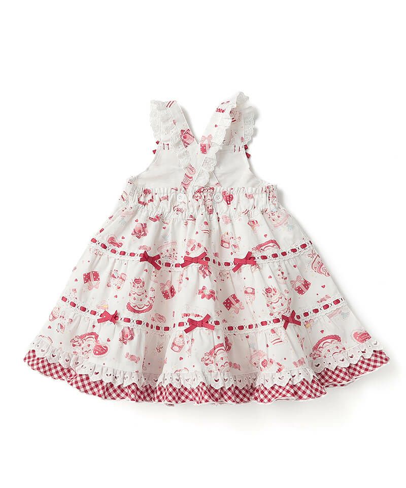 アニバーサリーイヤーをお祝いするパーティーの様子を描き起こしたオリジナルプリントのジャンパースカート。