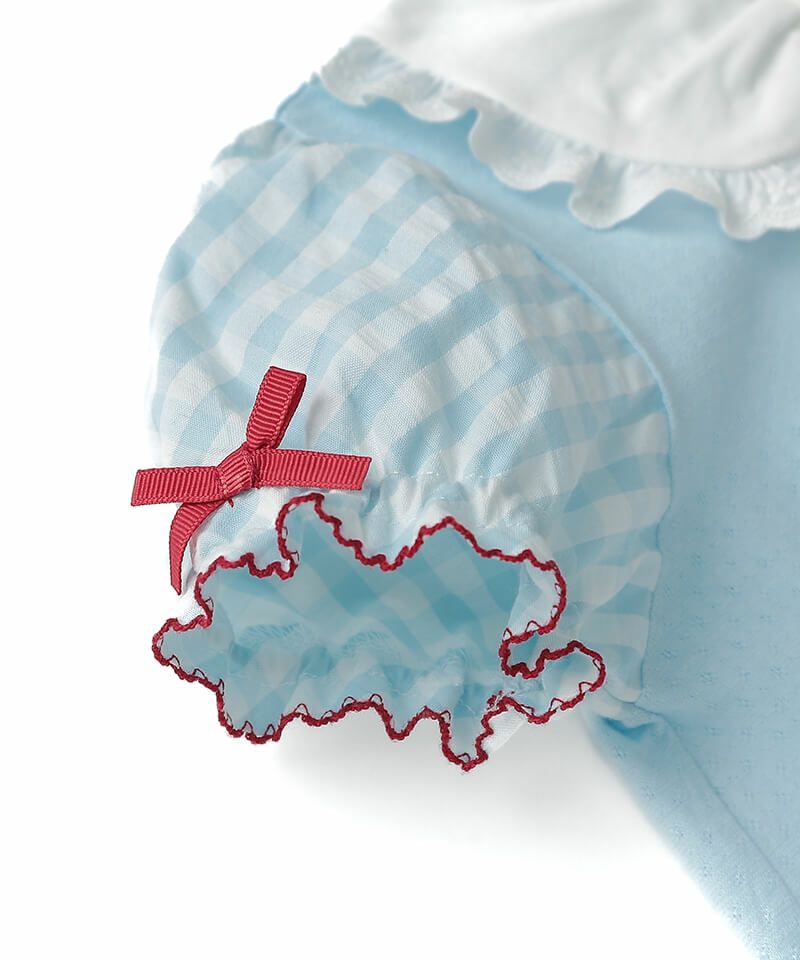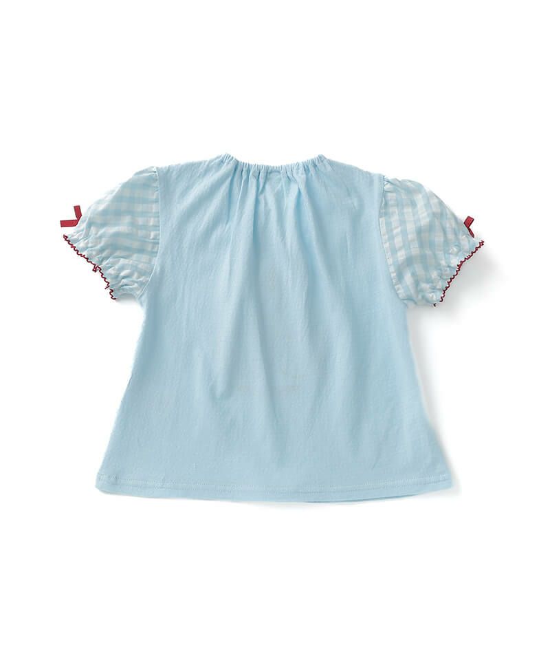 レースをあしらったキュートなリボン襟がお顔周りを華やかにしてくれる半袖Tシャツです。フロントのチェリーアップリケやパフスリーブにギンガムチェックを使用しスイートで女の子らしい雰囲気を演出します。柔らかなメッシュ天竺素材で涼しく着心地も抜群です。後ろネックはゴム仕様で着脱もカンタン。