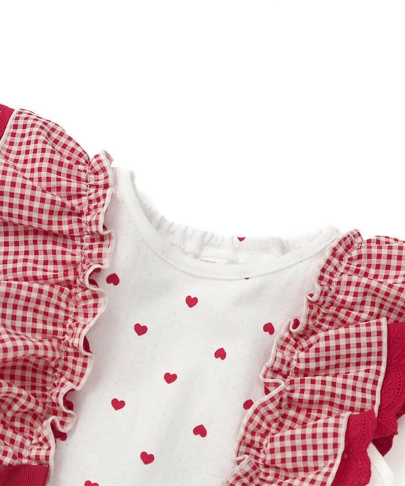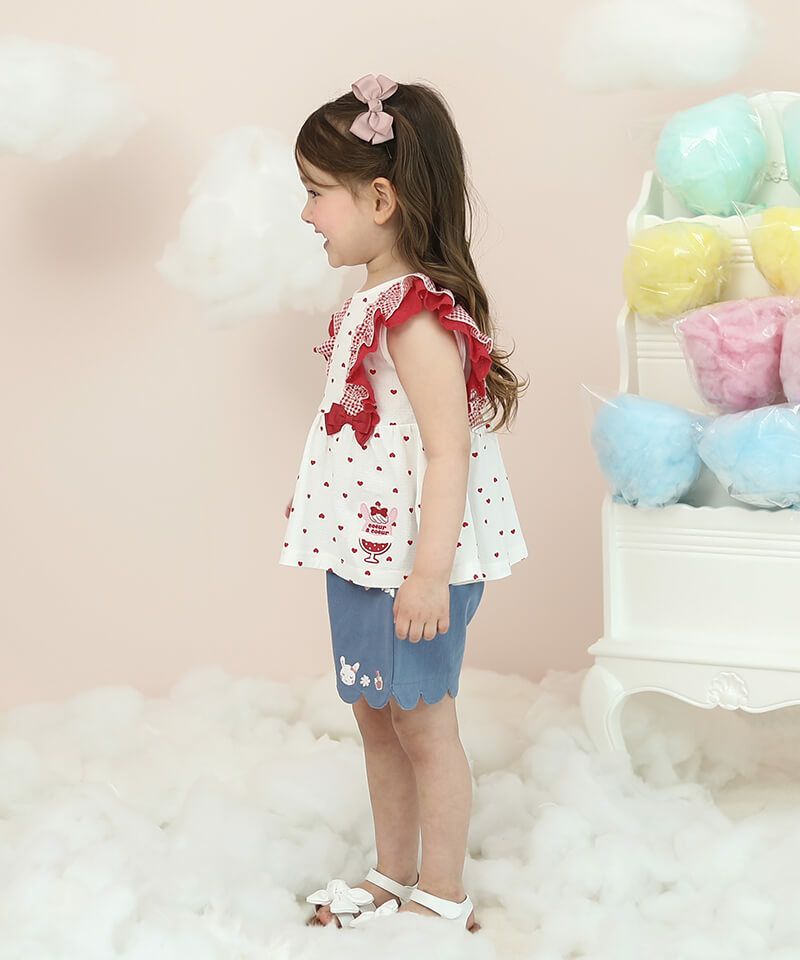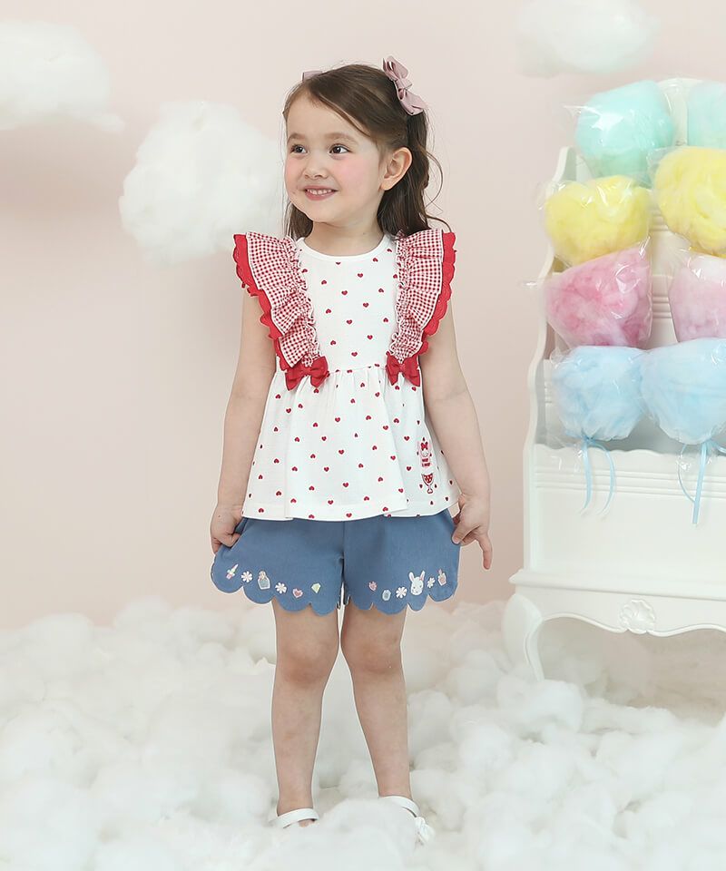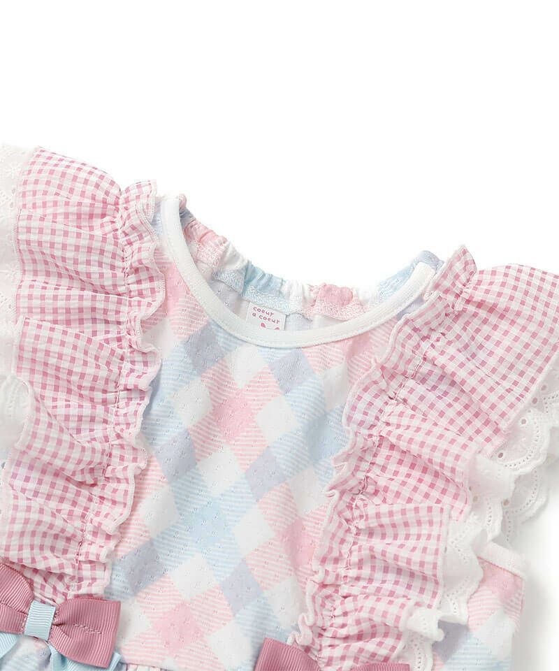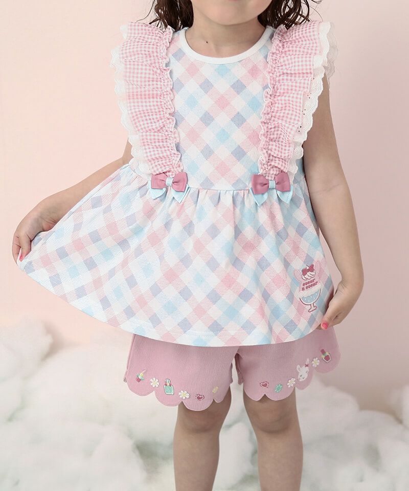 ギンガムチェックフリルにリボンモチーフが可愛いタンクトップ。ギャザーを入れたフレアなシルエットでパンツとの相性ぴったり。涼しげな針抜き天竺は柔らかく優しい肌触りの素材です。チェックとハート柄の2色展開なのでカラーによって違った雰囲気を楽しむことが出来ます。後ろネックはゴム仕様で着脱もスムーズ。