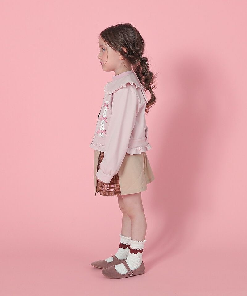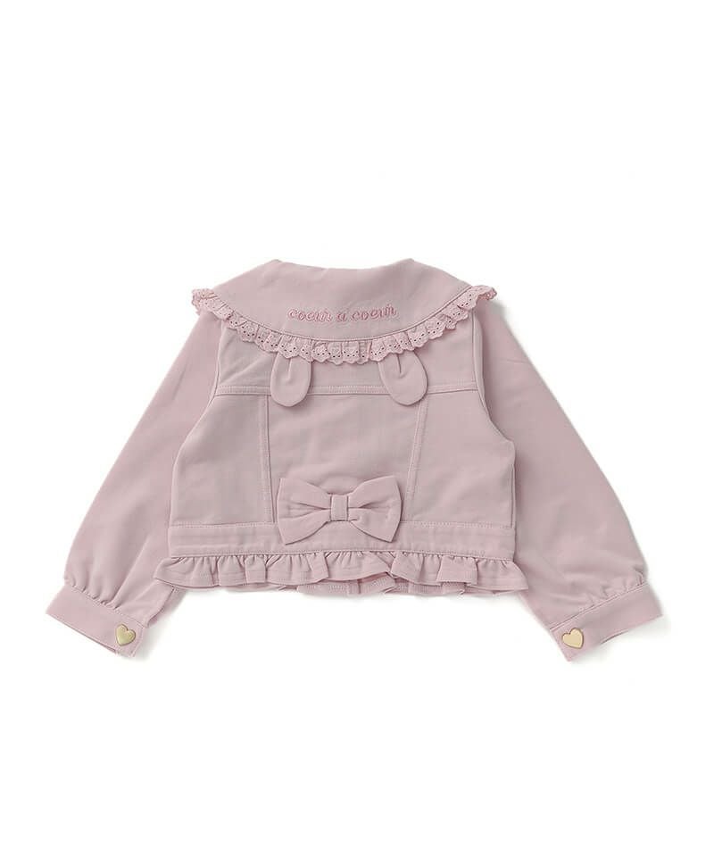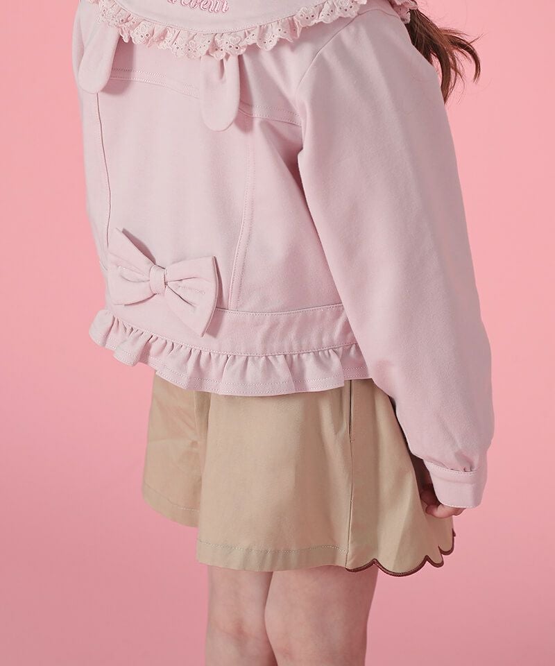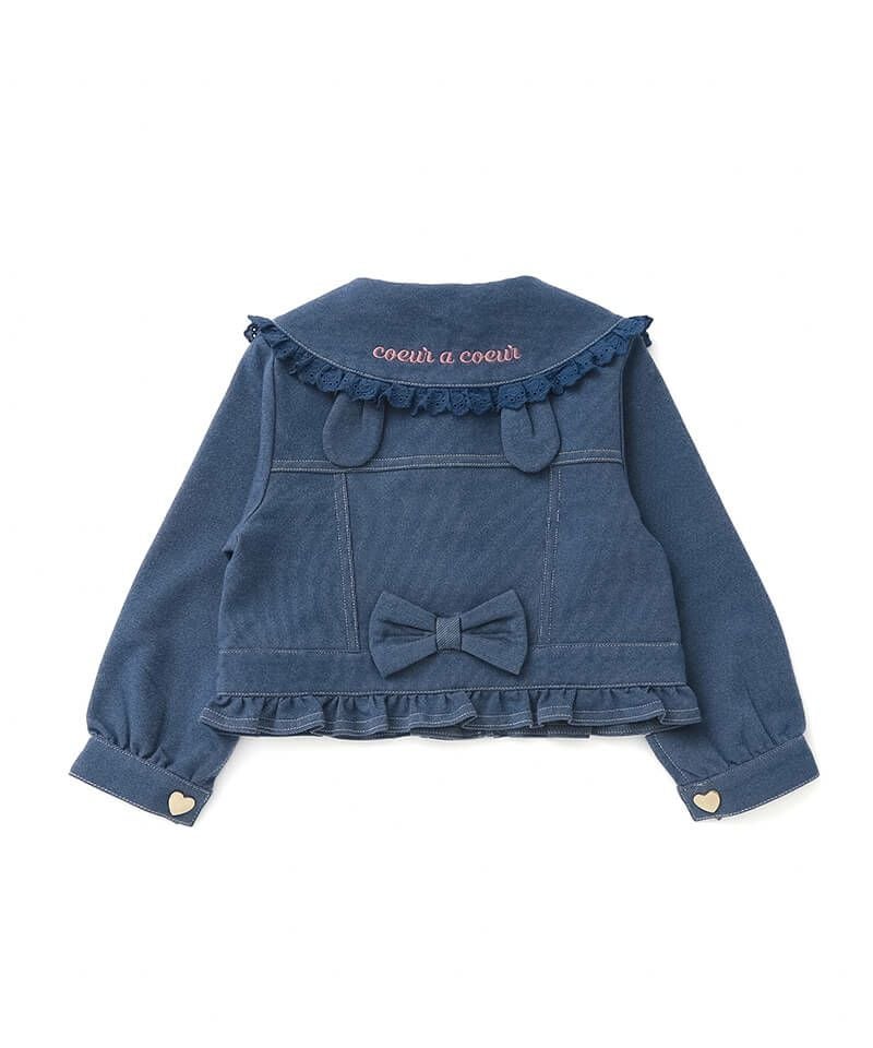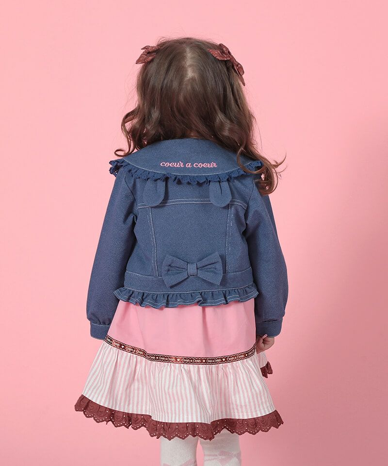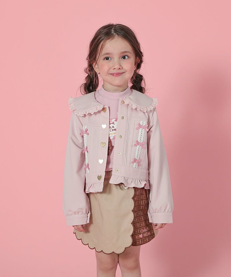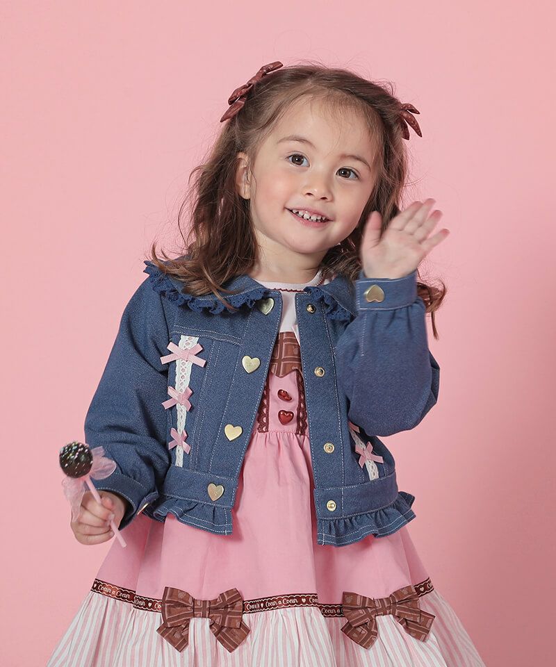 甘さとカジュアルを絶妙にミックスしたデニムジャケット。フロントに並んだレースとリボンにハートのボタンがキュートなポイント。襟のロゴ刺繍やリボンで後ろ姿まで可愛く決まります。ストレッチデニムニット素材で着心地も良く、着るだけでおしゃれ度UP間違いなし♪ワンピースやスカートとの相性も良くおでかけコーデにおすすめです。