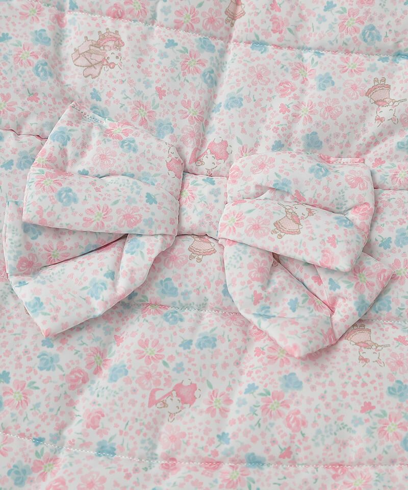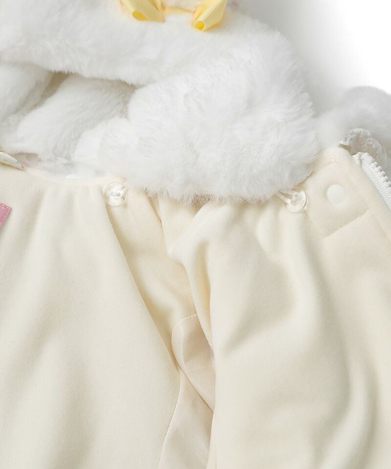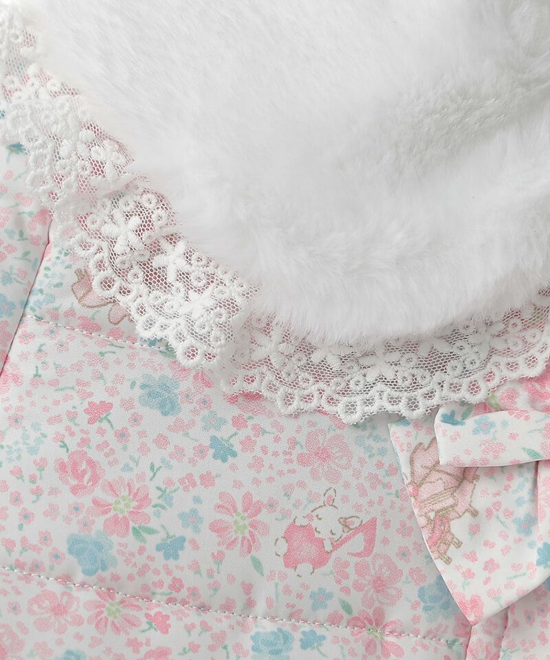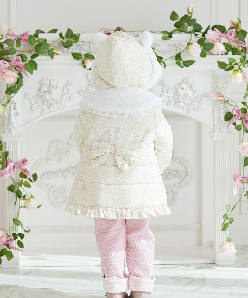 楽器を演奏するうさぎちゃんが散りばめられた小花柄が可愛らしい中綿コート。Aラインシルエットにふわふわフェイクファーのうさぎちゃんアップリケを添えて可愛さたっぷりのデザインに仕上げました。表地のタフタ素材にははっ水加工を施し、裏地はやわらかなフリース仕様であたたかさも抜群。取り外し可能なうさみみ付きフードは気分に合わせて着こなしを楽しめます。両脇には便利なポケット付きでデイリーからお出かけまで活躍するおすすめアウターです。