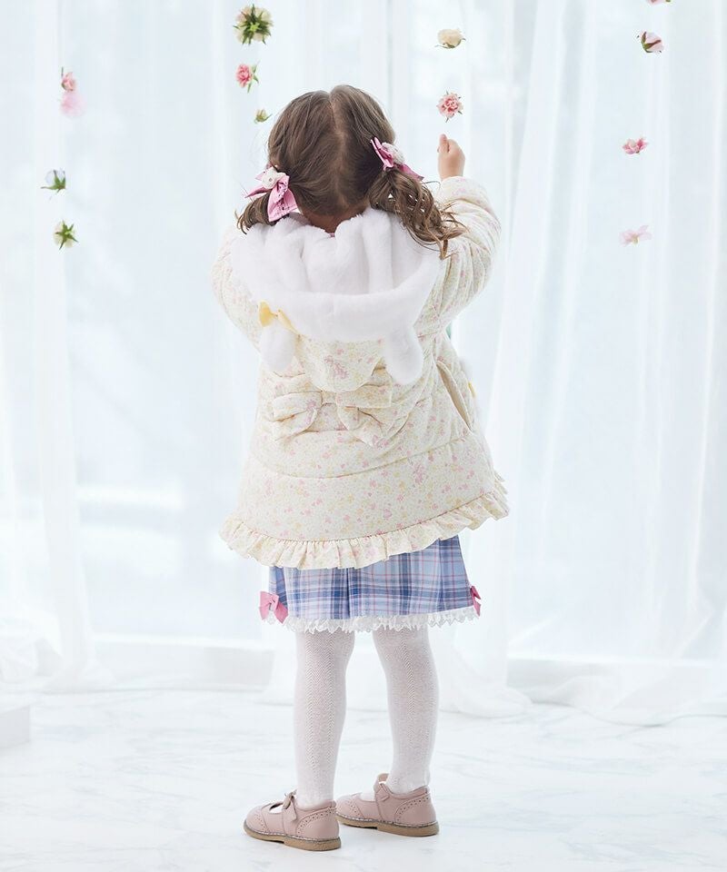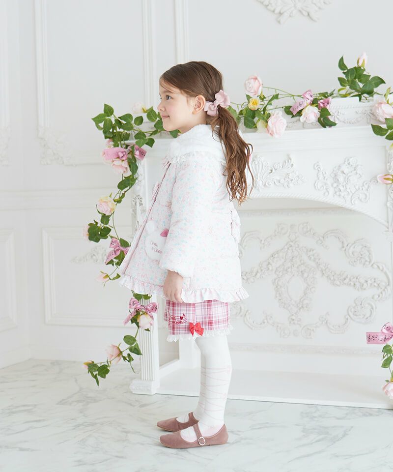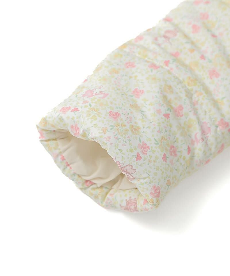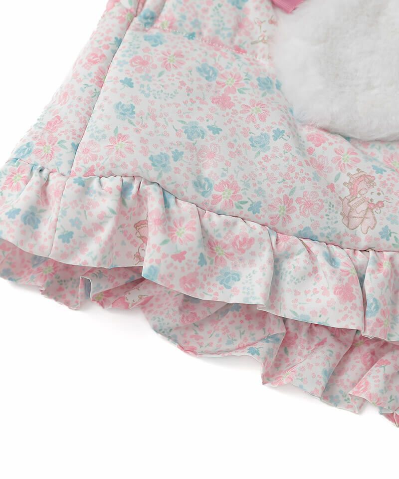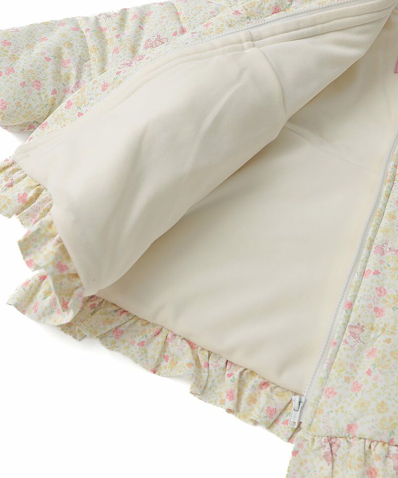 楽器を演奏するうさぎちゃんが散りばめられた小花柄が可愛らしい中綿コート。Aラインシルエットにふわふわフェイクファーのうさぎちゃんアップリケを添えて可愛さたっぷりのデザインに仕上げました。表地のタフタ素材にははっ水加工を施し、裏地はやわらかなフリース仕様であたたかさも抜群。取り外し可能なうさみみ付きフードは気分に合わせて着こなしを楽しめます。両脇には便利なポケット付きでデイリーからお出かけまで活躍するおすすめアウターです。