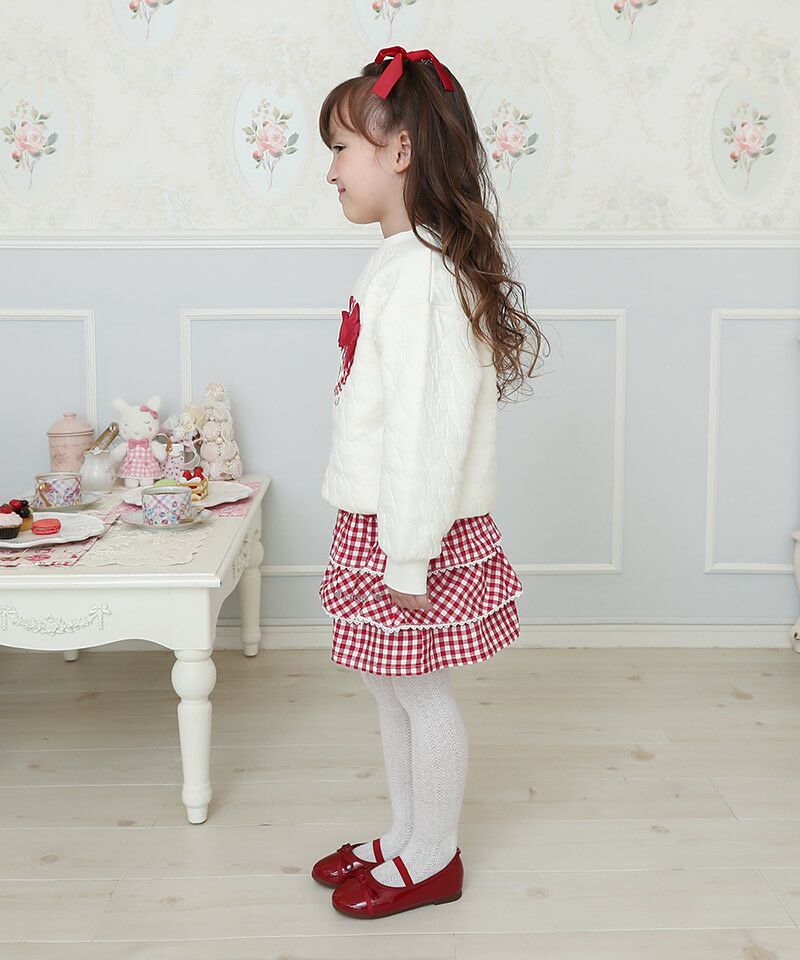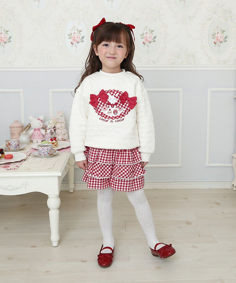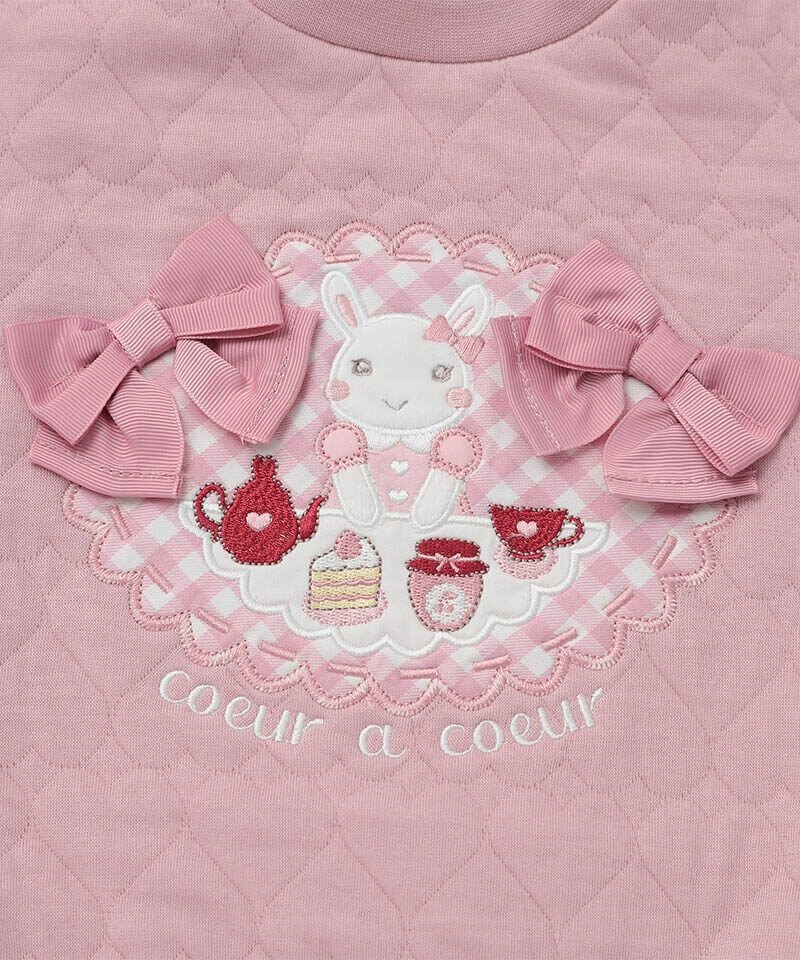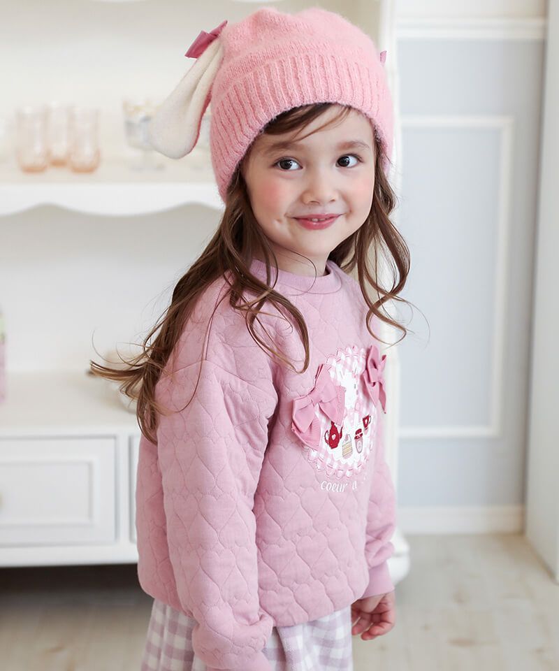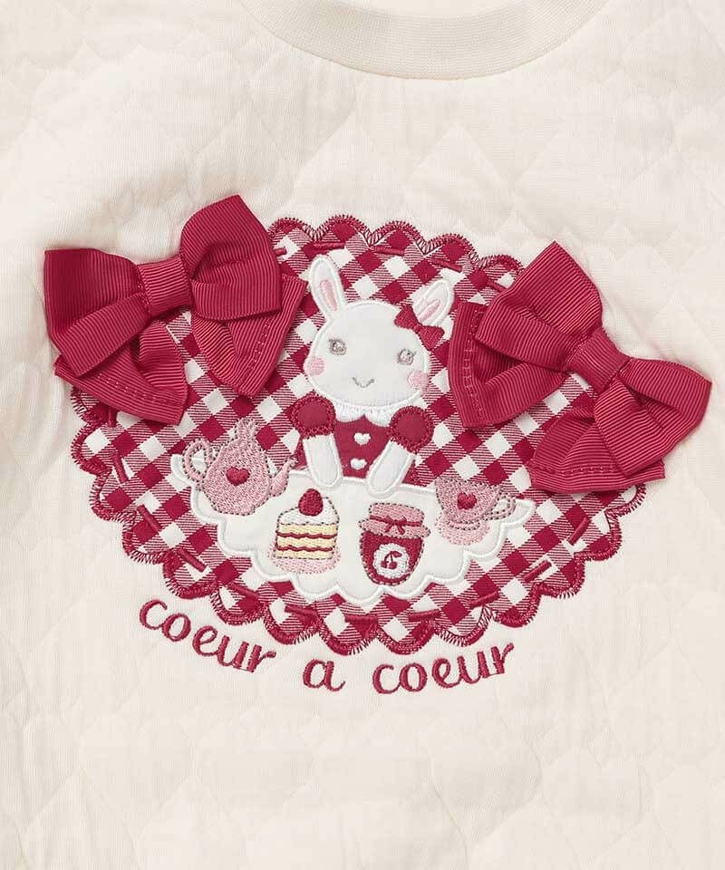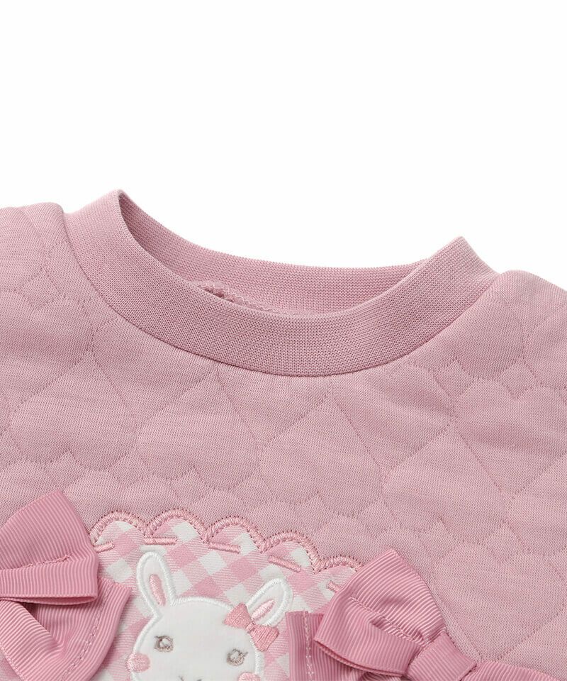 ハートのニットキルトが暖かく、ふんわり柔らかな肌触りのトレーナー。ティータイム中のうさぎちゃんアップリケがとってもラブリーです。アクセントに飾ったリボンもチャーミング♪コーディネートしやすい丈感なので、パンツでもスカートでも相性良く着まわせます。寒い日のデイリースタイルにぴったり。