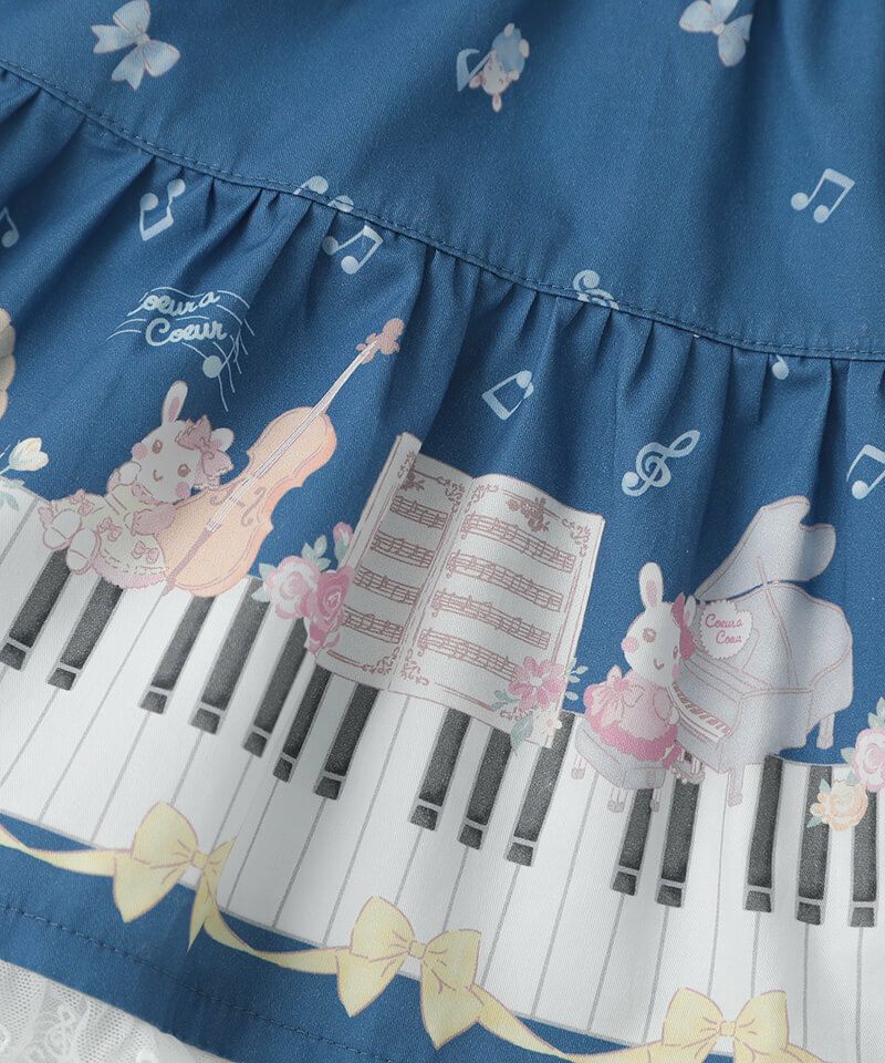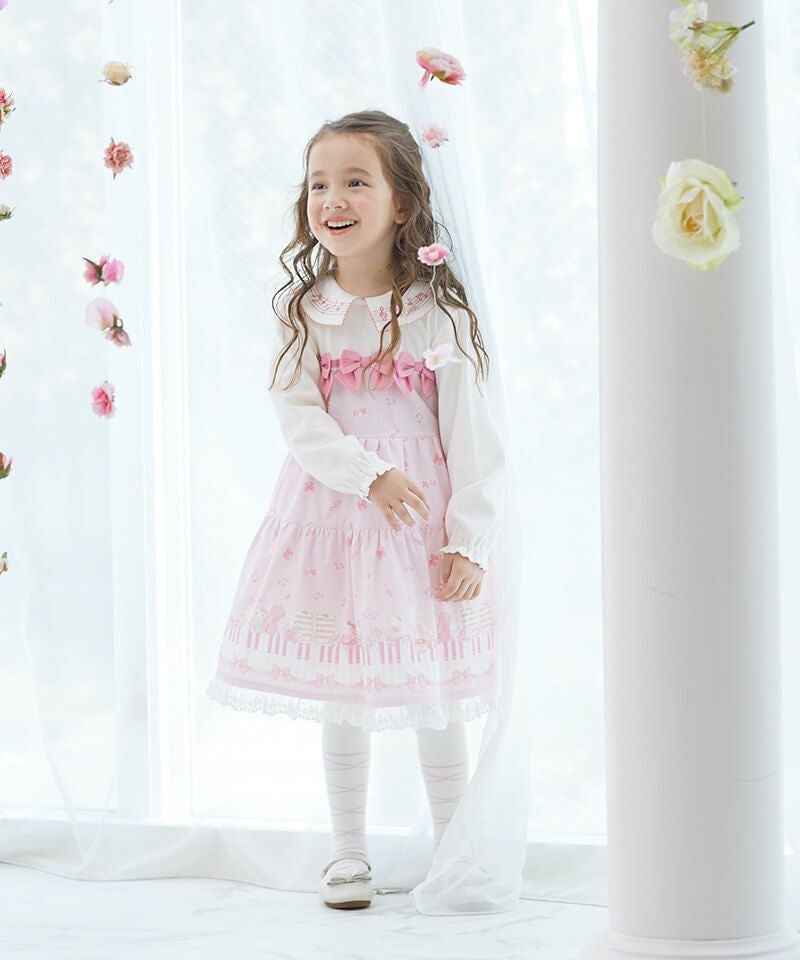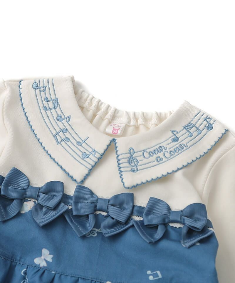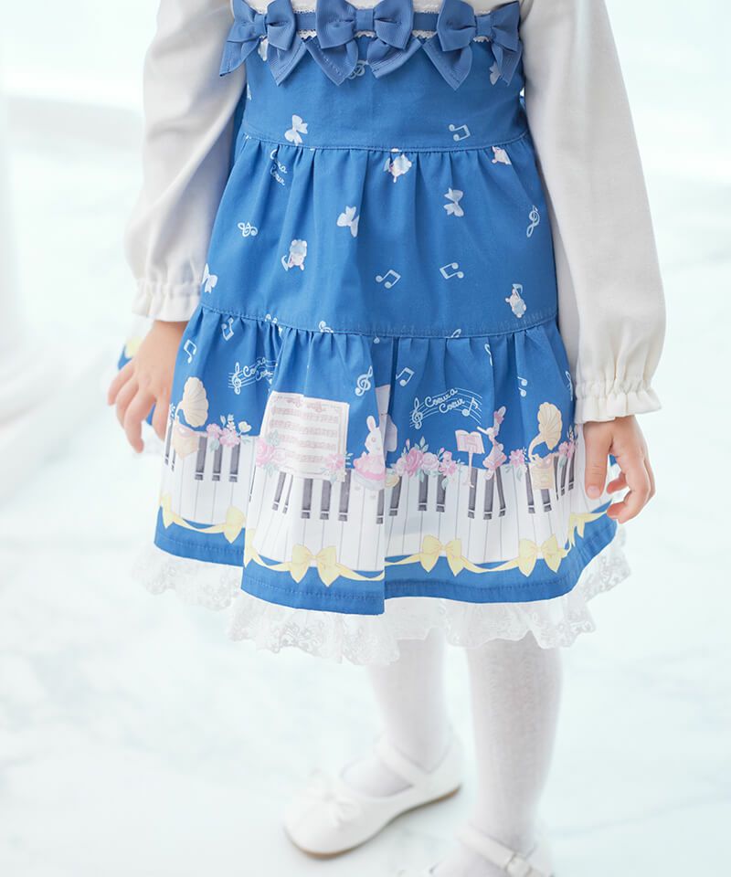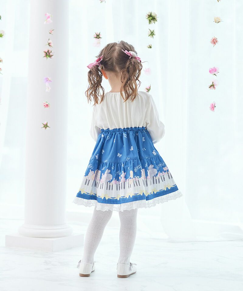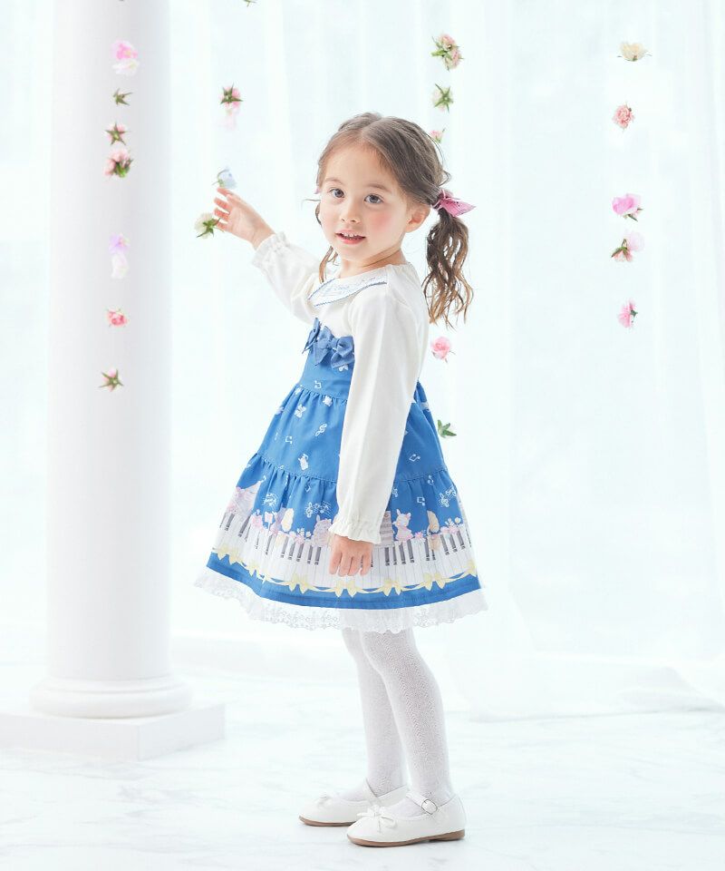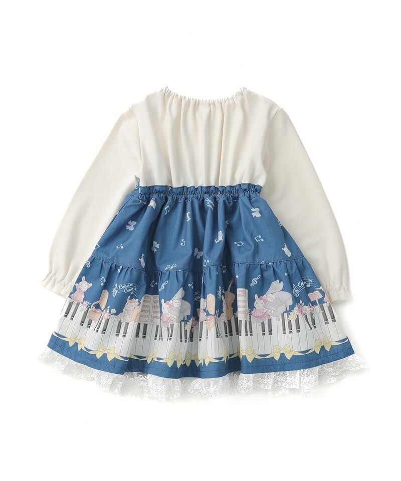 裾いっぱいに広がるピアノの鍵盤や楽器とうさぎちゃんのプリントがとっても華やかなドッキングワンピースです♪軽やかなメロディーが流れてきそうな襟刺繍のブラウスをレイヤードしたようなデザインは、1枚でおしゃれに決まるのが嬉しいポイント。後ろネックはゴム仕様でお着替えもカンタンです。きちんと見えする上品な雰囲気が発表会やお出かけの日にもぴったりで特別感あふれるおすすめワンピースです。ベビーロンパース(44451-254-)との姉妹リンクコーデもできちゃいます。