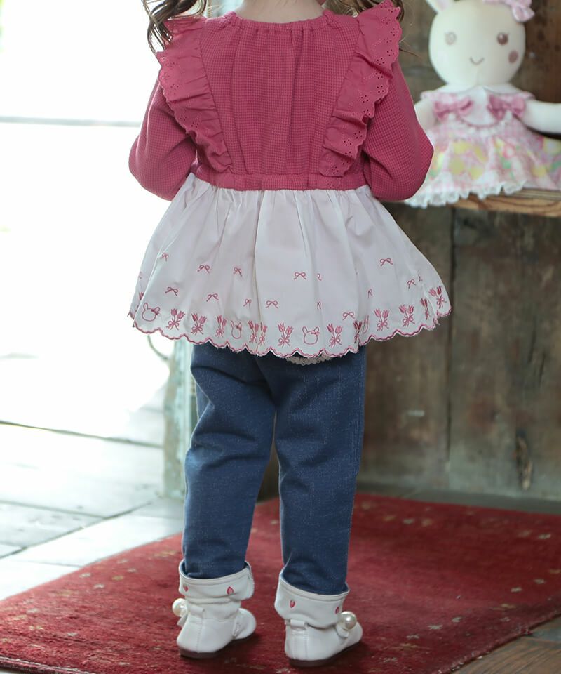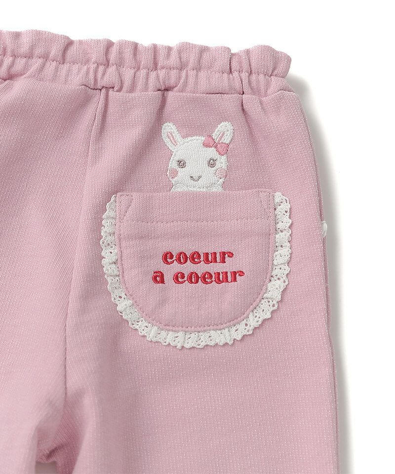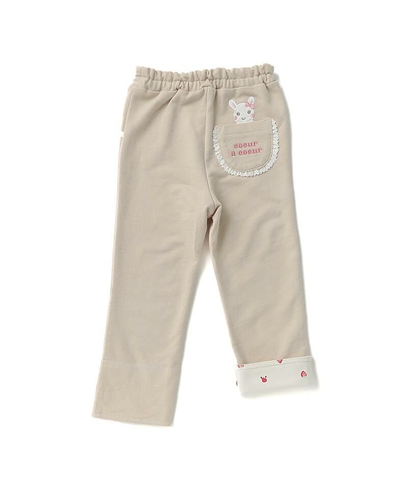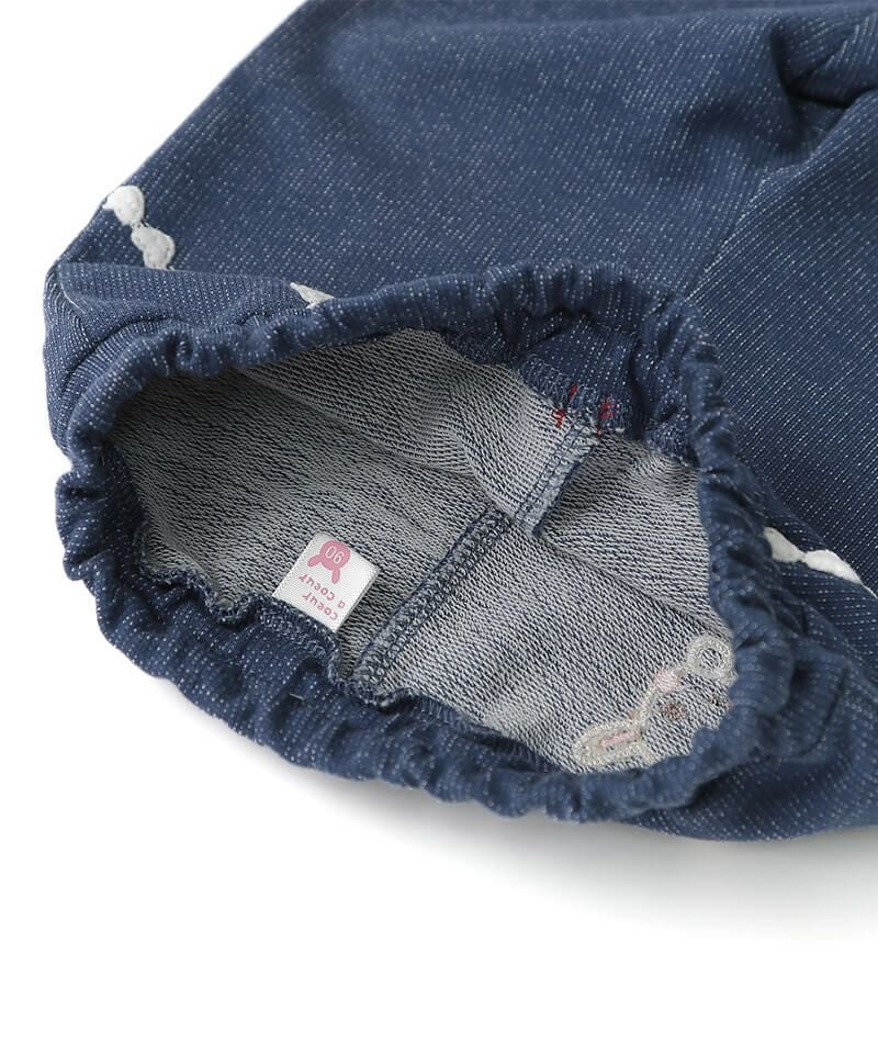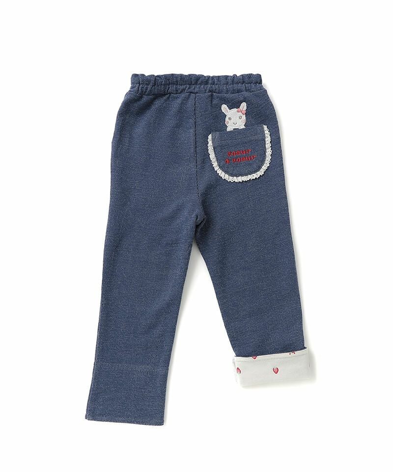柔らかくて快適な履き心地のコットン100%デニムニット素材を使用したロングパンツ。後ろポケットからひょっこり顔を出すうさぎちゃんのアップリケ刺繍がとってもキュートです。ロールアップしていちご柄を見せれば、足元まで可愛くおしゃれに決まります。デイリーコーデにぴったりの一枚です。