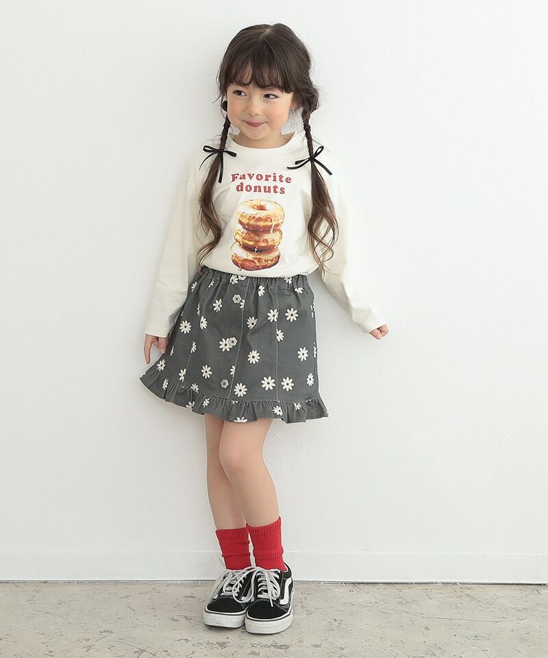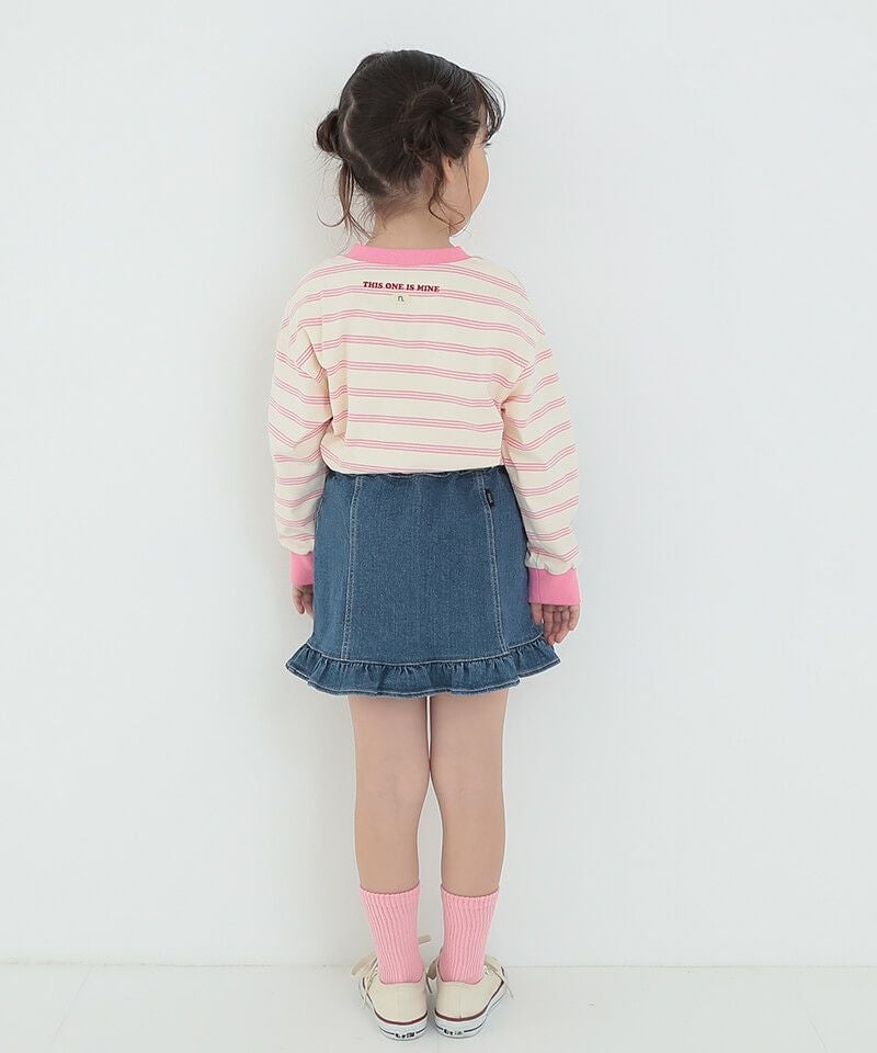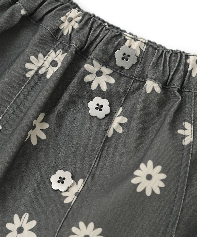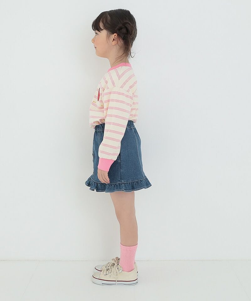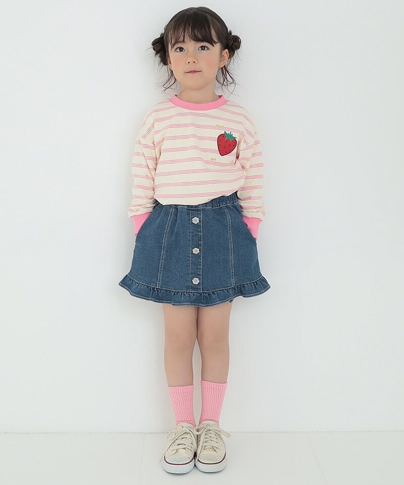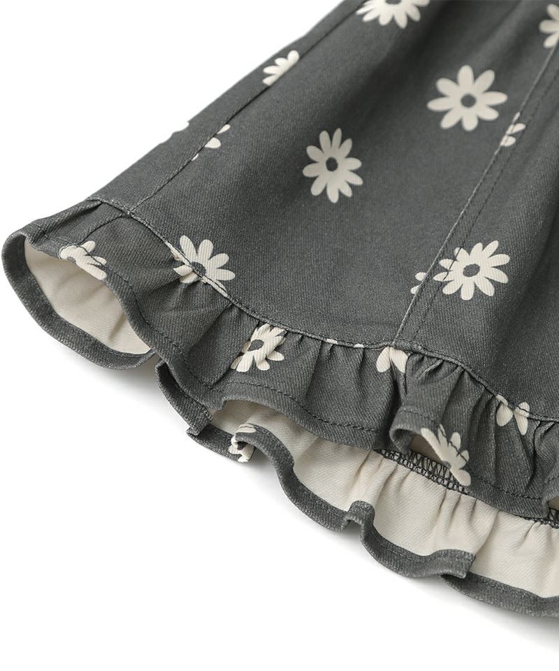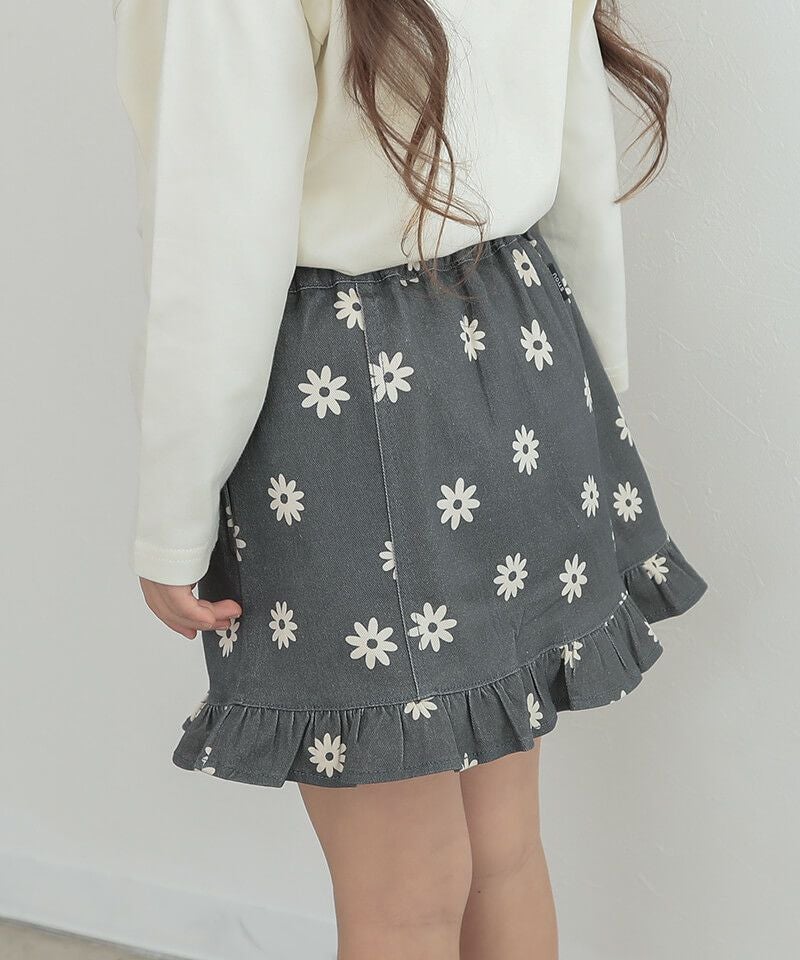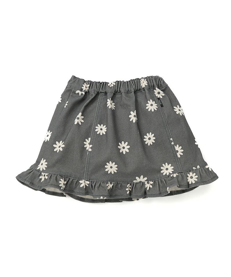 プチフリルがレトロ可愛いAラインミニスカート♪程よい丈感と広がりすぎないAラインがこなれ感とコーディネート幅を広げるポイントです♪シルバーのお花釦が可愛らしさにちょっぴりお姉さんなムードも添えてくれるポイントに♪鉄板のブルーデニムと、色落ち感あるこなれたブラックの展開です☆
