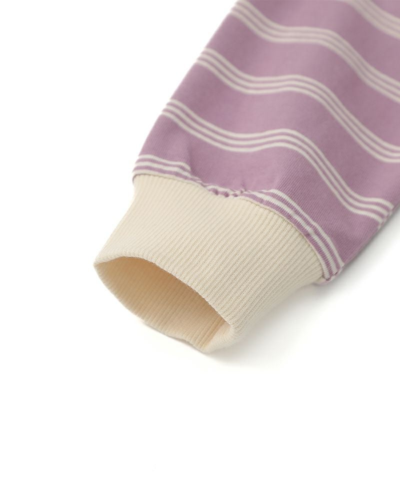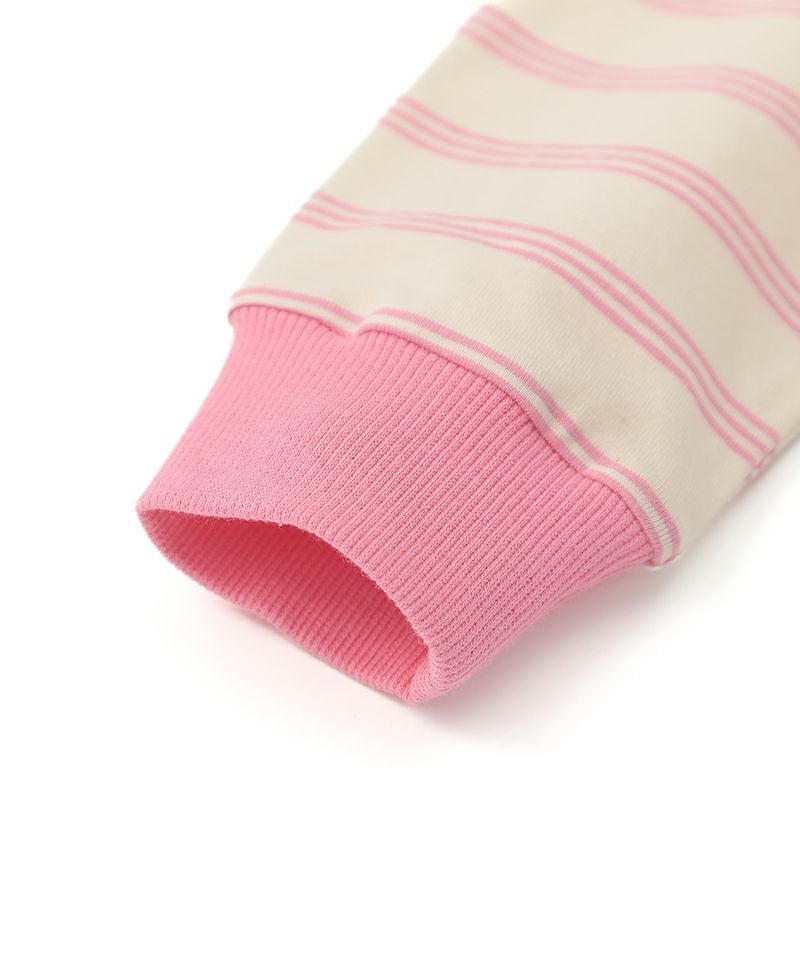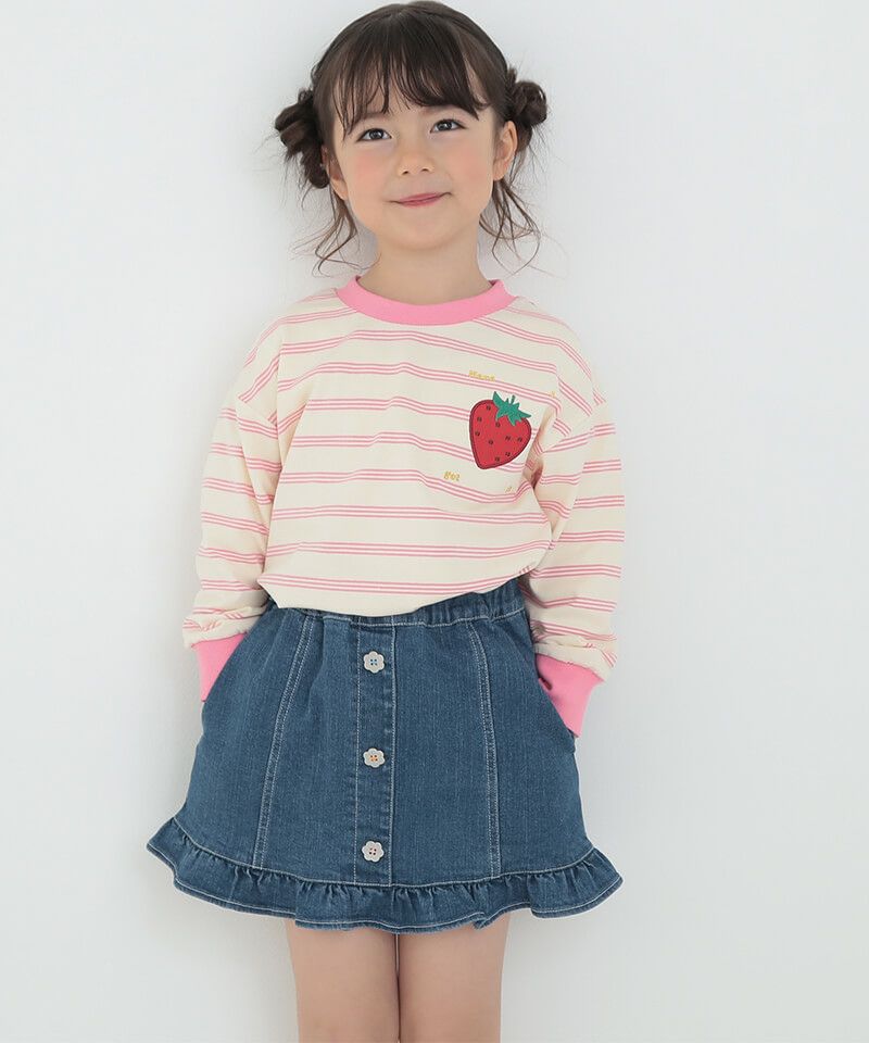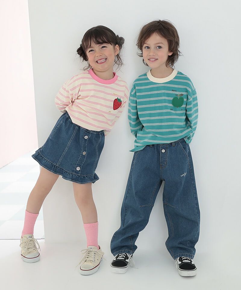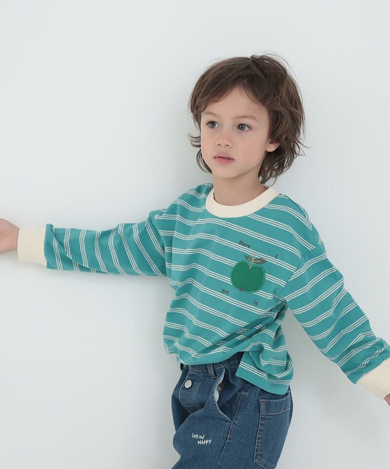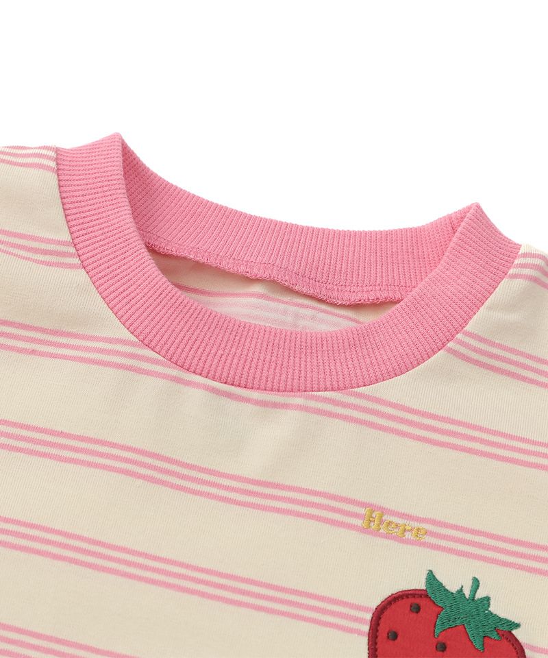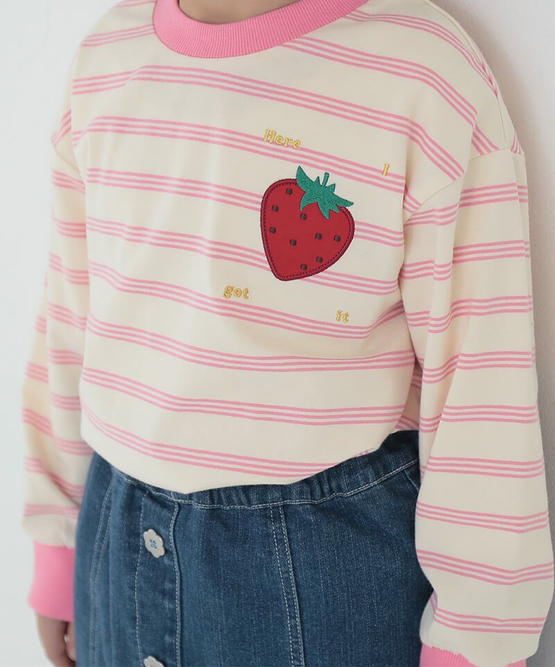 フルーツモチーフのキッズらしい可愛さがありながらも、ボーダーの柄感やシルエットは大人デザイン!!サテンのアップリケ刺繍がひと味違うワンポイントです♪程よい肉厚で伸縮性と柔らかさを持つお素材でシルエットもとっても綺麗なアイテムです。